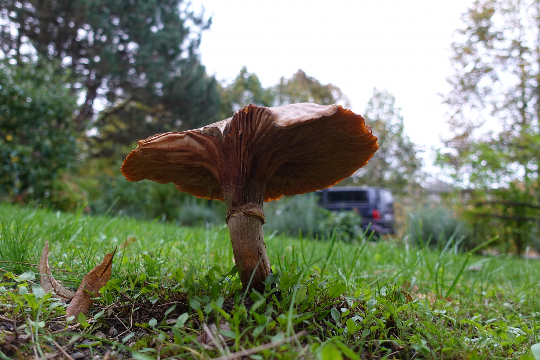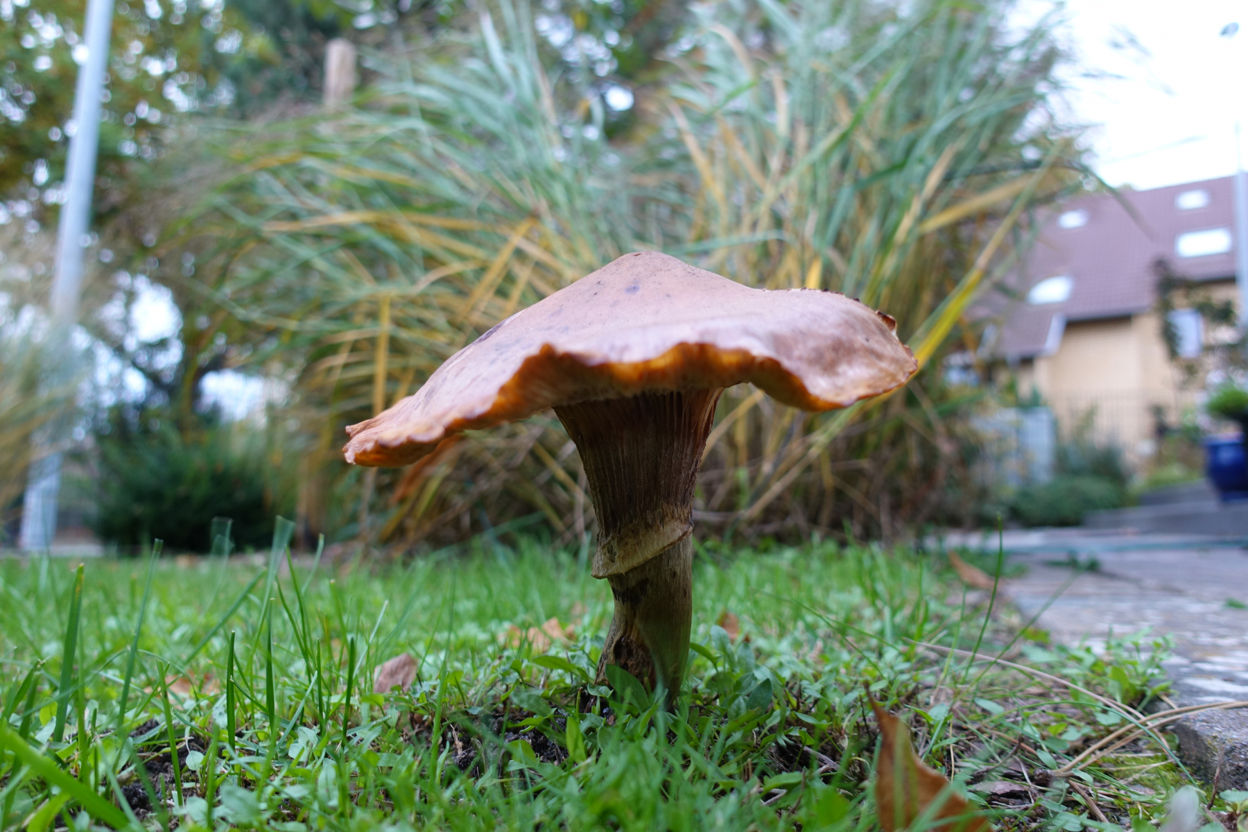 So wie er dasteht, könnte es eine Art Schirmling sein, aber mit dieser Farbe, Größe und herablaufenden Lamellen bin ich bei meiner Suche im Pilzbuch nicht fündig geworden.