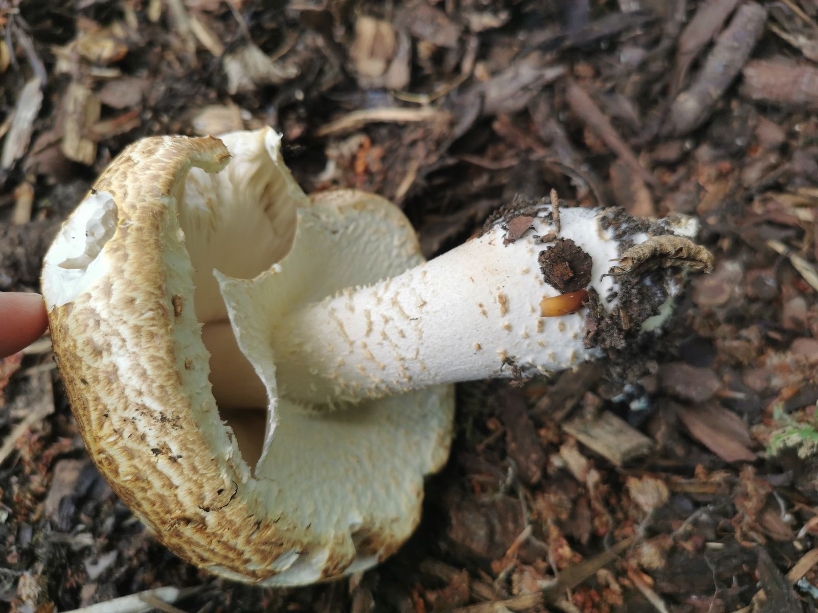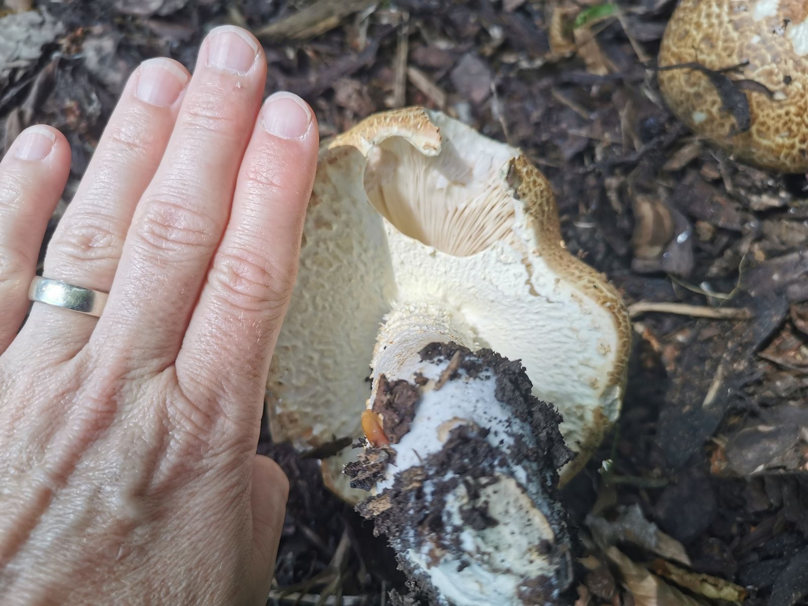 ich habe auf 550hm im. Fichtenwald, der vollkommen Perpilz belagert war, folgenden weißhütigen Amanita-Vertreter gefunden. Der Hut wirkt auf dem Bild rötlich aber die Hüte waren tatsächlich eher weißlich. Der Ring war eindeutig gerieft und klebte am Stiel und war glänzend(ich kann es selbst kaum glauben Aber so war es) Geruch eher pilzig, Fraßgänge unten rötlich was klar auf Perpilz Variation schließen lassen würde, aber die Knolle war gerandet. Ich bin ratlos. Habt ihr eine Idee? Ich gehe vonPerlpilz aus, aber irgendwie sah er irritierend anders aus.