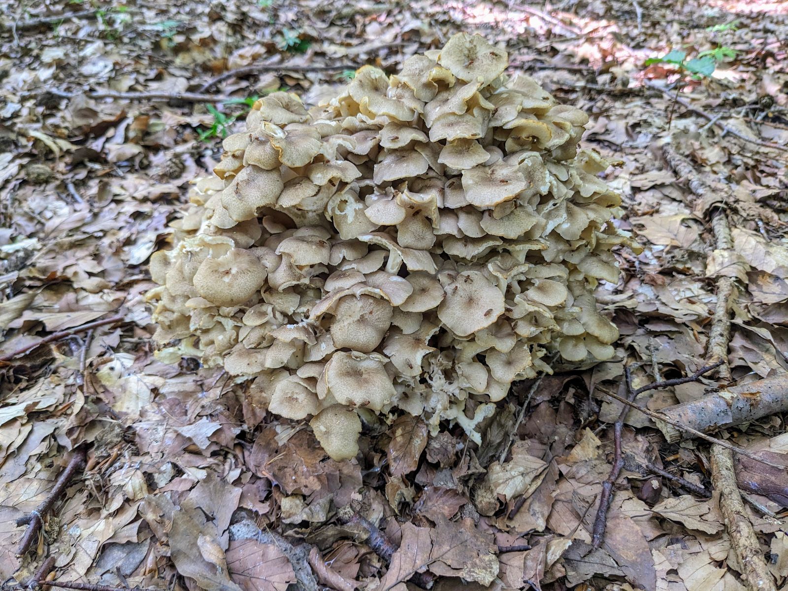Da wir mit Babies und Hunden unterwegs waren, reichte es nur für Schnappschüsse von oben, aber ein wenig erkennt man. Ich vermute Omphalotus illudens, kann das sein? Der wäre ja sehr selten (Nordhessen), aber Alternativen sehe ich gerade nicht so recht... Was meint ihr?