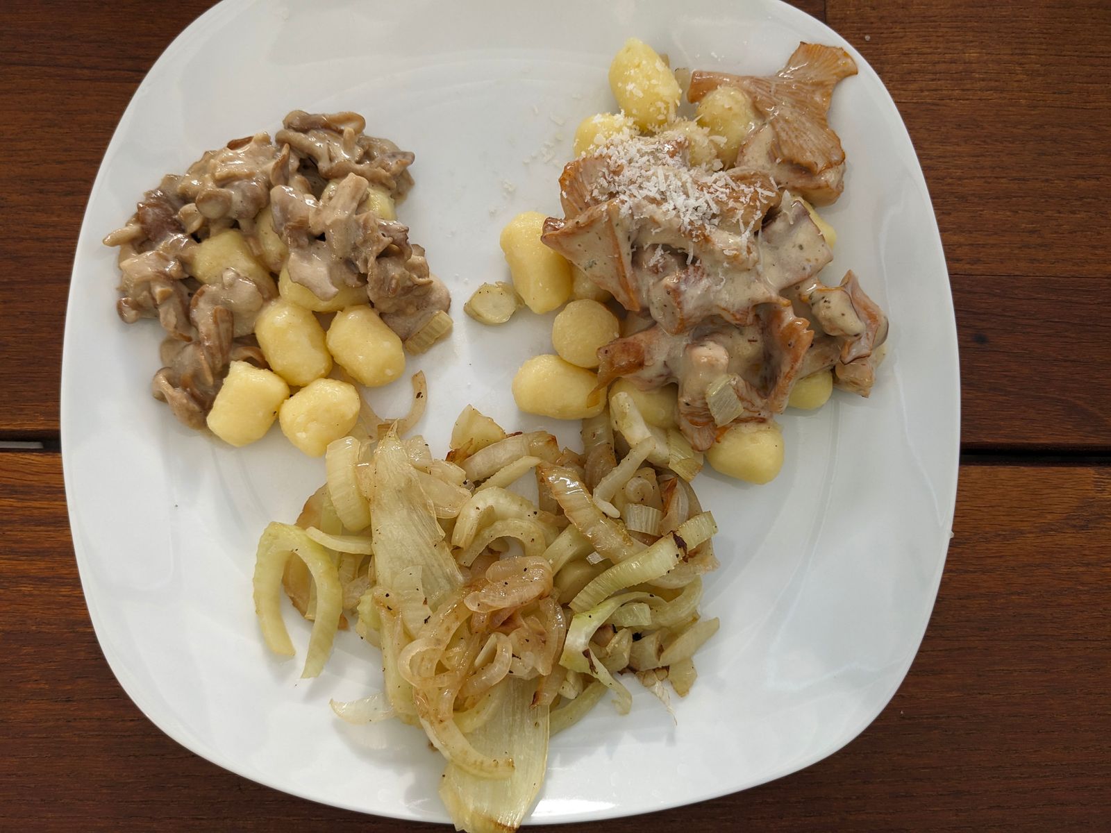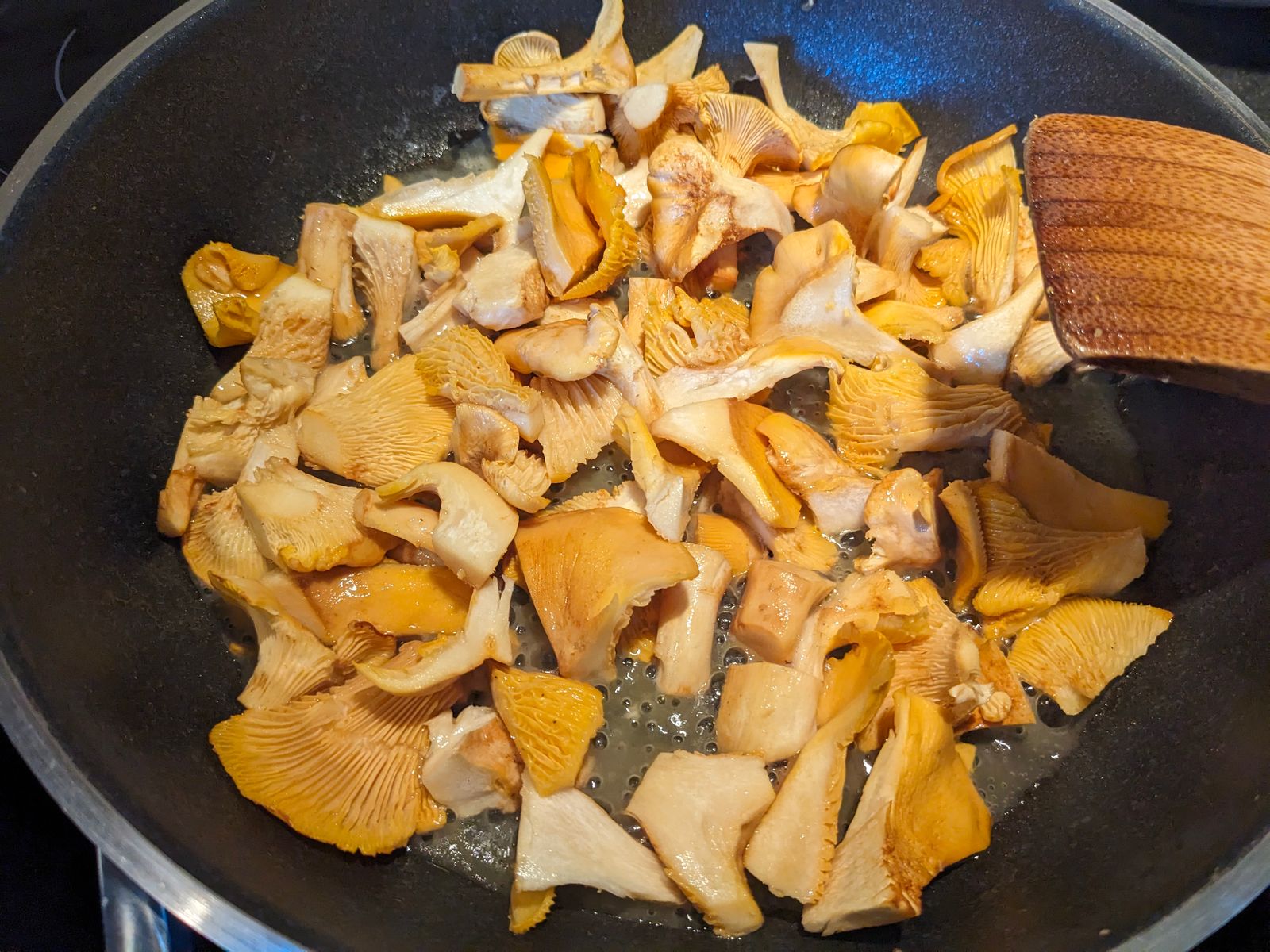 So. Vielleicht mal wieder ein bisschen übervorsichtig, aber ich habe die Köpfe mit den braunen Rändern aussortiert und den Rest mit Butter in die Pfanne geworfen. Nur Salz und Pfeffer dran und mit etwas Sahne abgelöscht. Herrlich! Sooo lecker! Zum Glück war die Hauptpfanne voll mit Pfifferlingen, die konnten einigermaßen mithalten, aber ich glaube, Steinpilze hätten im Vergleich nach nichts geschmeckt 😅