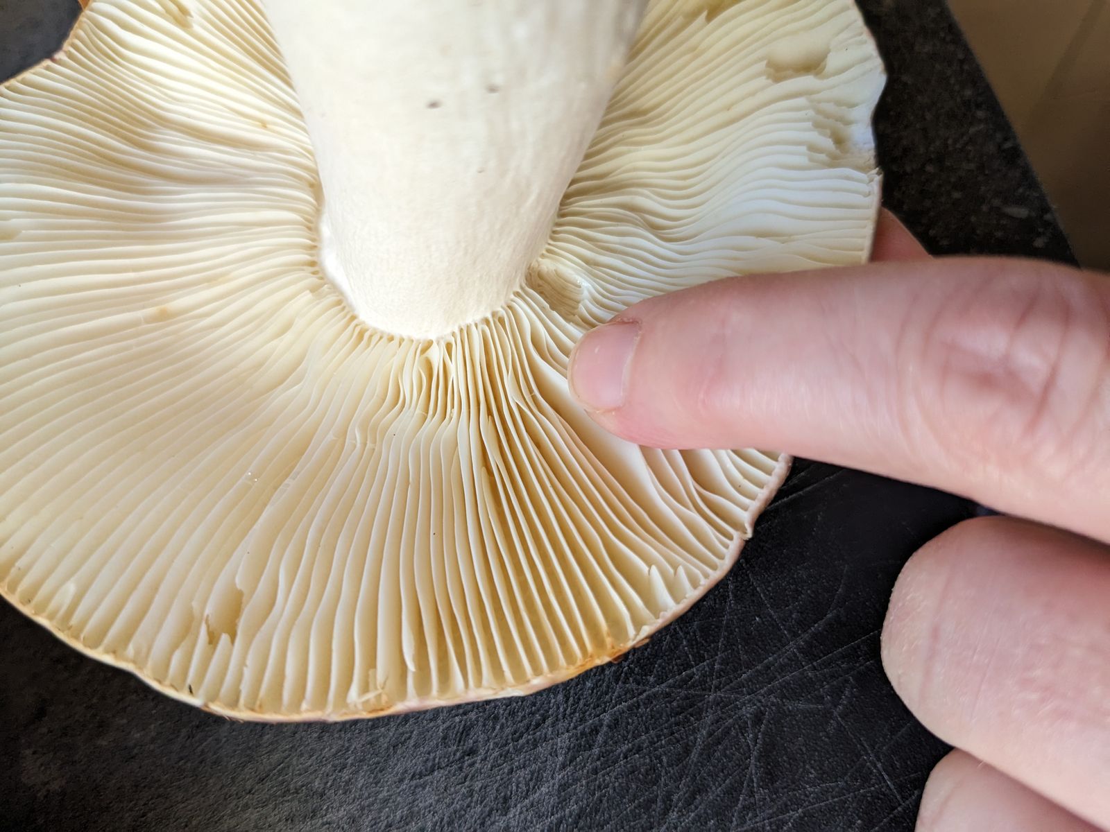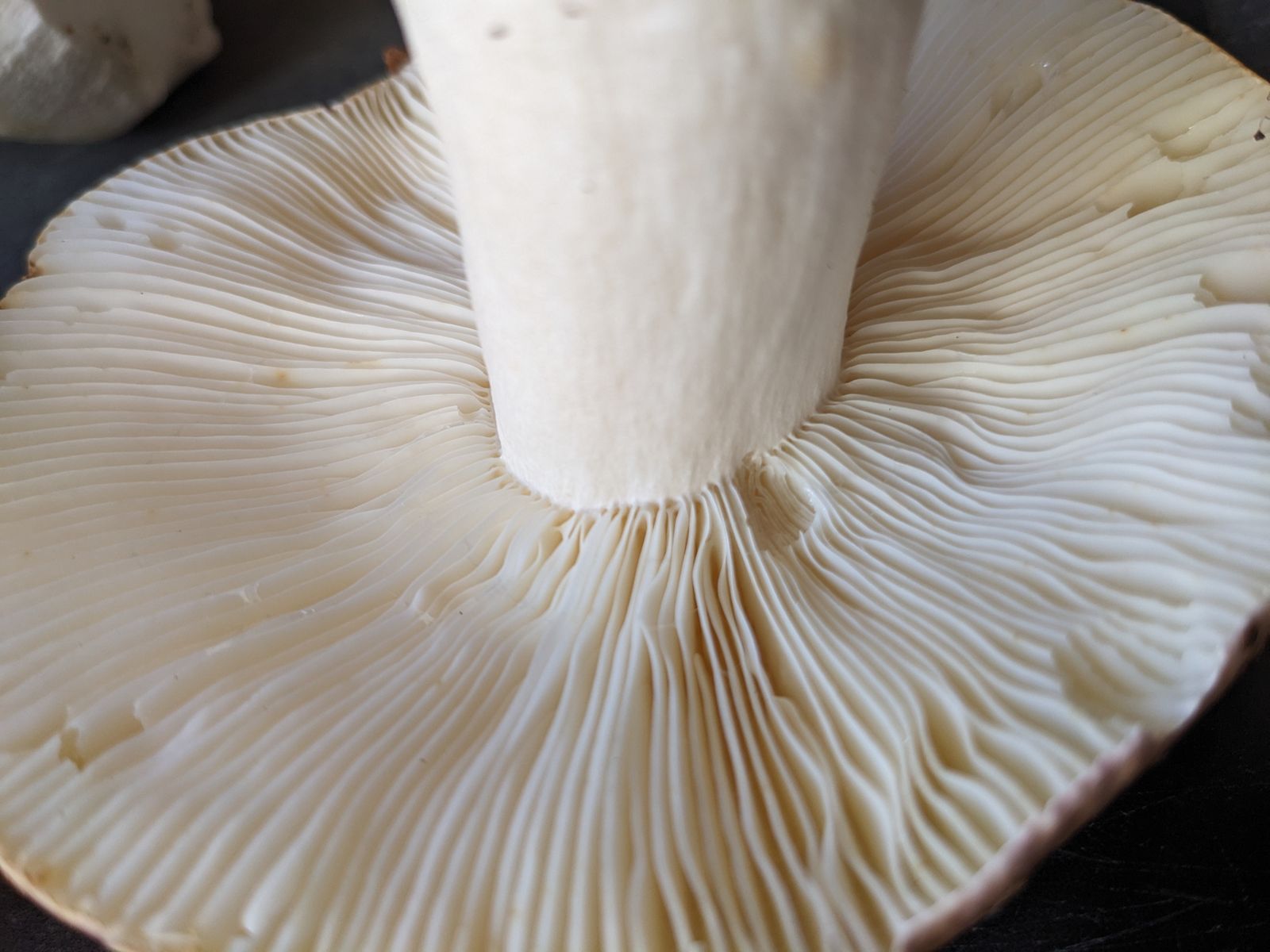 Die Lamellen sind rostbraun, Velumreste minimal am Hutrand noch vorhanden. Leider blieb die Basis im Boden und ich habe sie nicht herausgeholt, ebenso wenig kann ich etwas zum Geruch sagen. Der Stiel scheint mir aber auffällig lang zu sein.