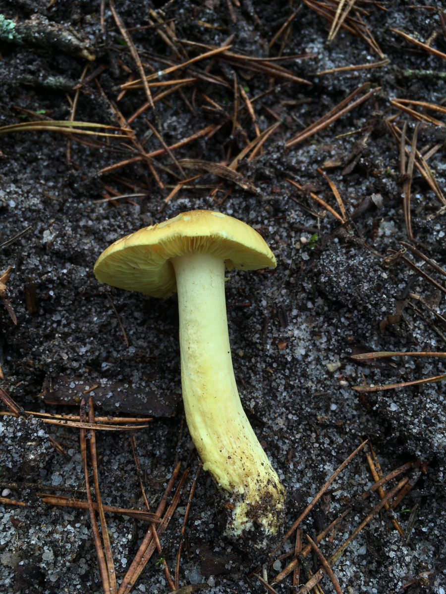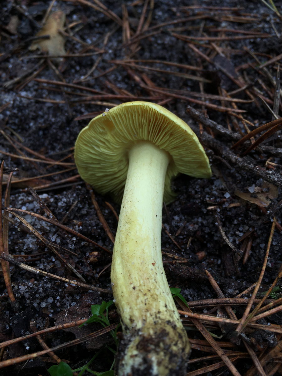 6) ein paar Meter weiter. Geruch leicht mehlig. Hut jung beige/sandfarben, alt etwas schuppig grünlich. Lamellen schwefelgelb, deutlicher als auf dem Foto. Stiel im Schnitt weiss. Irgendwie für mich kein typischer Grünling (Tricholoma equestre) evtl Tr. auratum?