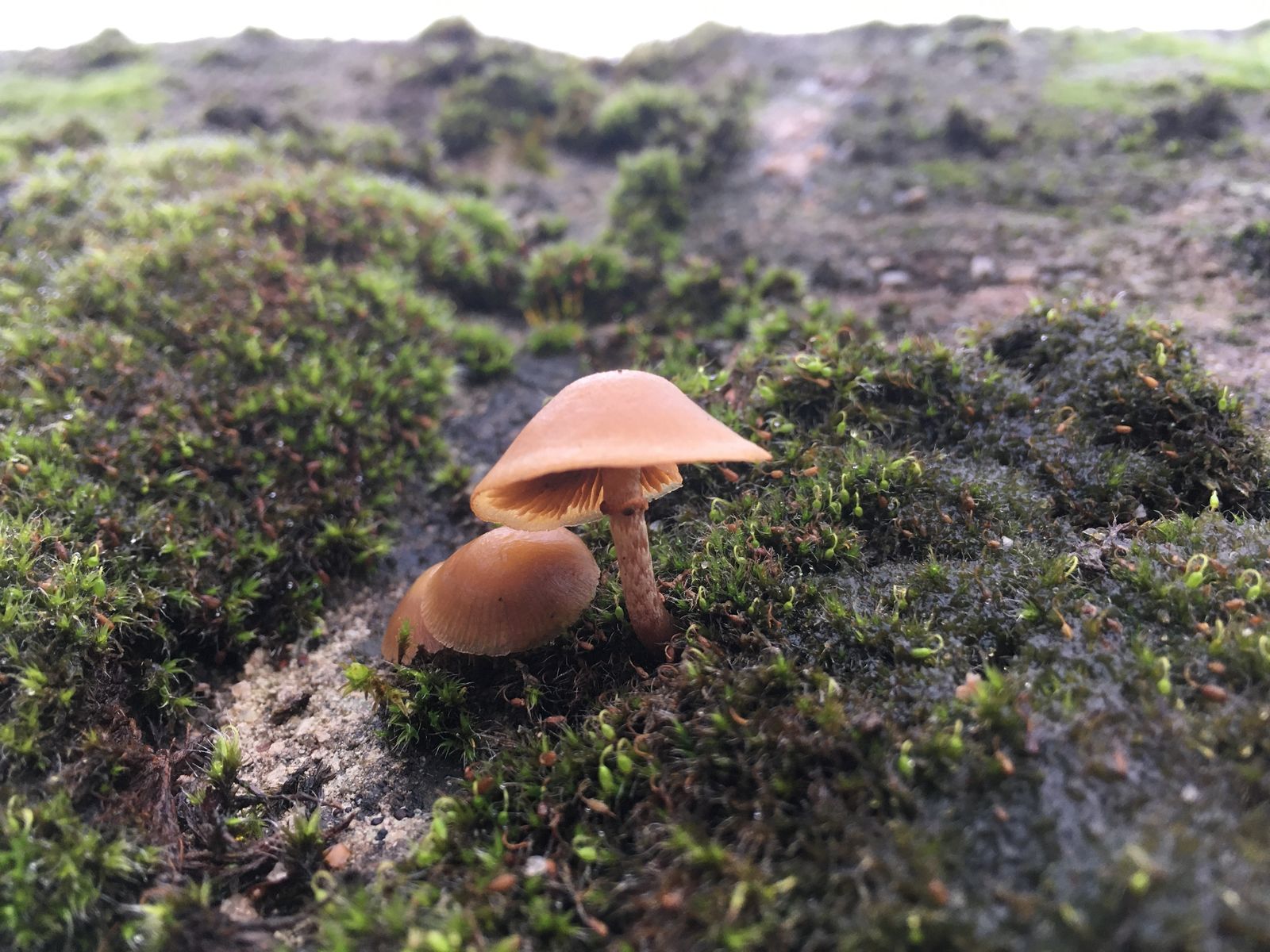 Hier bin ich ein paar Tage später nochmal hin- ich habe mich noch nie näher mit Rickenellas beschäftigt, aber es kam mir eigenartig vor, dass die kleinhütigen (vielleicht bis 3mm) die ich aus dem Frauenhaarmoos im Wald kenne die Gleichen sein sollen wie diese großen (mit locker 10-15mm) aus dem Offenland, die fast schon an Hygrocybe cantharellus erinnern.