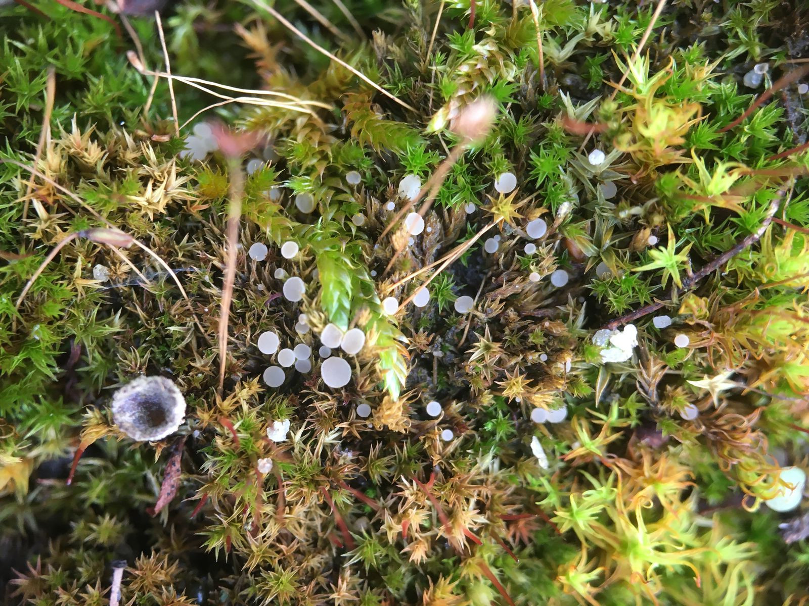 Winterstielboviste lugen gerade eben aus dem dicken Dachdrehzahmoos, sodass sie fast ungestielt erscheinen.