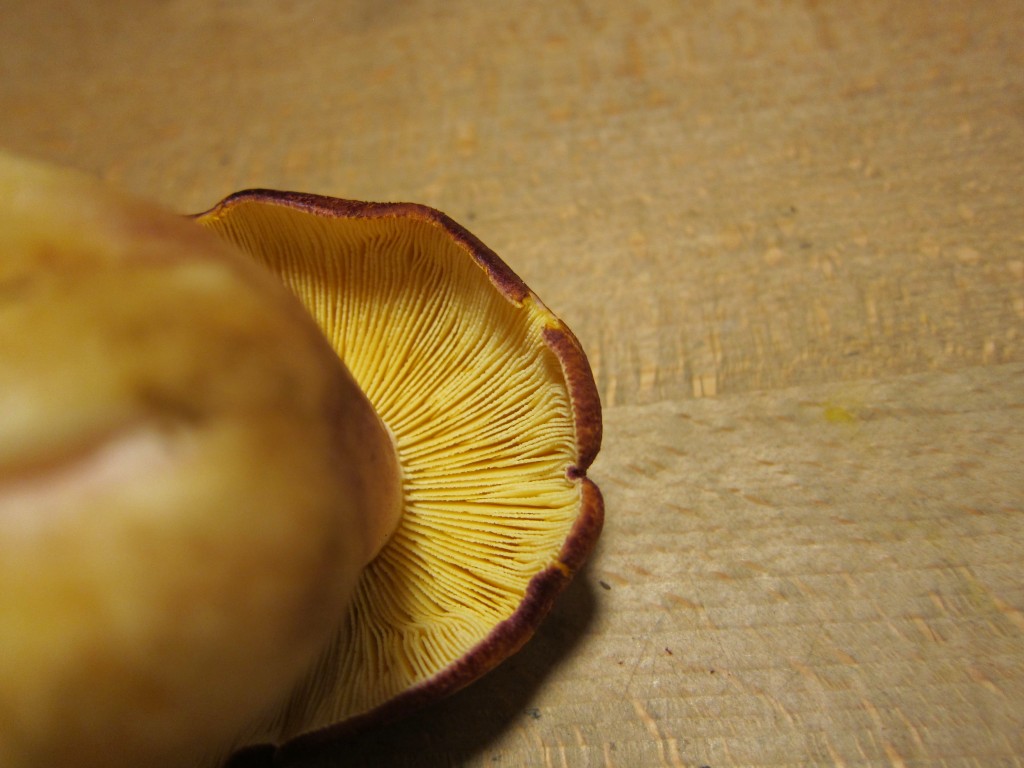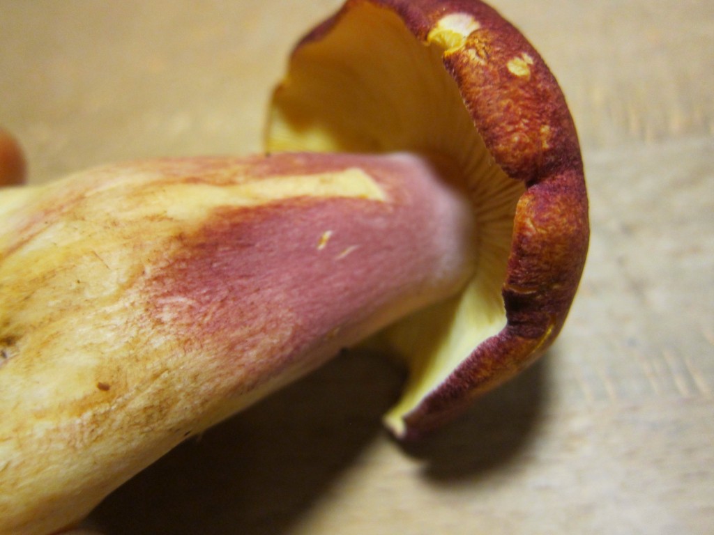 Hut ca. 8 cm, dunkel bräunlichrot, unter der Haut gelb. Lamellen gelb mit Zwischenlamellen, Fuß breit wie Steinpilz, gelblicher Grund und rot geflammt ähnlich wie Rotfußröhrling. Hut und Fuß fest wie Steinpilze. Geruch "pilzig", angenehm, Geschmack mild.