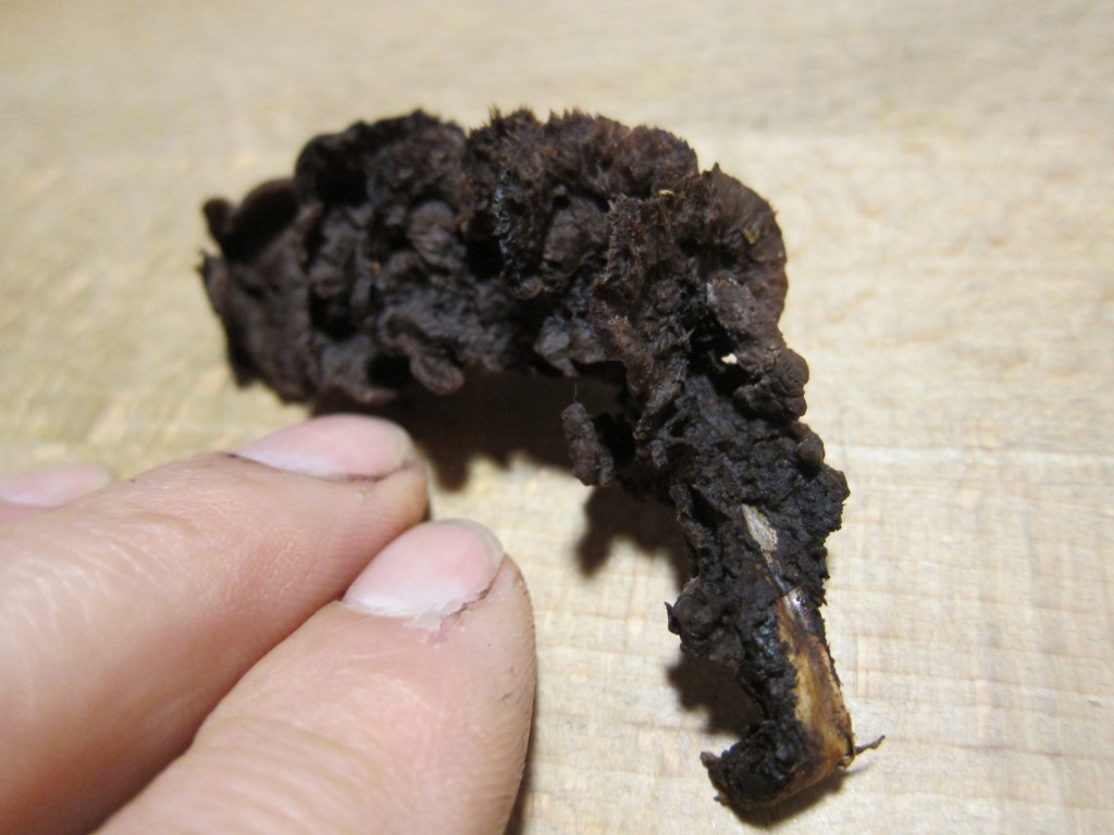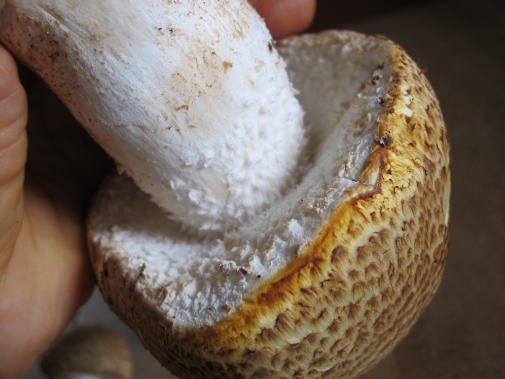 Der dicke Brummer hat ein richtiges Fell am Stiel (Durchmesser 5,5cm), die Hutglocke ist 8cm hoch und hat 15cm Durchmesser. Die Huthaut ist sehr samtig, lässt sich abziehen. Am Fuß konnte ich keine knollige Verdickung wie z.B. beim Perlpilz finden.