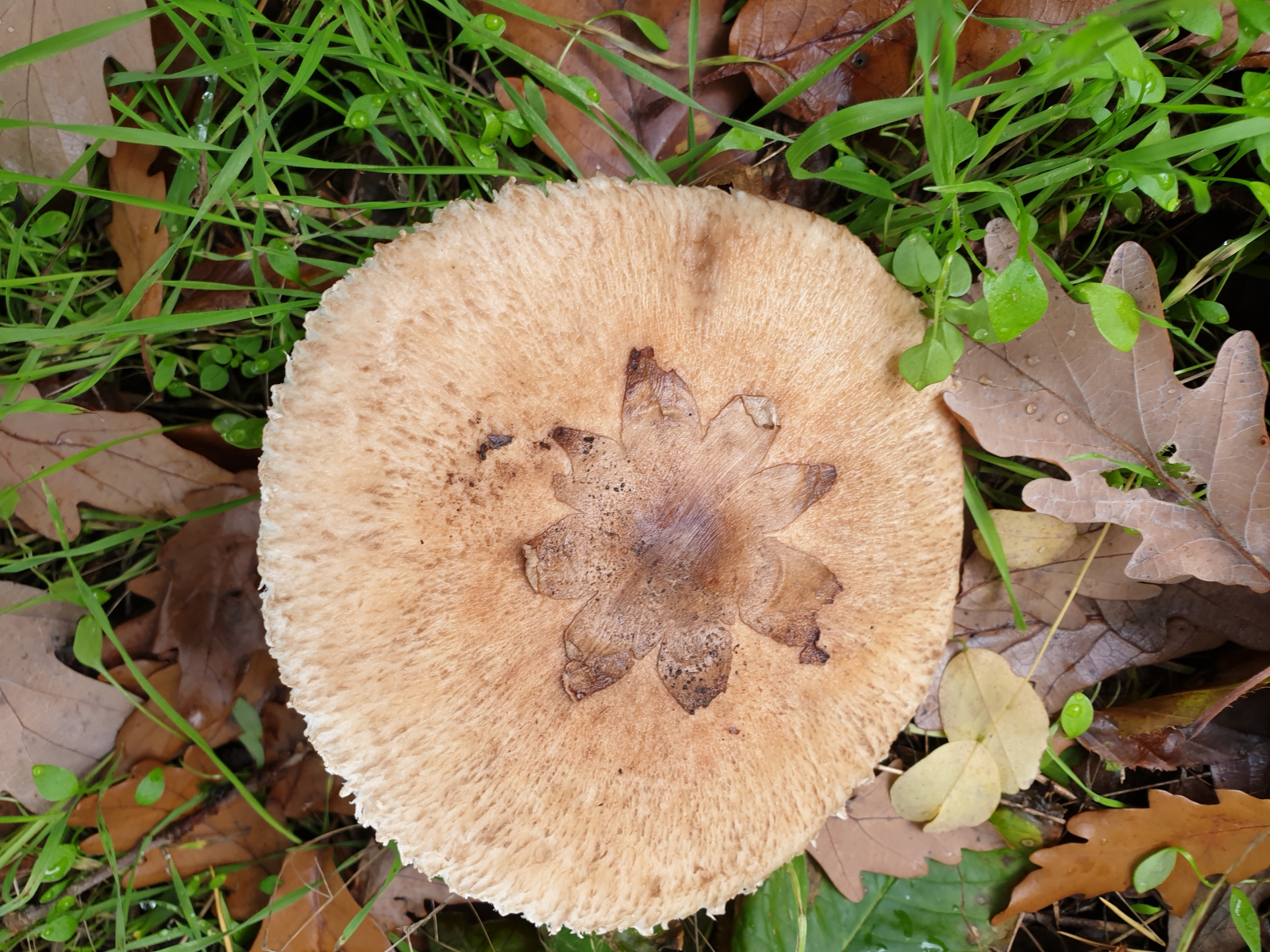 Kann es sein, dass wegen des Regens die Schuppen weg sind oder weil der Pilz evtl. alt ist? Die Lamellen sind nicht ganz weiß.