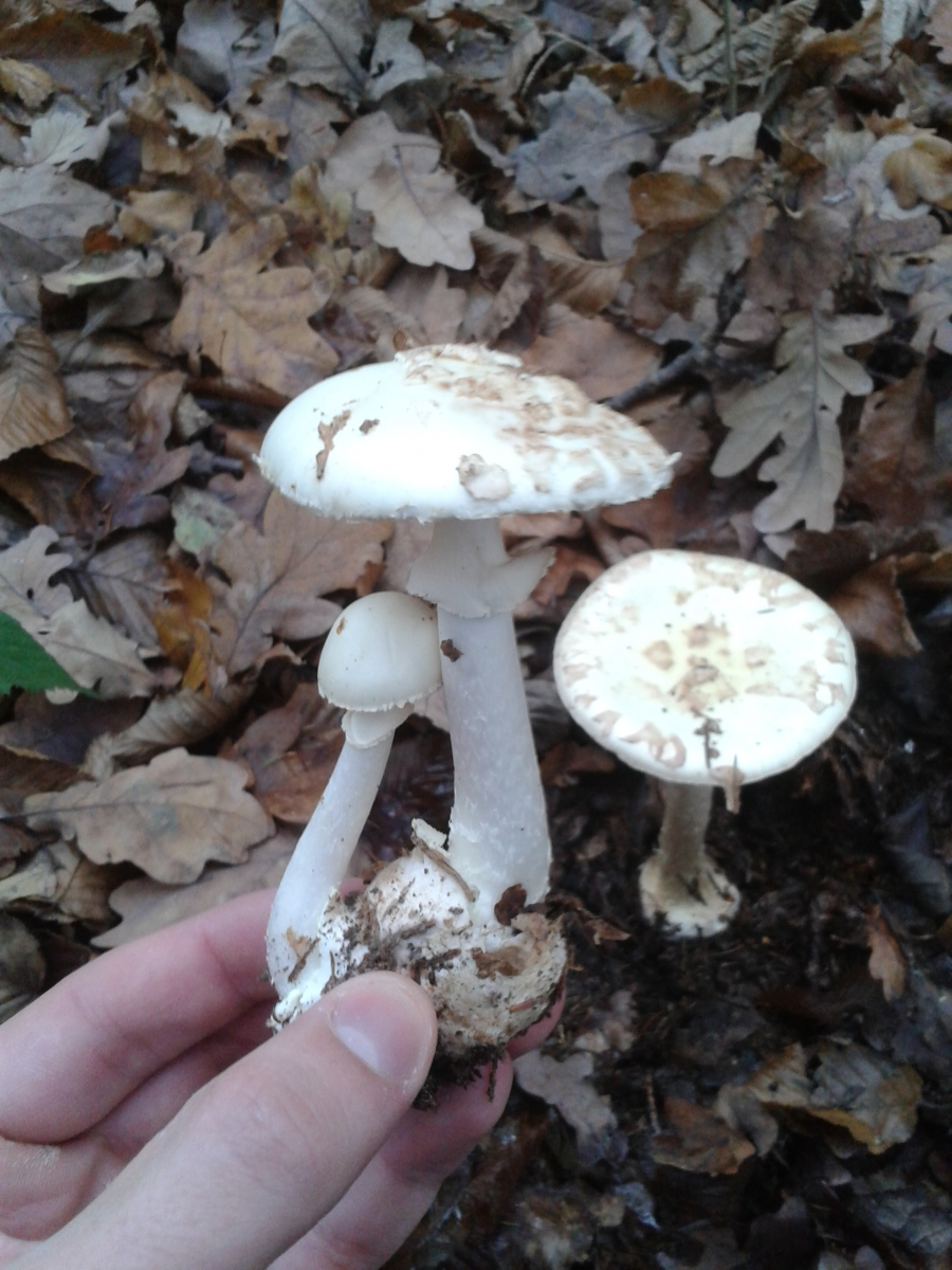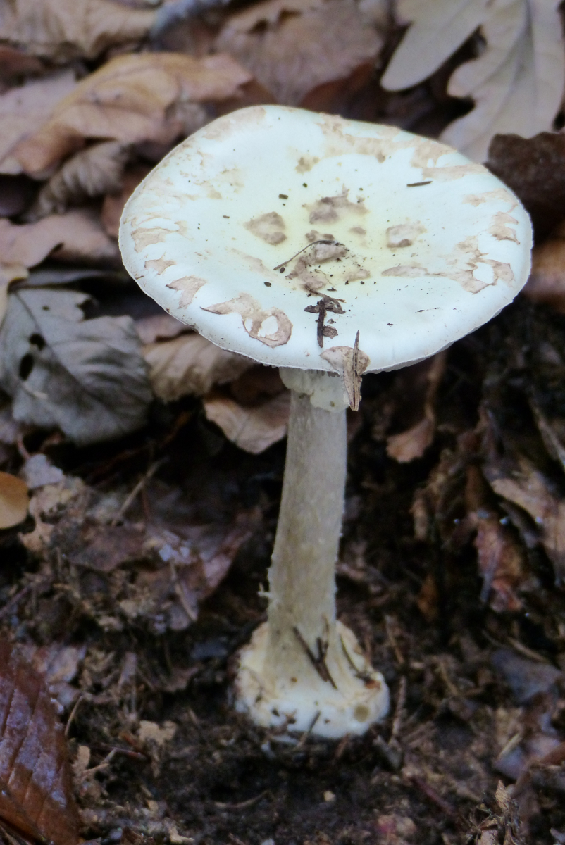 Spontan würde ich auf einen Knollenblätterpilz tippen... nur welcher? Ich tendiere ja fast zum Gelben (Amanita citrina). Für den Grünen ist mir da einfach zu wenig Grün und die scholligen Hüllreste auf dem Hut sprechen für mich für den Gelben Knollenblätterpilz.