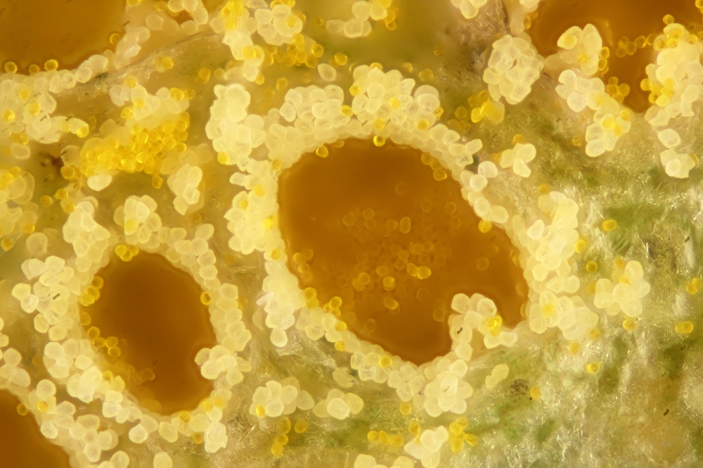Was mich a bissl stört ist, dass die Fk so rein resupinat sind, obwohl sie am vertikalen Substrat wachsen. Die paar C. rene-hentic Funde, die ich hatte und anfangs auch von H.Ostrow bestätigen ließ, hatten immer leichte Hutkanten, wie im Ryvarden/Melo abgebildet. Diese A.tanakai, von der vermutet wird, dass eine Belege als A. albida in Herbaren schlummern, soll aber auch