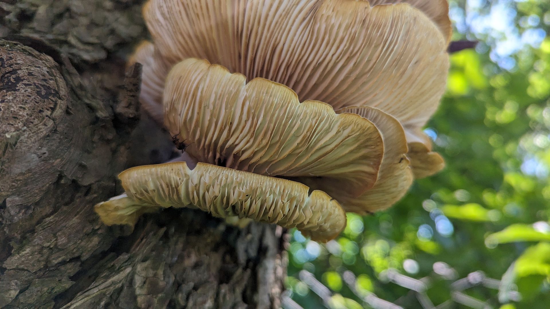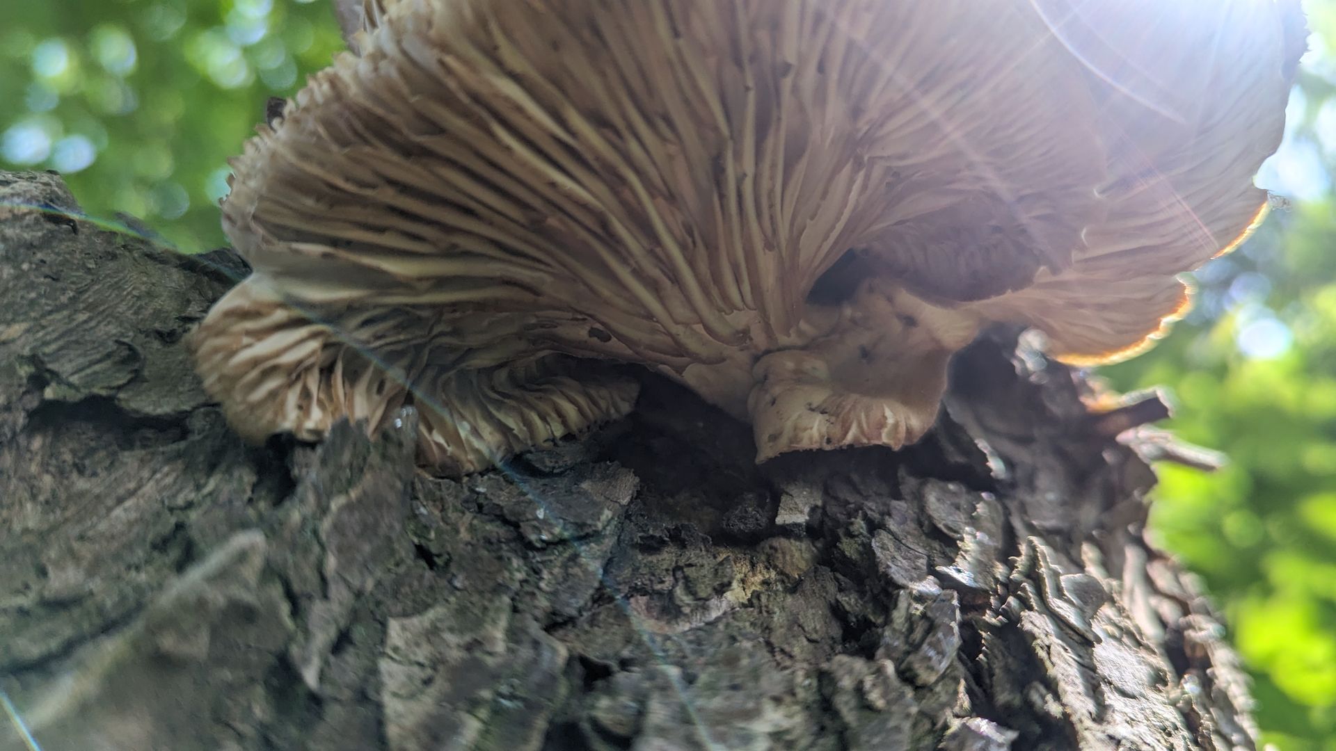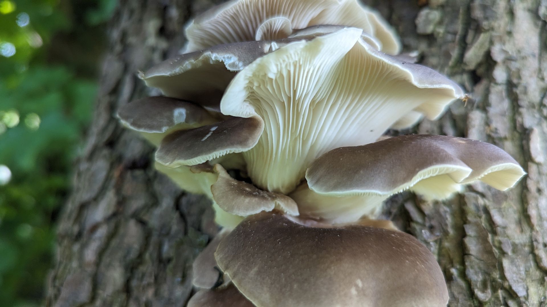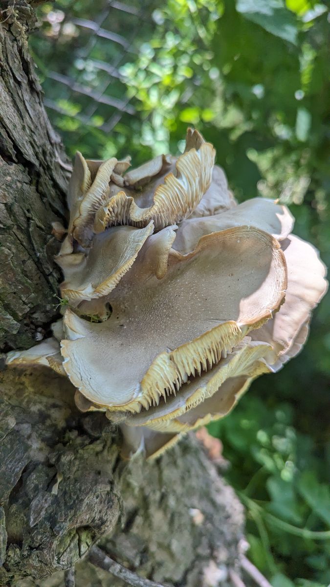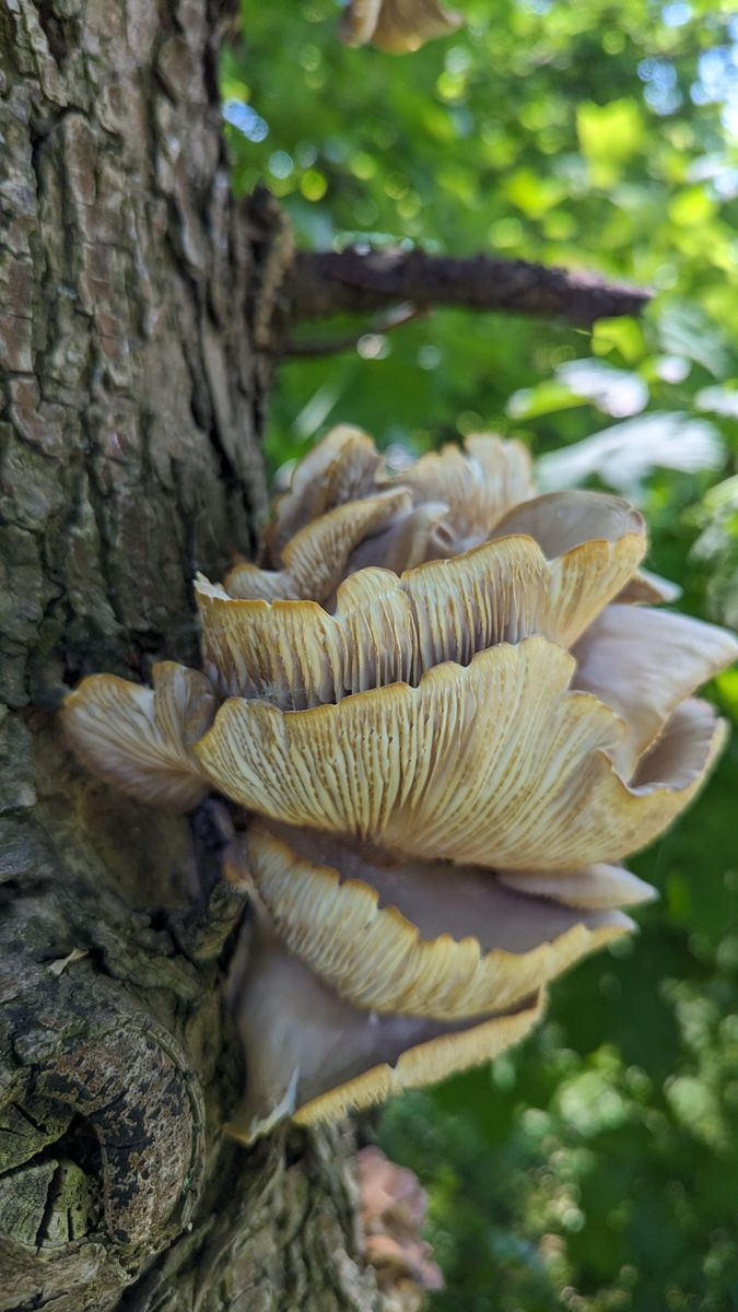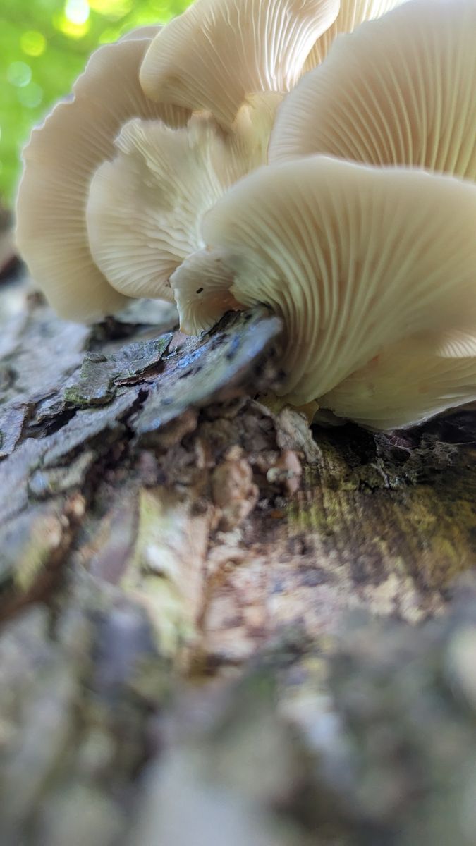 diese hier beobachte ich schon seit einer ganzen Weile (sie kommen und gehen). Ich vermute, dass es Austernseitlinge sind. Allerdings kommen sie mir ziemlich "hart" vor und der hochgewellte Rand passt auch nicht so ganz. Oder liegt das daran, dass diese Exemplare hier schon deutlich "drüber" sind (was man auch an der Verfärbung der Lamellen sieht)?