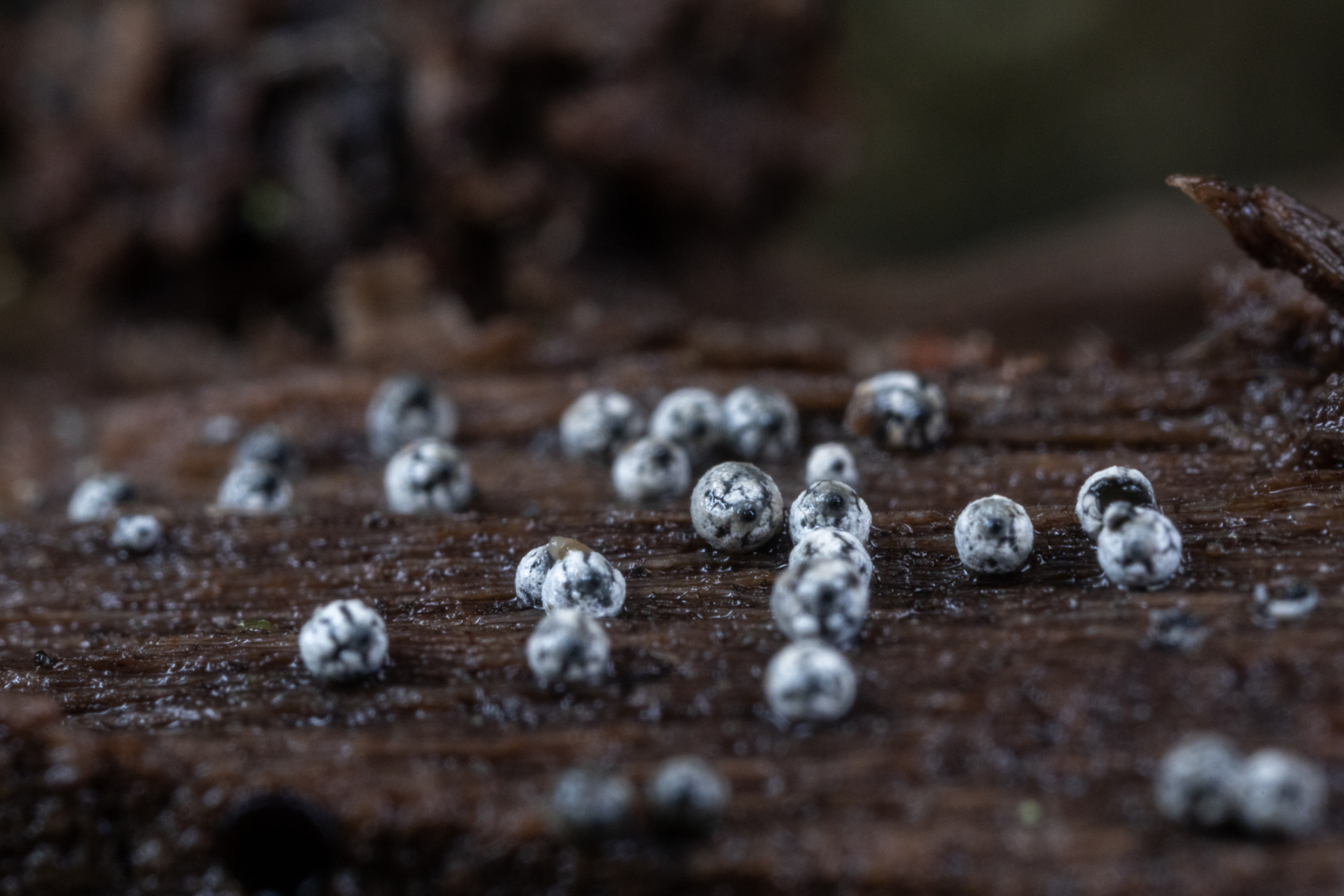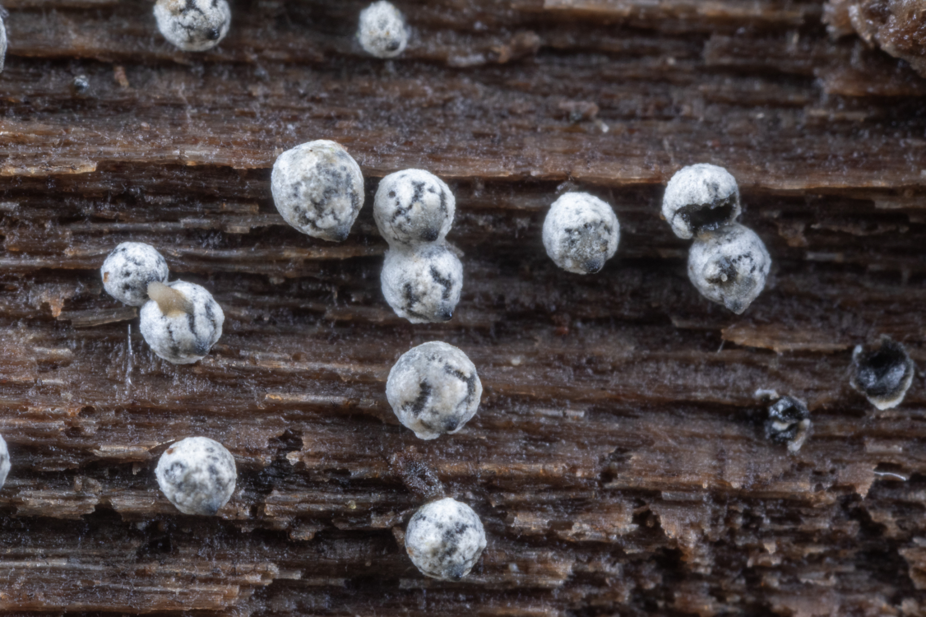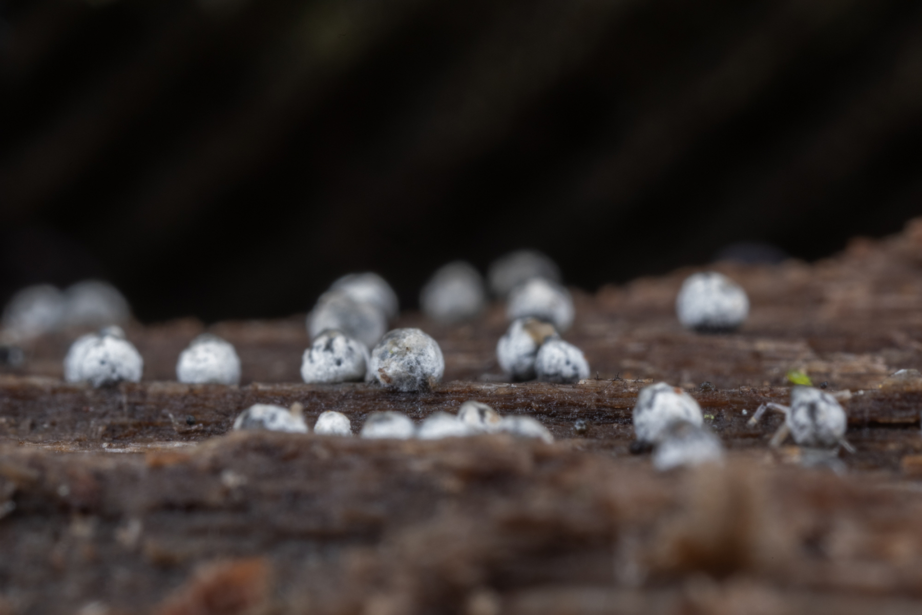Heute (30.11.19) fand ich diese winzigen fast kugelförmigen Gebilde auf bereits weichem Totholz (liegender Laubbaum).