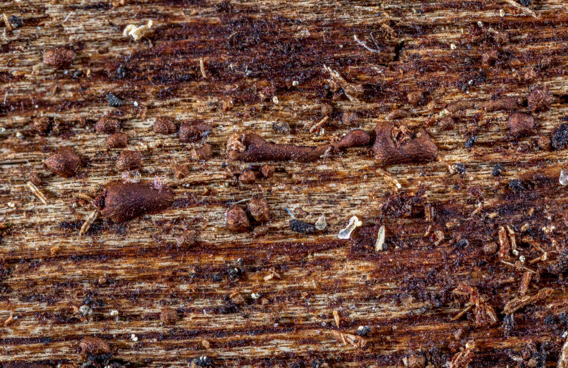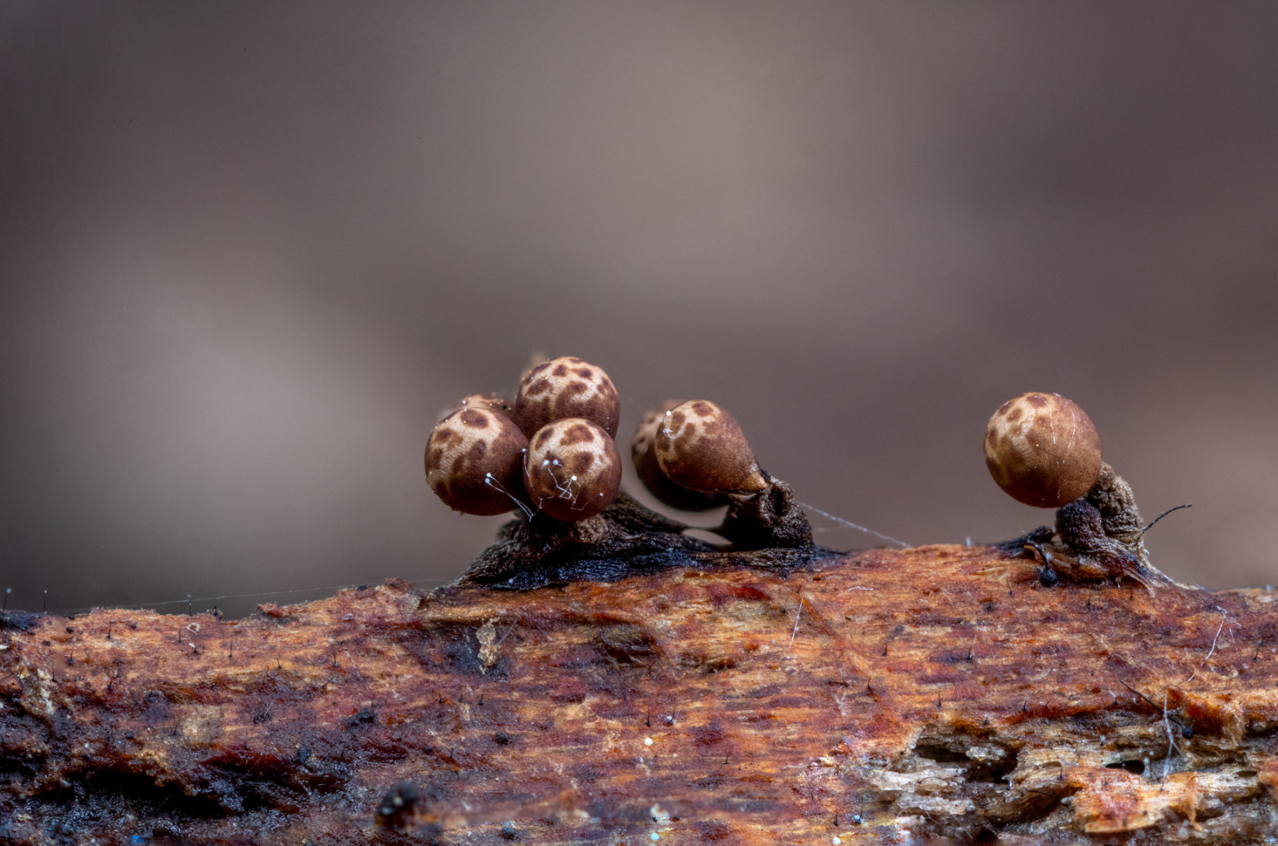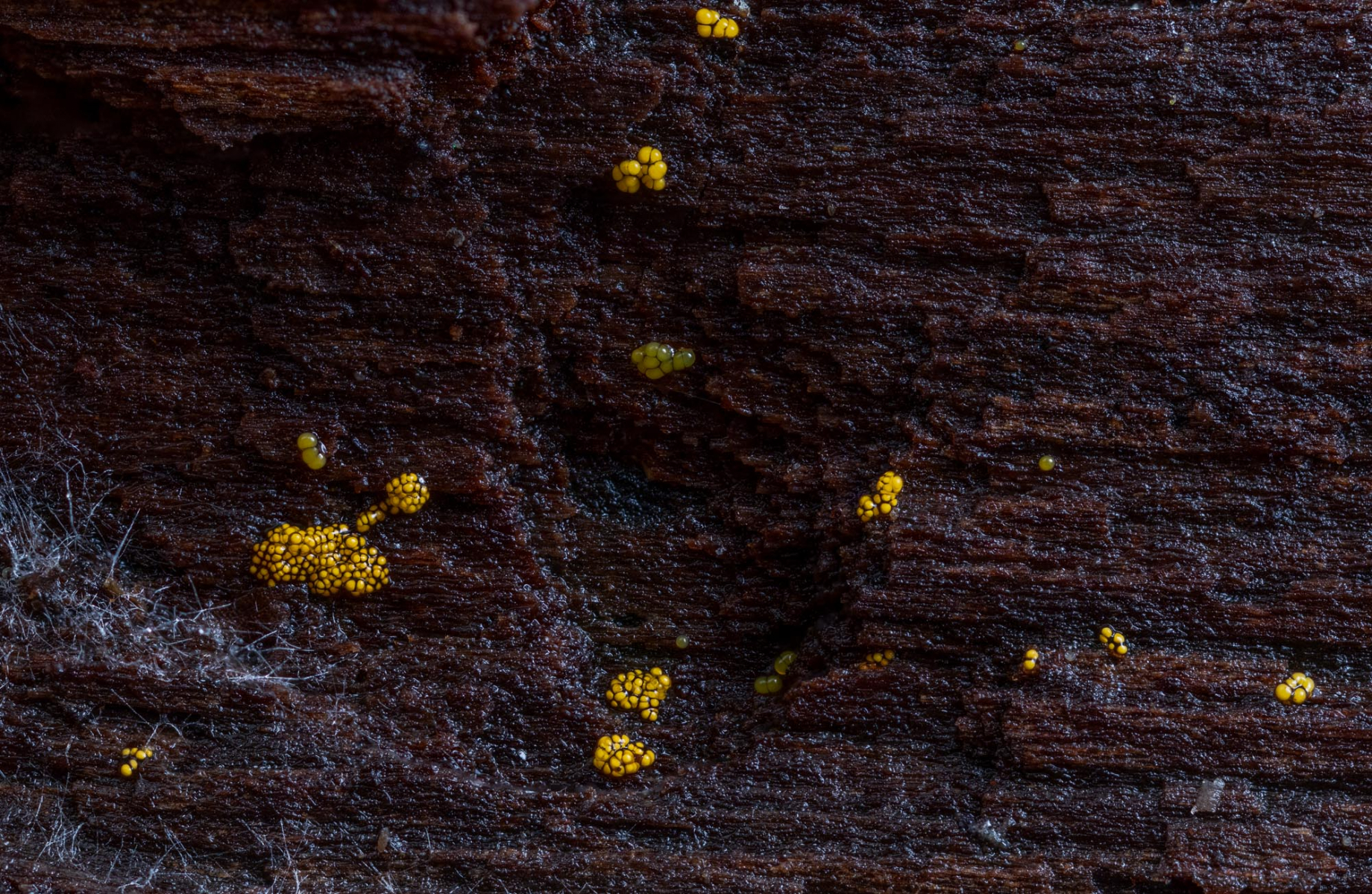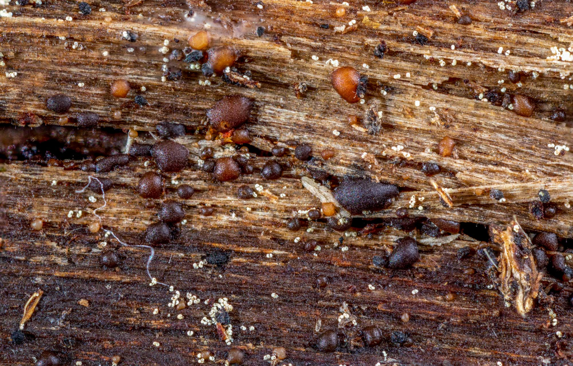 auf der Unterseite eines größeren, auf dem feuchten Laubwaldboden liegenden Eichenrindenstücks fand ich heute diese Winzlinge,