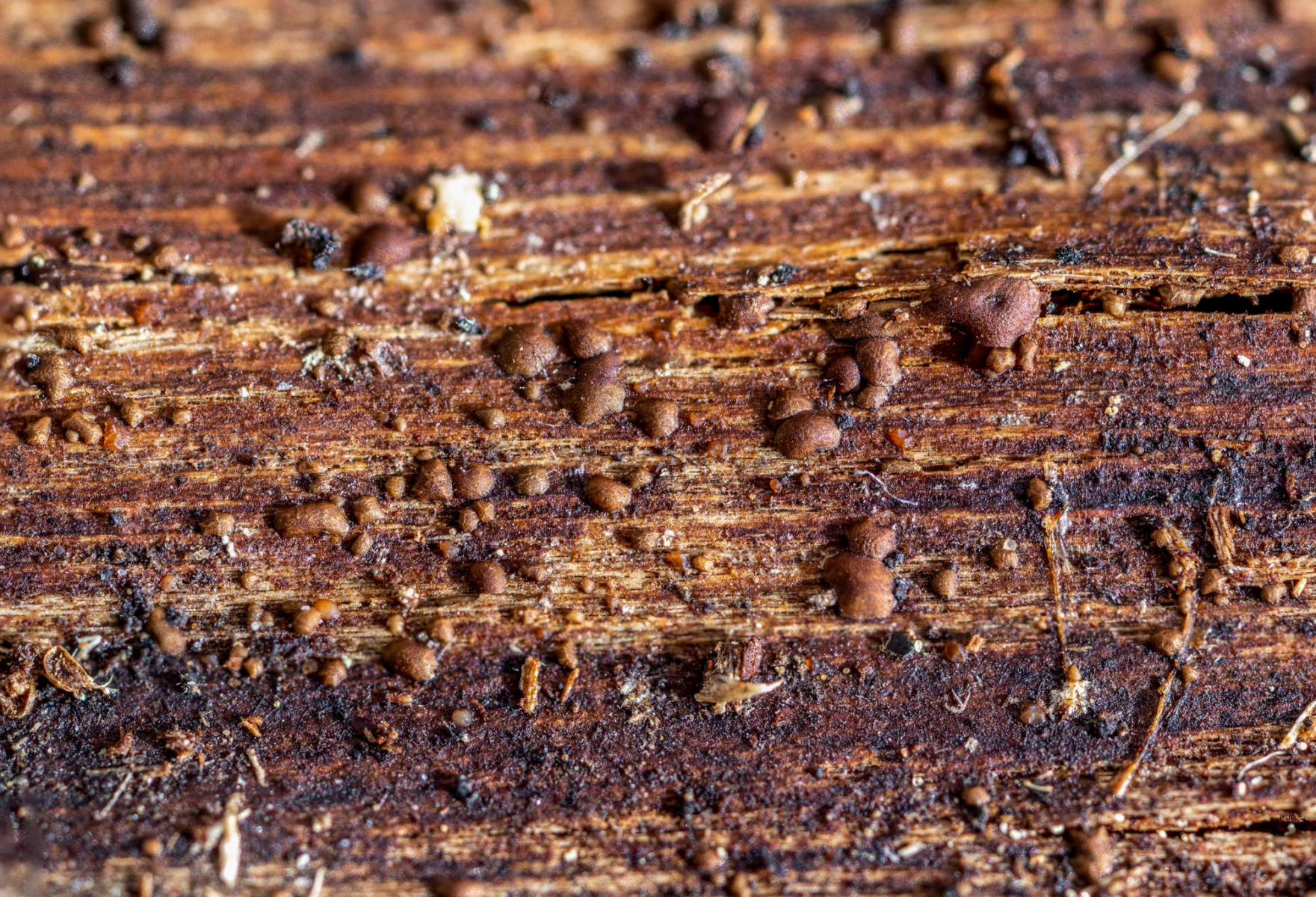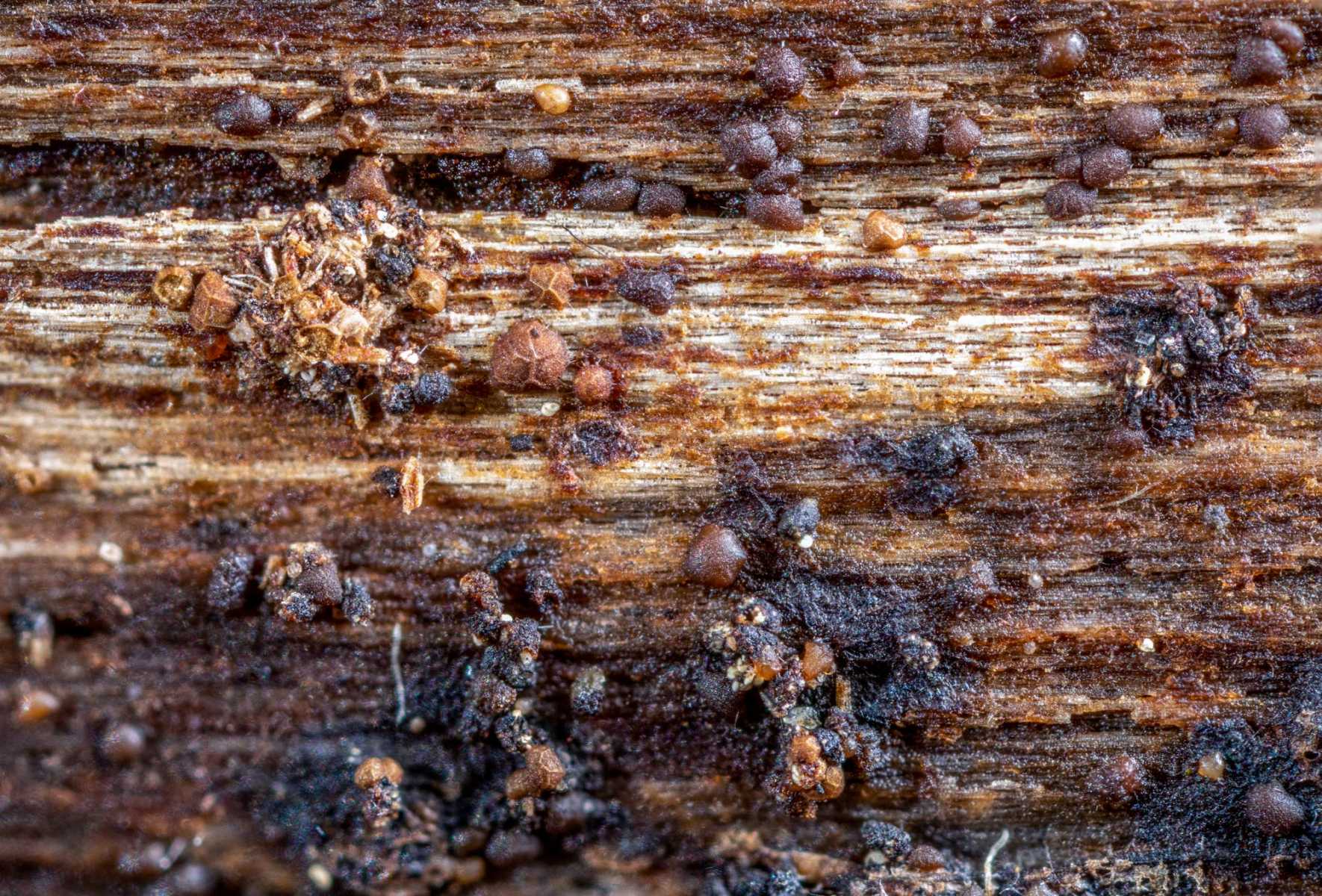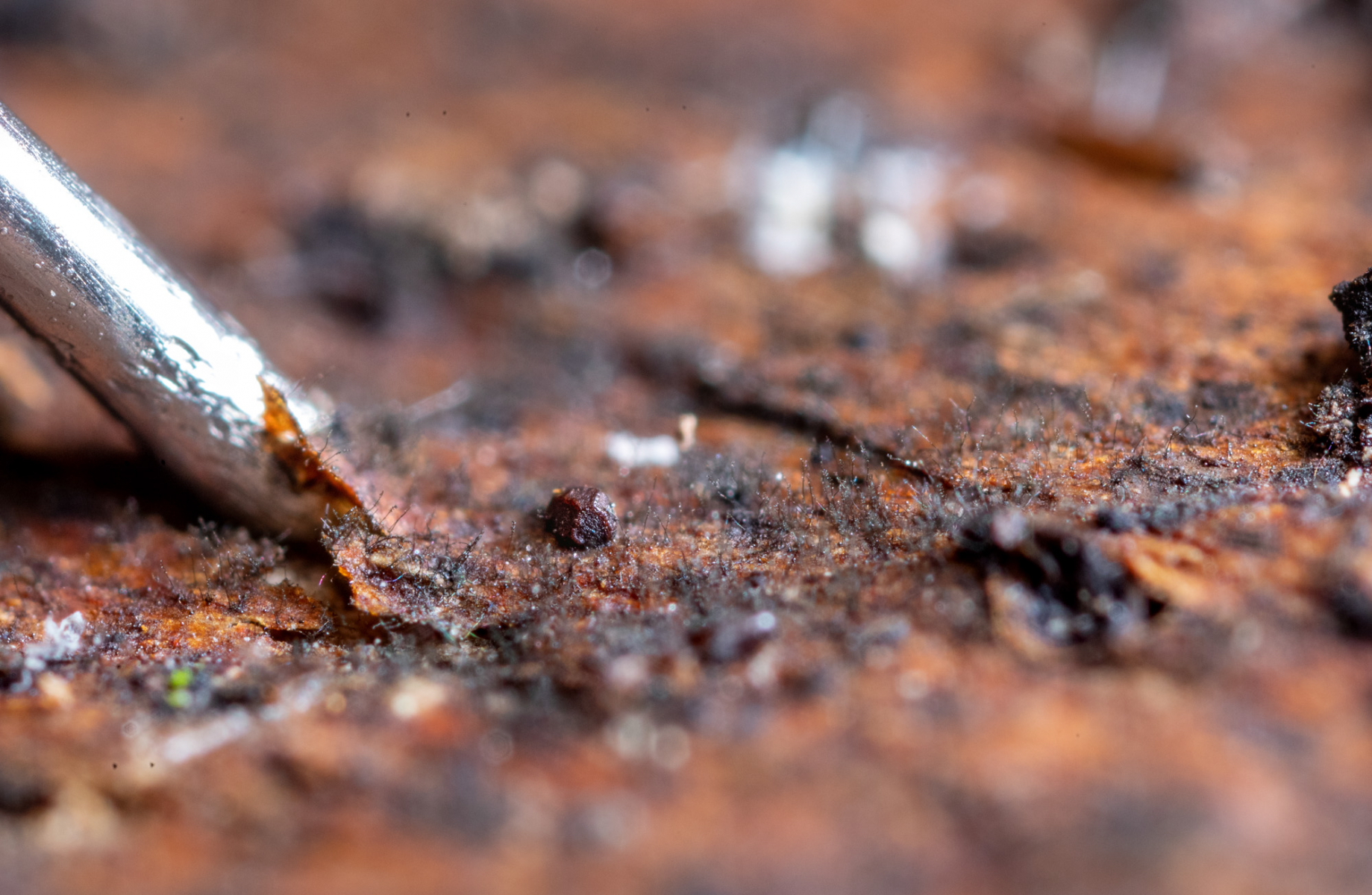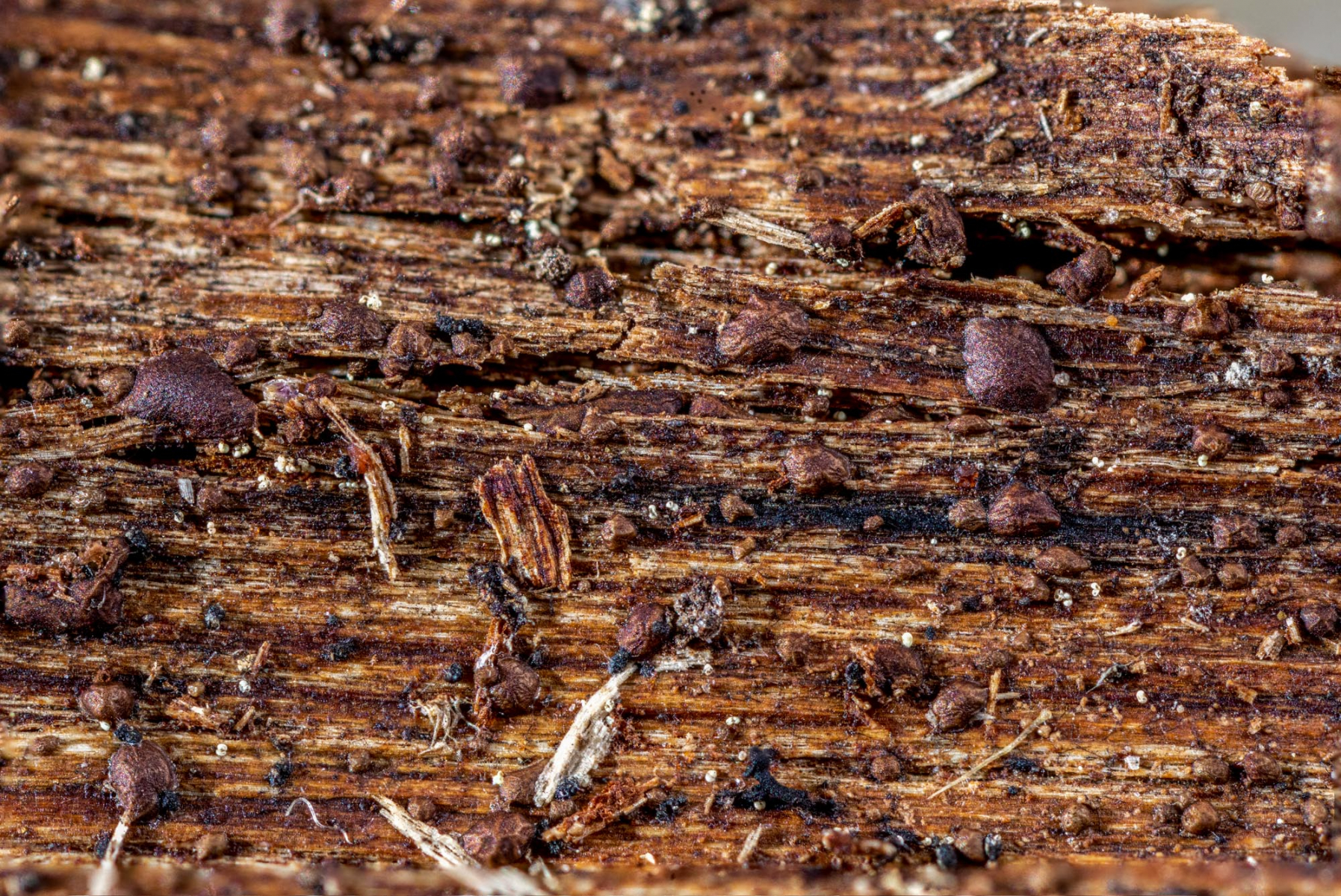 Die winzigen, dunklen, kantigen Fruchtkörper befinden sich auf einem Birkenrindenstück.