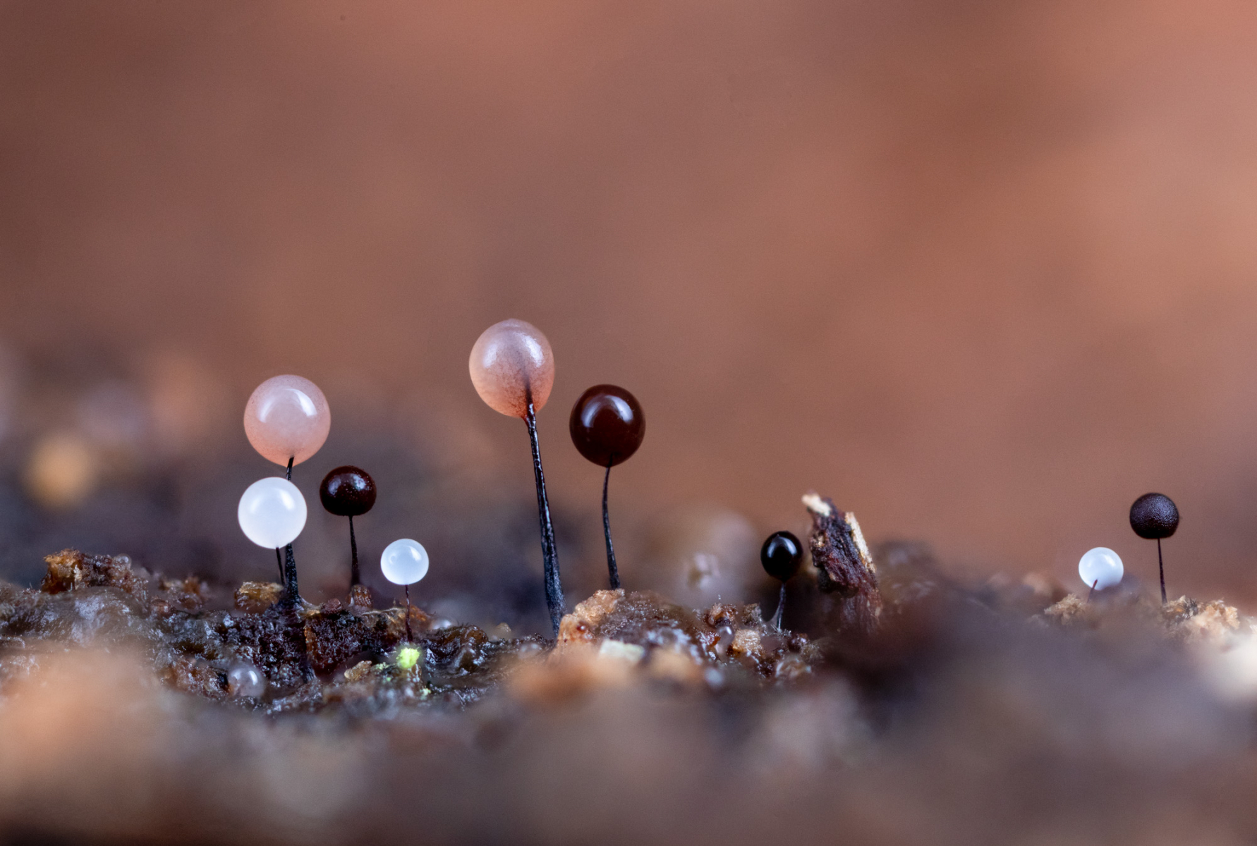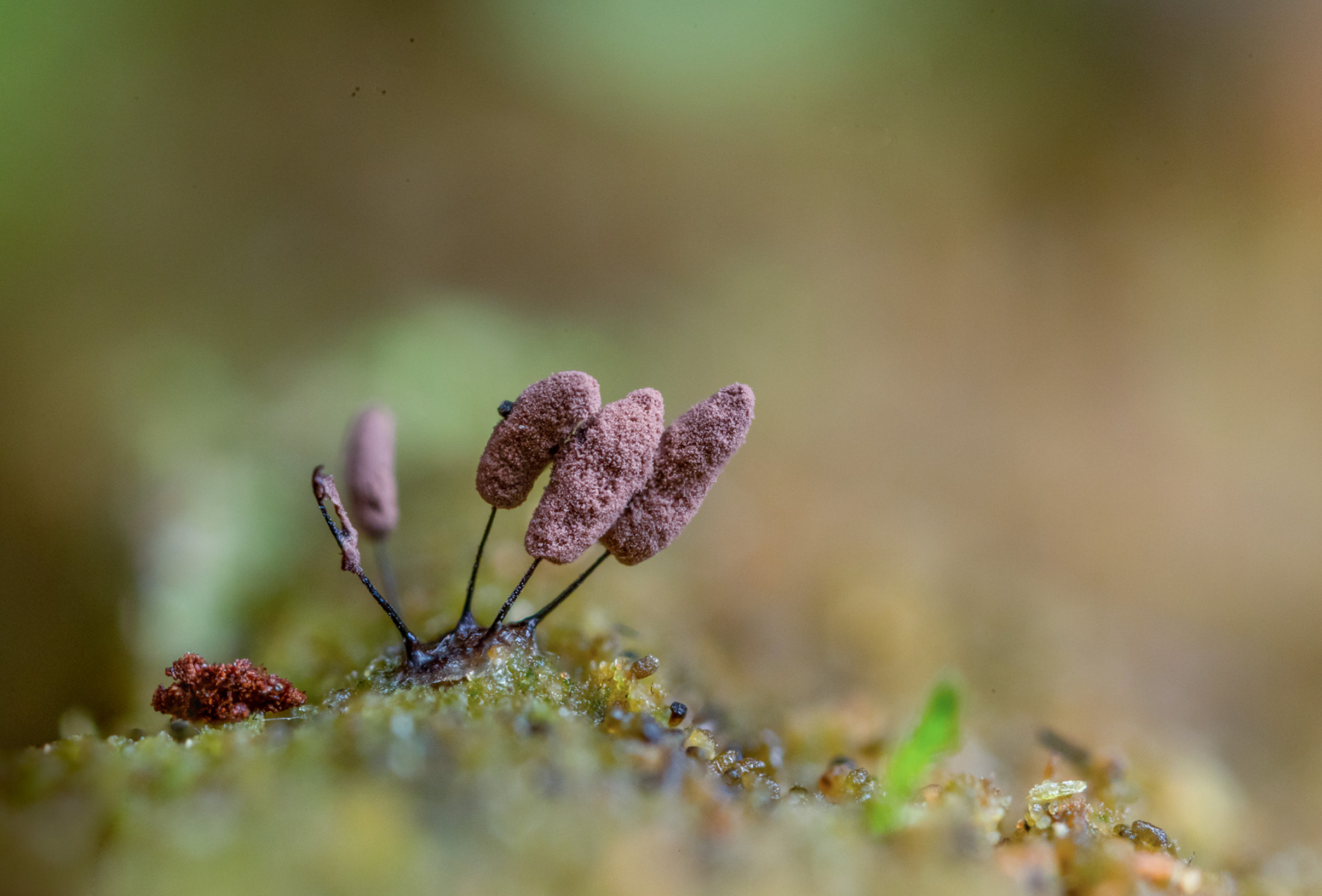 vor ein paar Tagen fand ich an einem morschen liegenden Baumstamm in Bachnähe diesen kleinen Schleimpilz (Gesamthöhe knapp über 1 mm, Sporokarpiendurchmesser etwa 0,3 mm.