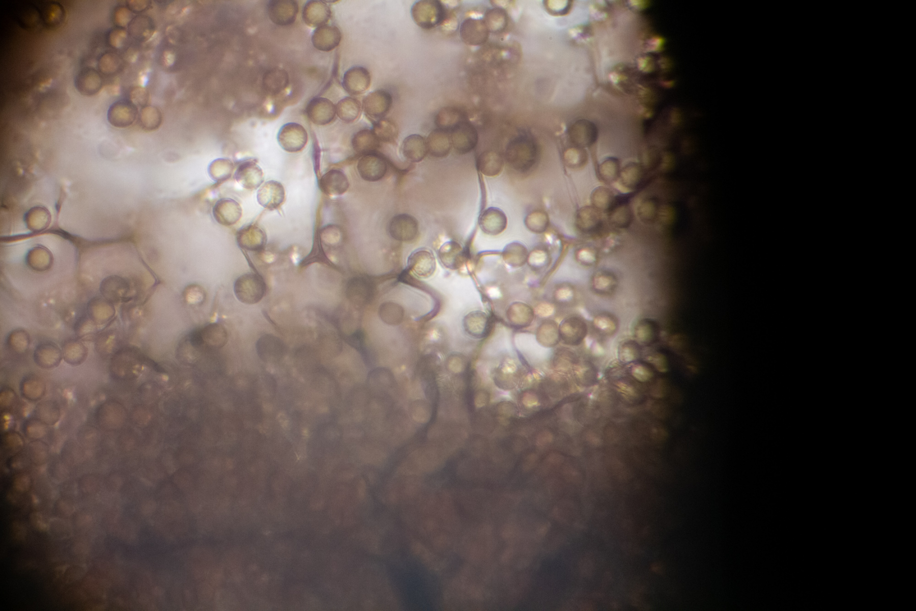 Die Sporen sind +/- 10 µm und haben ein Netz (oder doch unregelmäßig verteilte Warzen?).