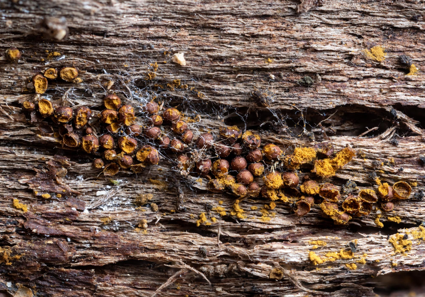 in der Feuchtkammer hat sich dieser Schleimpilz (eine Gruppe mit 5 Sporokarpien und ein einzelnes Exemplar) auf morschen Holz entwickelt.