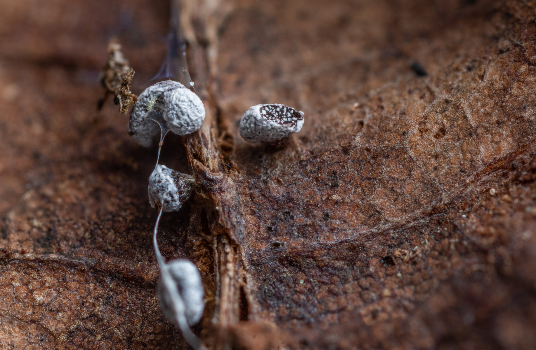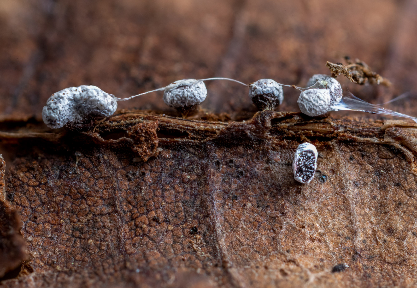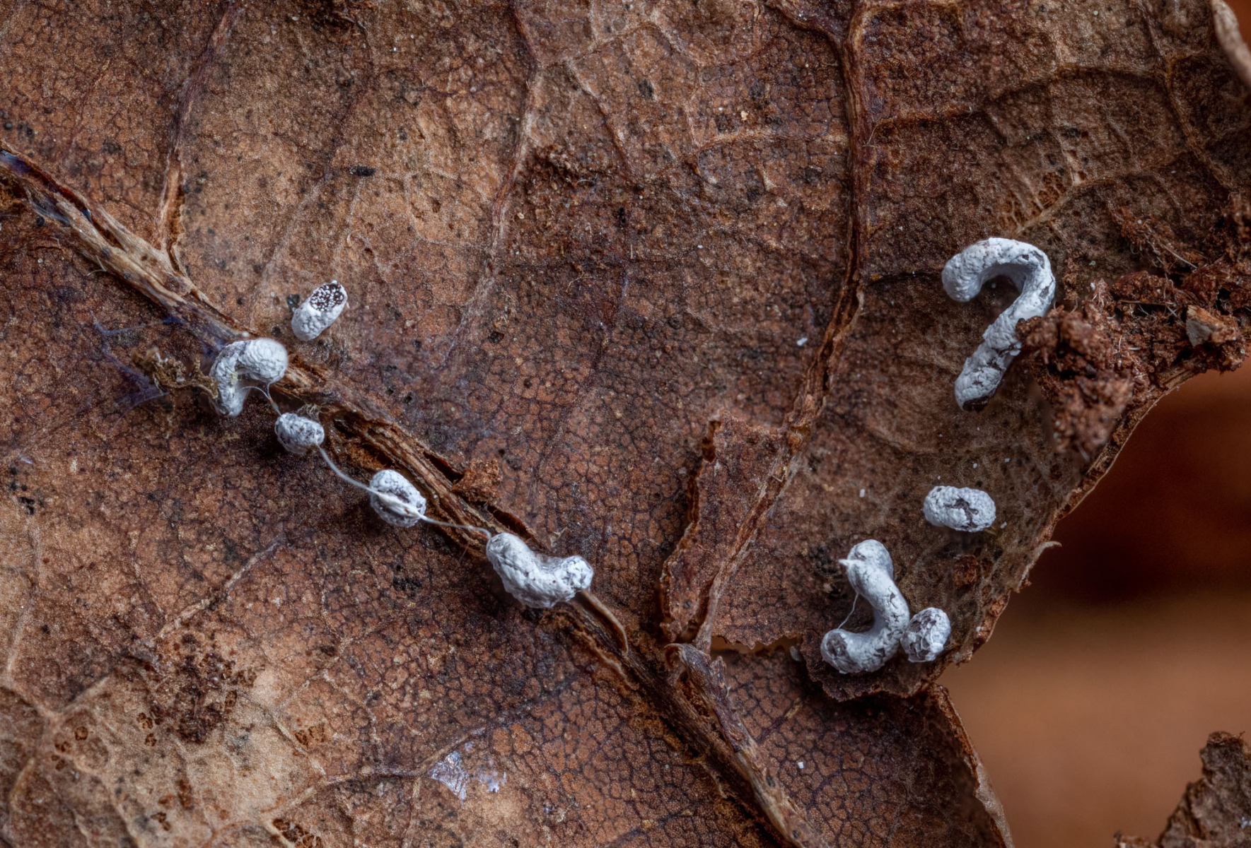 gestern fand ich in einem schattigen Quellbereich auf einem alten Blatt diesen weißen Schleimpilz.