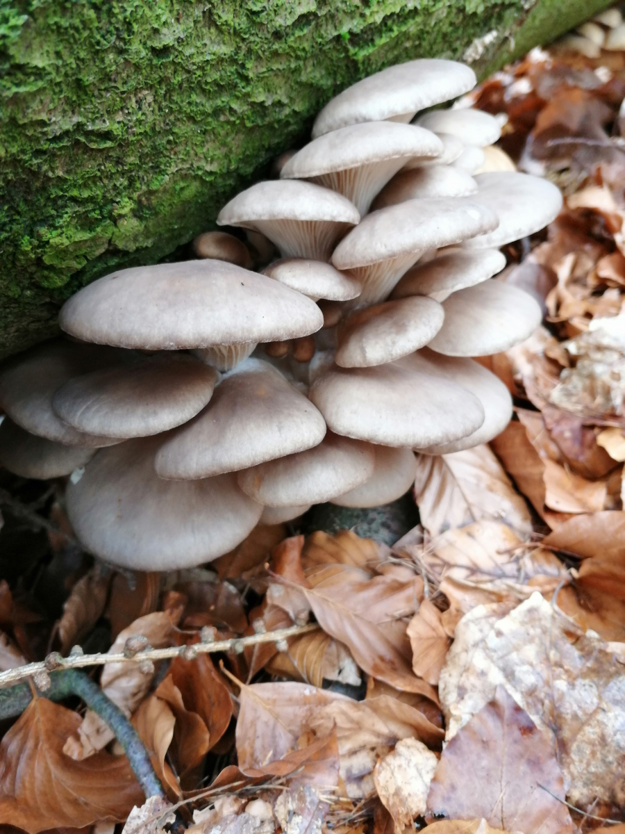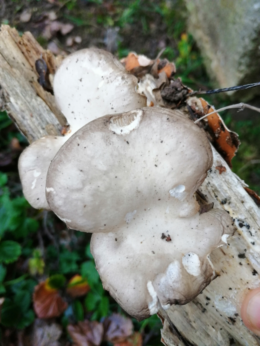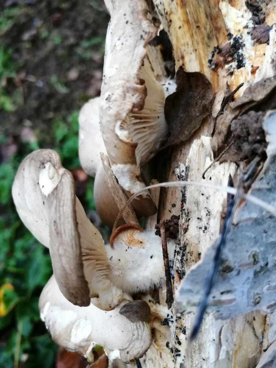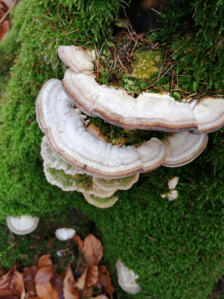 Bin in einem Mischwald mit Buchen und Fichten und an einem alten Baumstamm habe ich diese Pilze entdeckt.