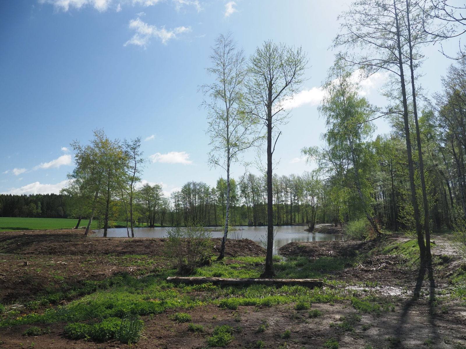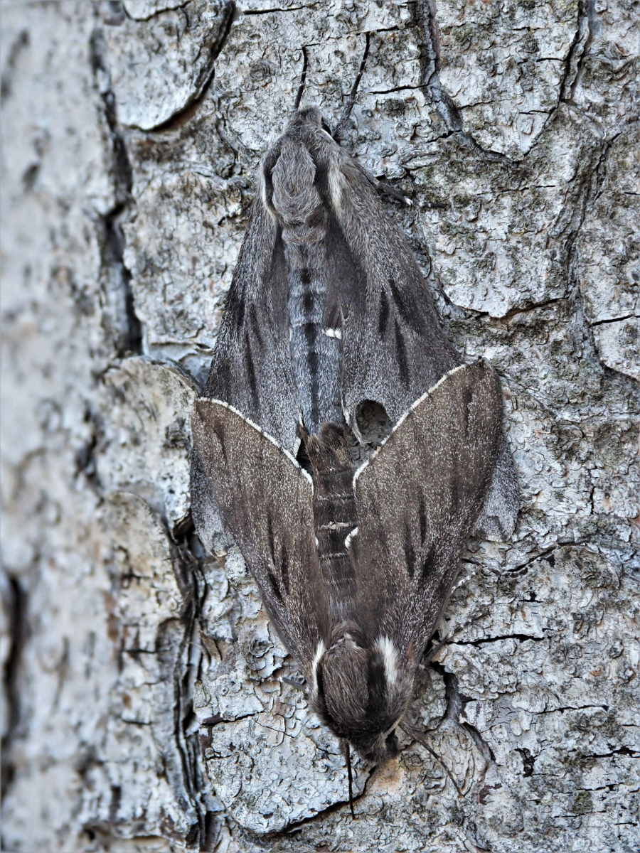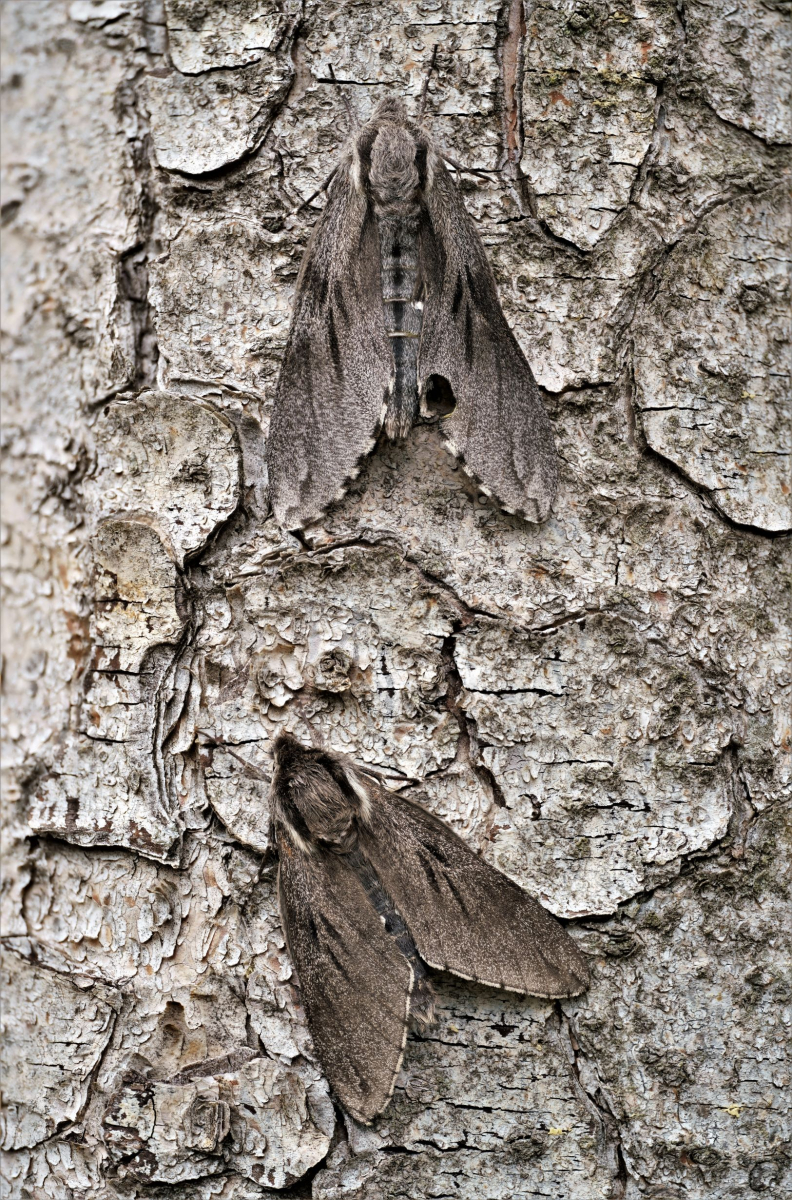 In unserem Nachbarort war im Winter eine Teichgruppe saniert worden. Wir wollten uns mal umschauen, wie sich das Ganze bis jetzt entwickelt hat. Auf dem Weg dahin fanden wir zwar keine Pilze, aber am Stamm einer Fichte paarten sich gerade prächtige Kiefern-Schwärmer. Die Länge über beide Körper betrug etwa 9 cm! Obwohl diese Schmetterlinge nicht selten sein sollen, bekamen wir sie zuvor noch nie zu Gesicht. Kein Wunder bei diesem Tarnkleid. Am Nachmittag suchte ich die Fichte nochmal auf, um diesmal Fotos vom Stativ aus zu machen. Die Schwärmer waren noch vor Ort, aber der böige Wind ließ auch diesmal keine maximal scharfen Fotos zu