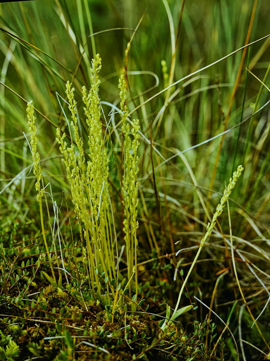 Da es mir gelungen ist mit geeigneter Fototechnik alte 6x6-Dias abzufotografieren und durch Bildbearbeitung weiter aufzubessern, kann ich hier einen 40 Jahre alten Fund von Hammarbya paludosa (Sumpfweichwurz-Orchidee) zeigen. Diese mindestens 20 gedrängt stehenden Pflanzen sind sicherlich nicht allein Ergebnis der Vermehrung über Samen, sondern auch des Abfallens kleiner (0,5mm DM) Brutknollen von den unteren Hüllblättern der Bulben.