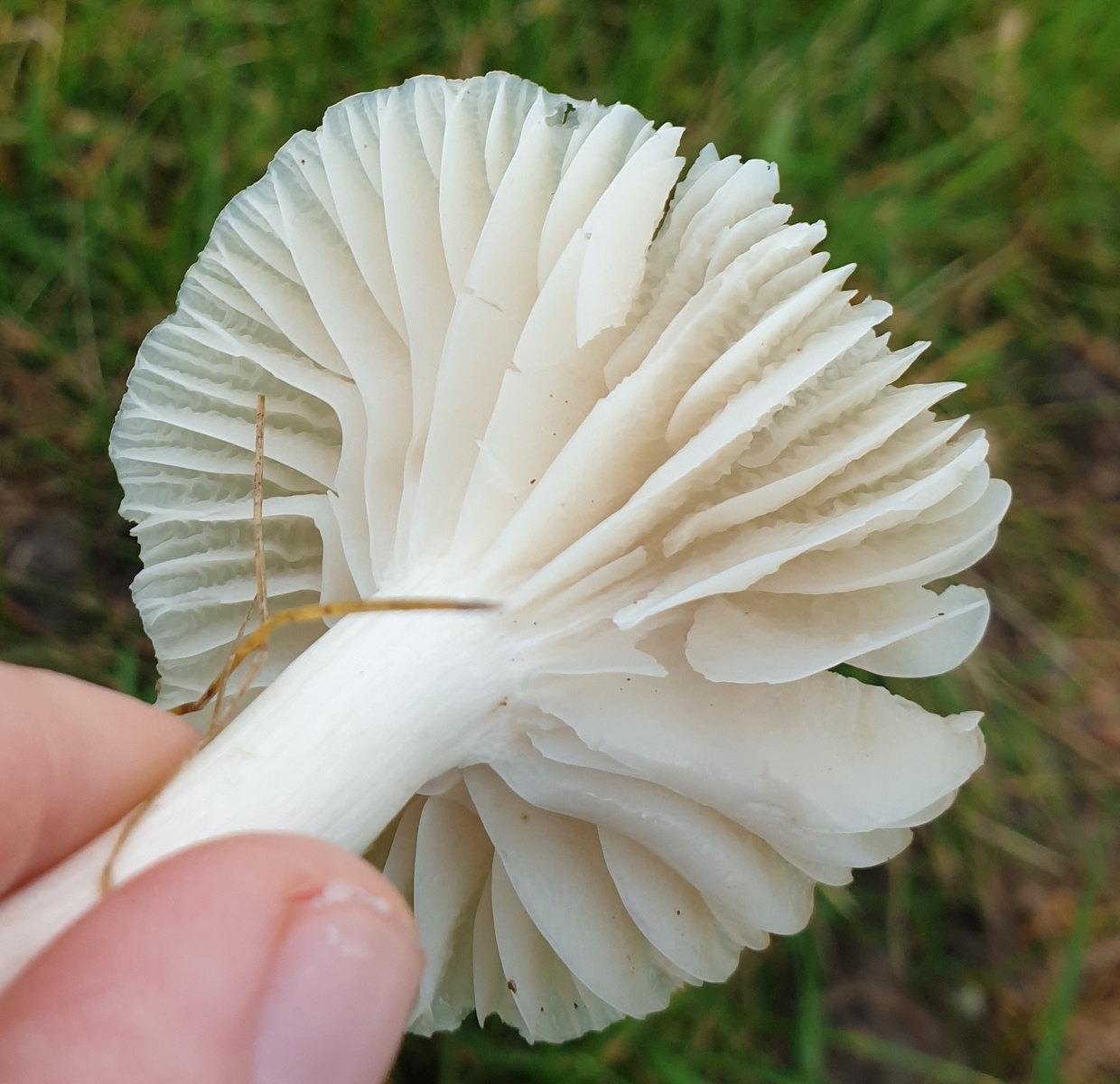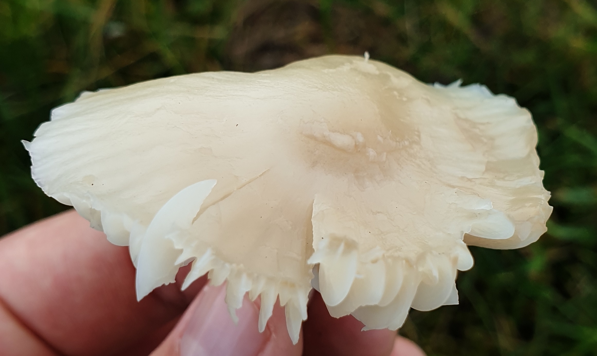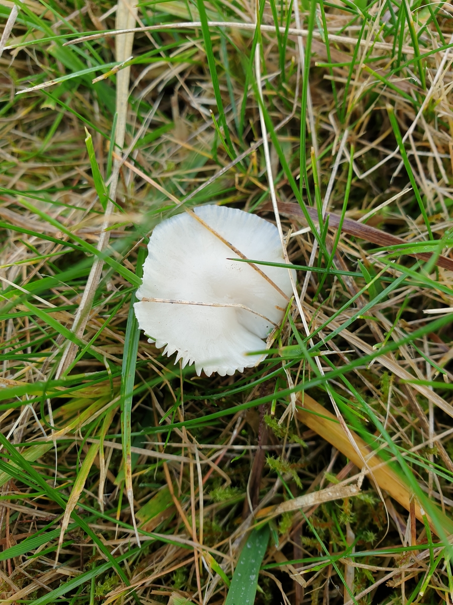 ebenfalls an einer Schafweide fand ich diesen fast weißen Pilz - Nur die Huthaut ging etwas mehr ins Hellbraune.
