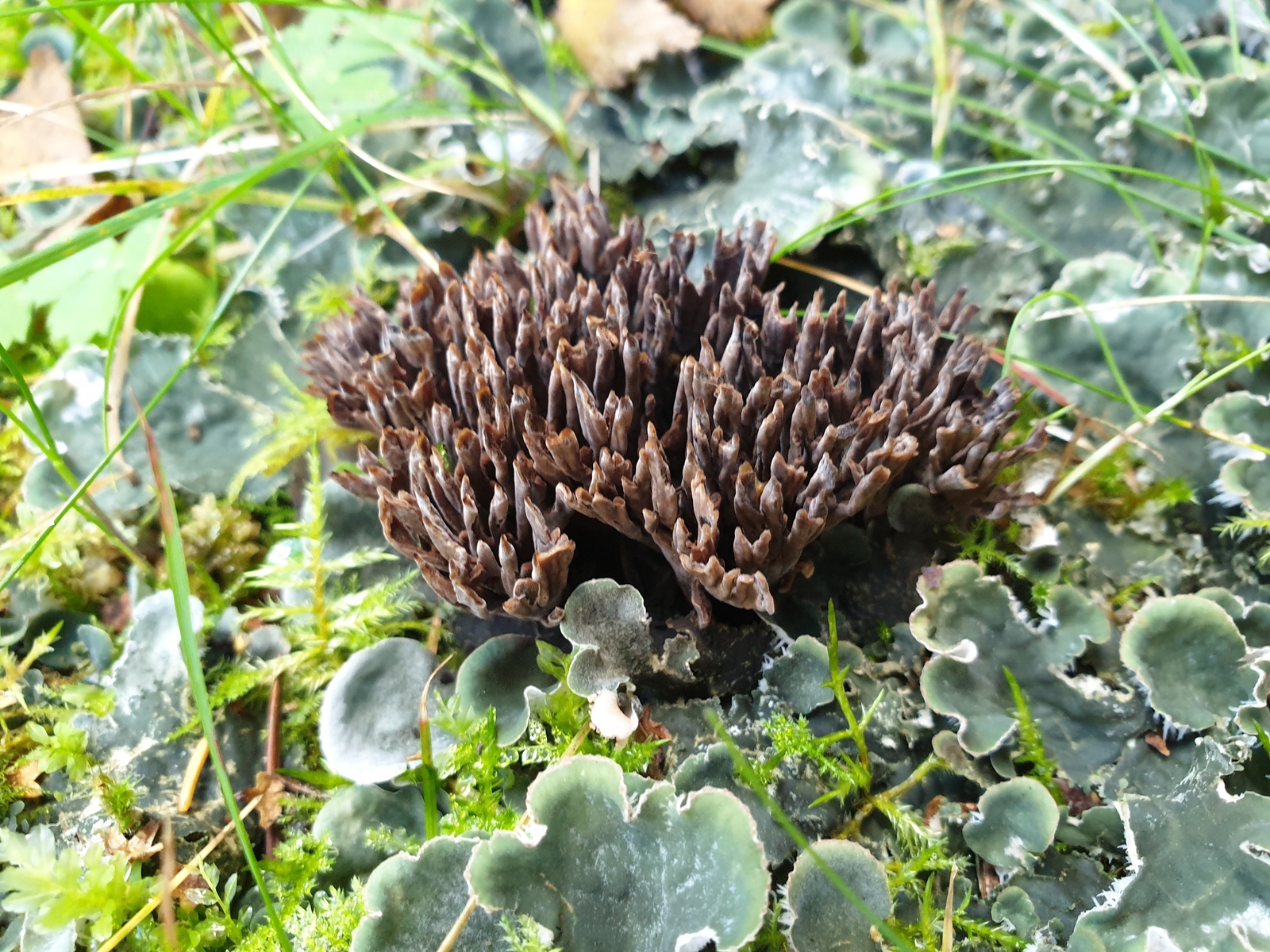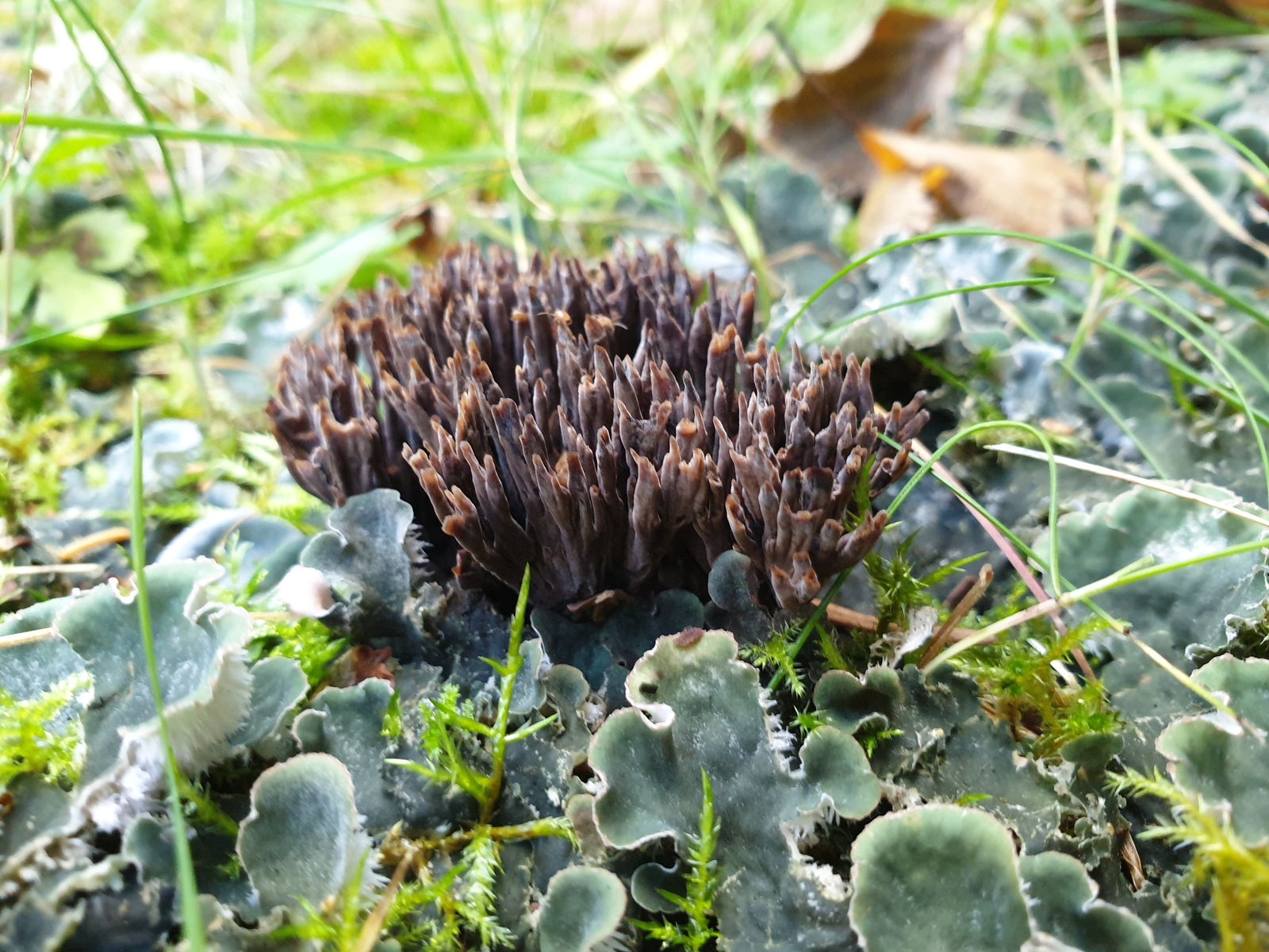 dieser kleine Korallenpilz (geschätzt ca. 3x5cm) wuchs zu mehreren inmitten dieser hübschen Flechte auf einer Grasfläche, auf der eine dicke Kiefer stand. Jedoch standen diverse weitere Baumarten in der Nähe.