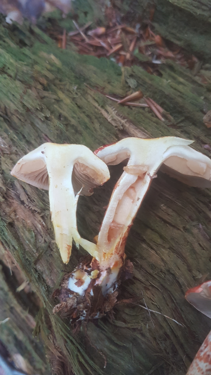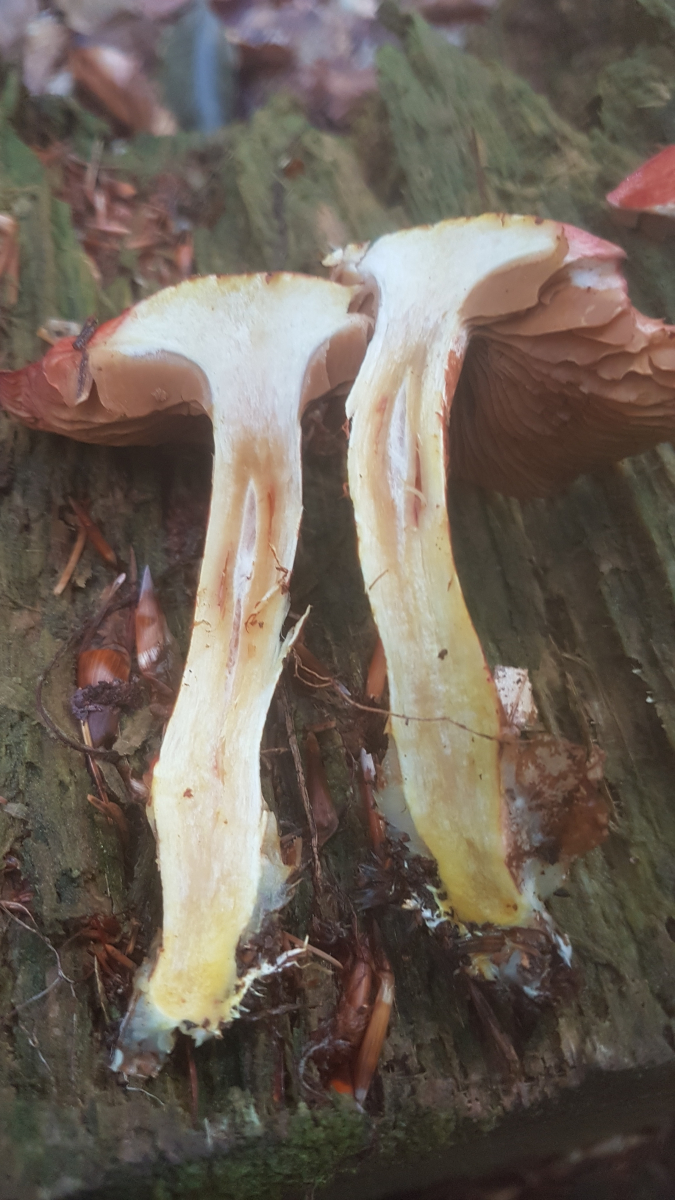 Schleierreste am Stiel meine ich zu erkennen.Im Schnitt gilbend, später zuhause war der ganze Fruchtkörper rötlich verfärbt.