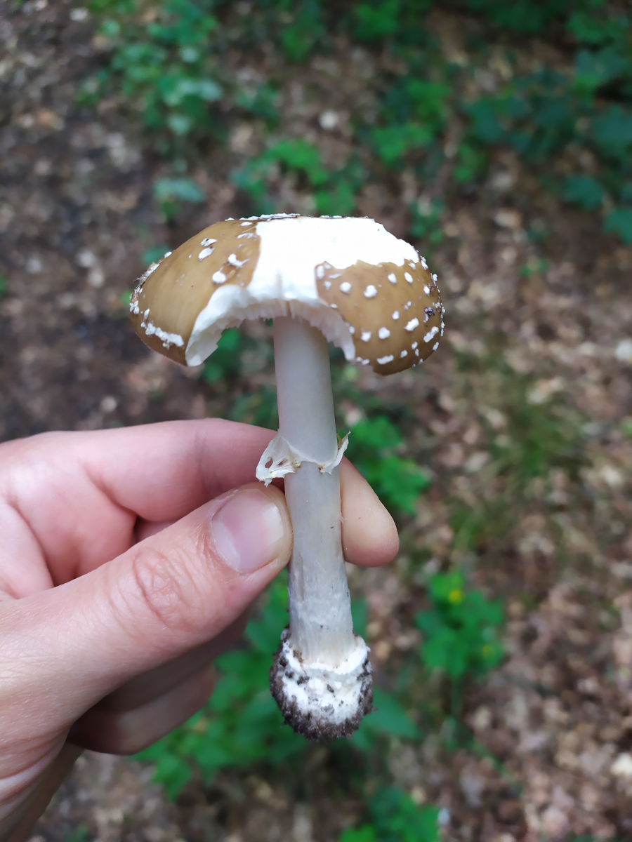 Hallo liebe Pilzgemeinde, bin gerade im Wald unter einem pilz ( aus Holz ) und trinke gemütlich eine Tasse Tee. Ahja und ich habe gerade einen neuen Pilz ( für mich ) entdeckt, den ich als Amanita beckeri ( hellflockiger streifling ) bestimmt habe bzw stark vermute, was meint ihr?? Ich finde es passt, lasse mich aber gerne eines besseren belehren. Da ich gelesen habe das der Pilz stark gefährdet ist, habe ich ein bisschen schlechtes Gewissen, da ich einen Fruchtkörper ( den größten) zur Bestimmung, aus dem Boden entnommen habe. Dafür habe ich den Hut dann etwas höher platziert damit er gut seine Sporen fliegen lassen kann