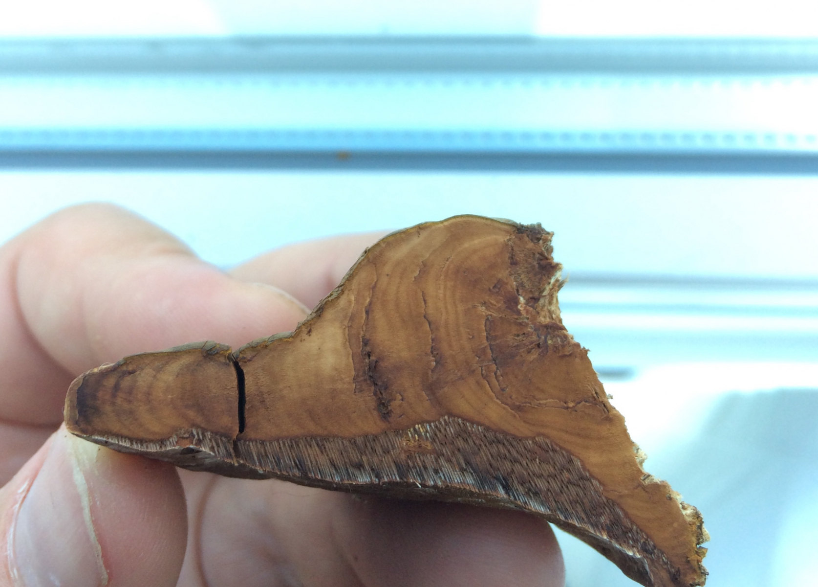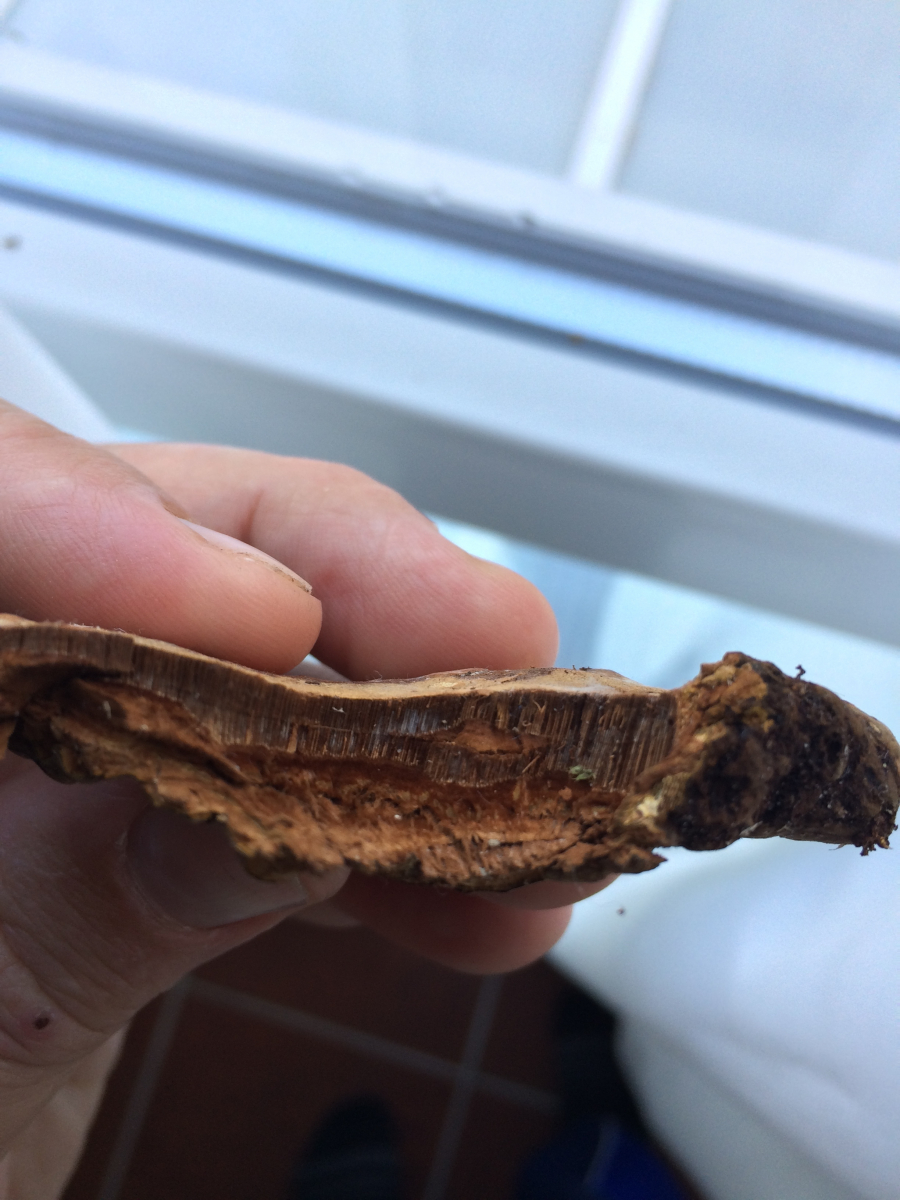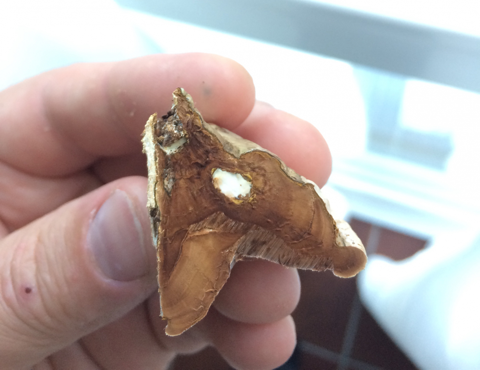 Als ich den Pilz gefunden habe war daneben noch so einer, der viel kleinerer war, und innen hat er genau so überall weiße Stellen gehabt, aber nicht so viel wie bei dem älteren.Und er war auch so eher hart und holzig. Und nach dem Kochen war das Trama nicht so gummiartig(wenn man die Stücke auseinander zieht) wie es normalerweise beim echten Zunderschwamm der Fall ist.