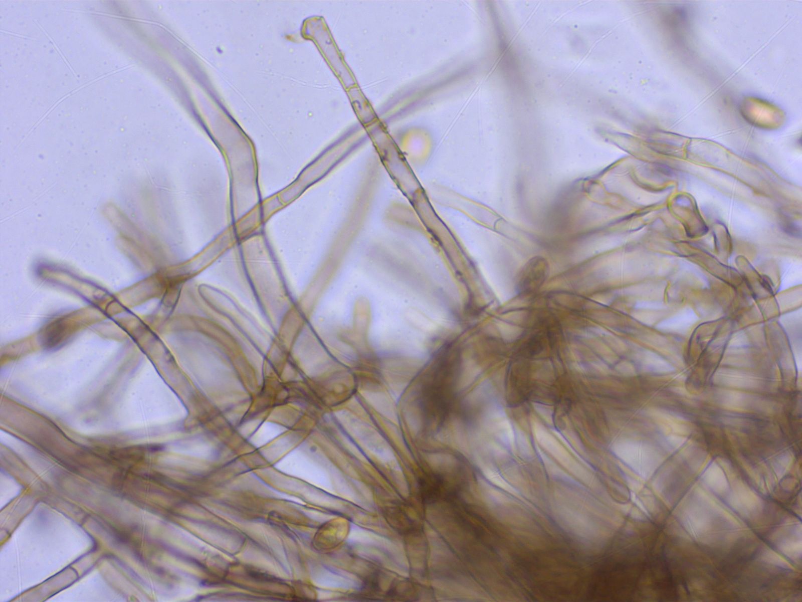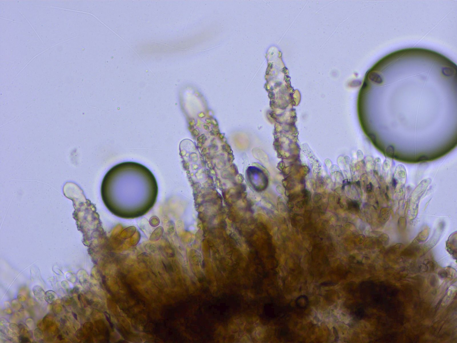 Das braune Stielfleisch, die Sporenmasse und natürlich die Makrozystiden passen gut dazu.