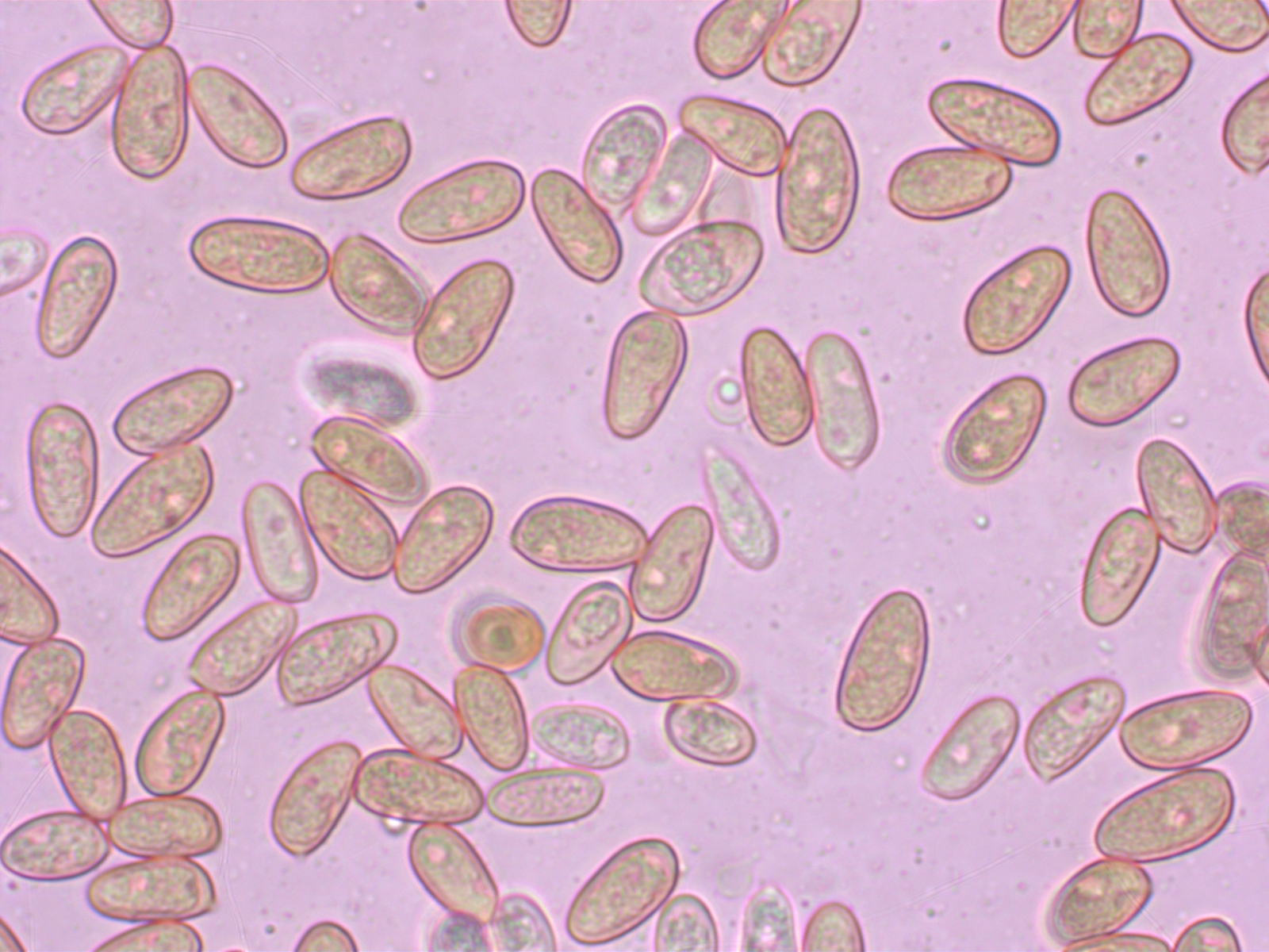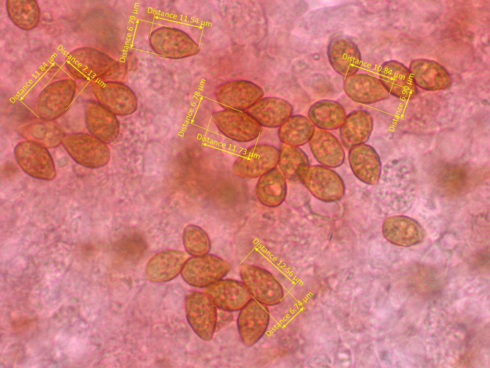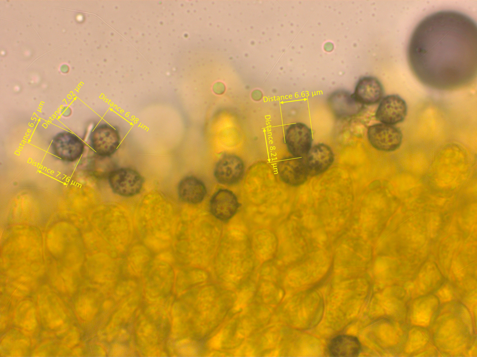 Alles anzeigenBei den Sporenmaßen gehe ich schon immer noch eher "pragmatisch" vor. Ich bilde mir halt ein, wenn man da 50 Stück im Bild hat, bekommt ja schnell einen Eindruck, was da die durchschnittliche Größe ist und dann prüfe ich 2-3mal die häufigste Größe (da täuscht mich mein Auge dann auch nicht, die sind dann auch gleich groß) und mal noch ne größere und ne kleinere, dann hat man ja so eine Range. Sollten einzelne erheblich kleinere Sporen zu sehen sein spare ich die eher aus, weil ich mich frage, ob die dann schlicht nicht reif sind. Also mein subjektiver Eindruck ist, dass ich da schon einen guten Mittelwert bekomme.