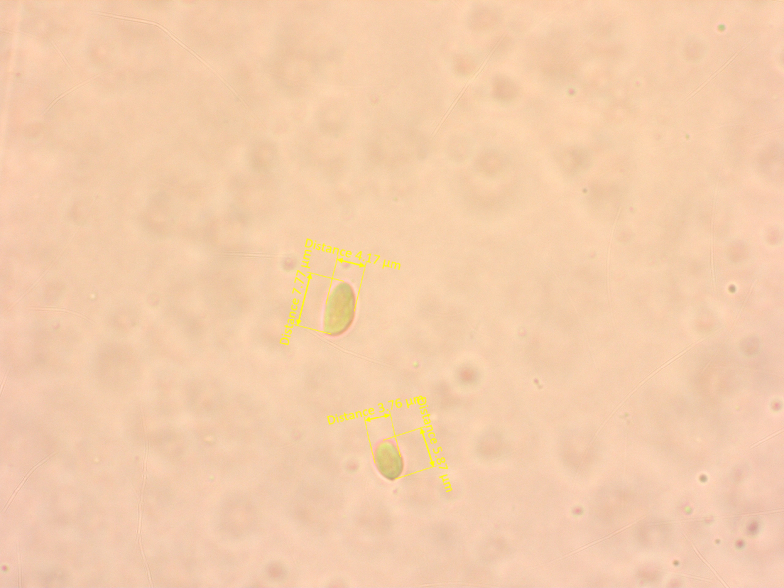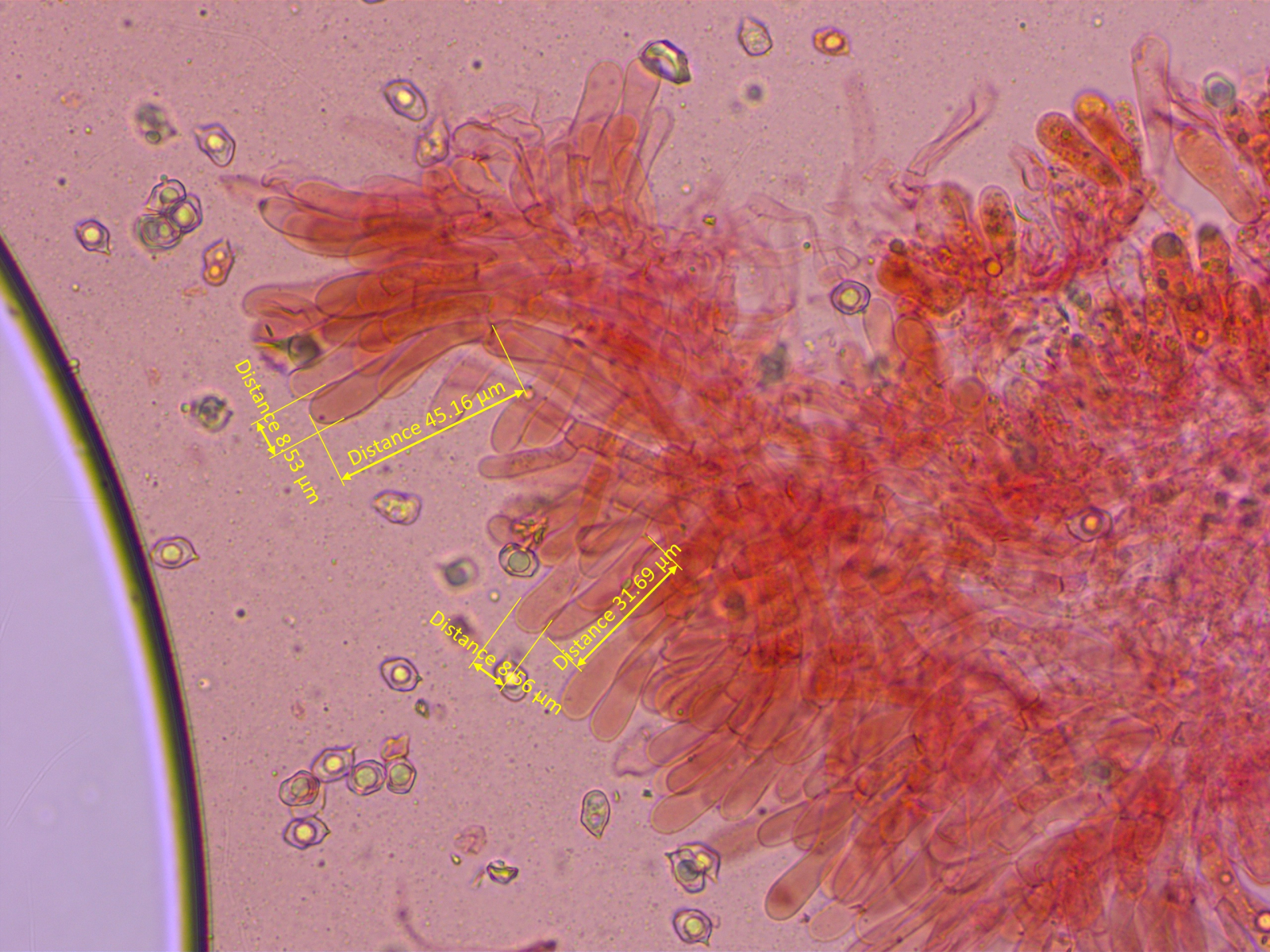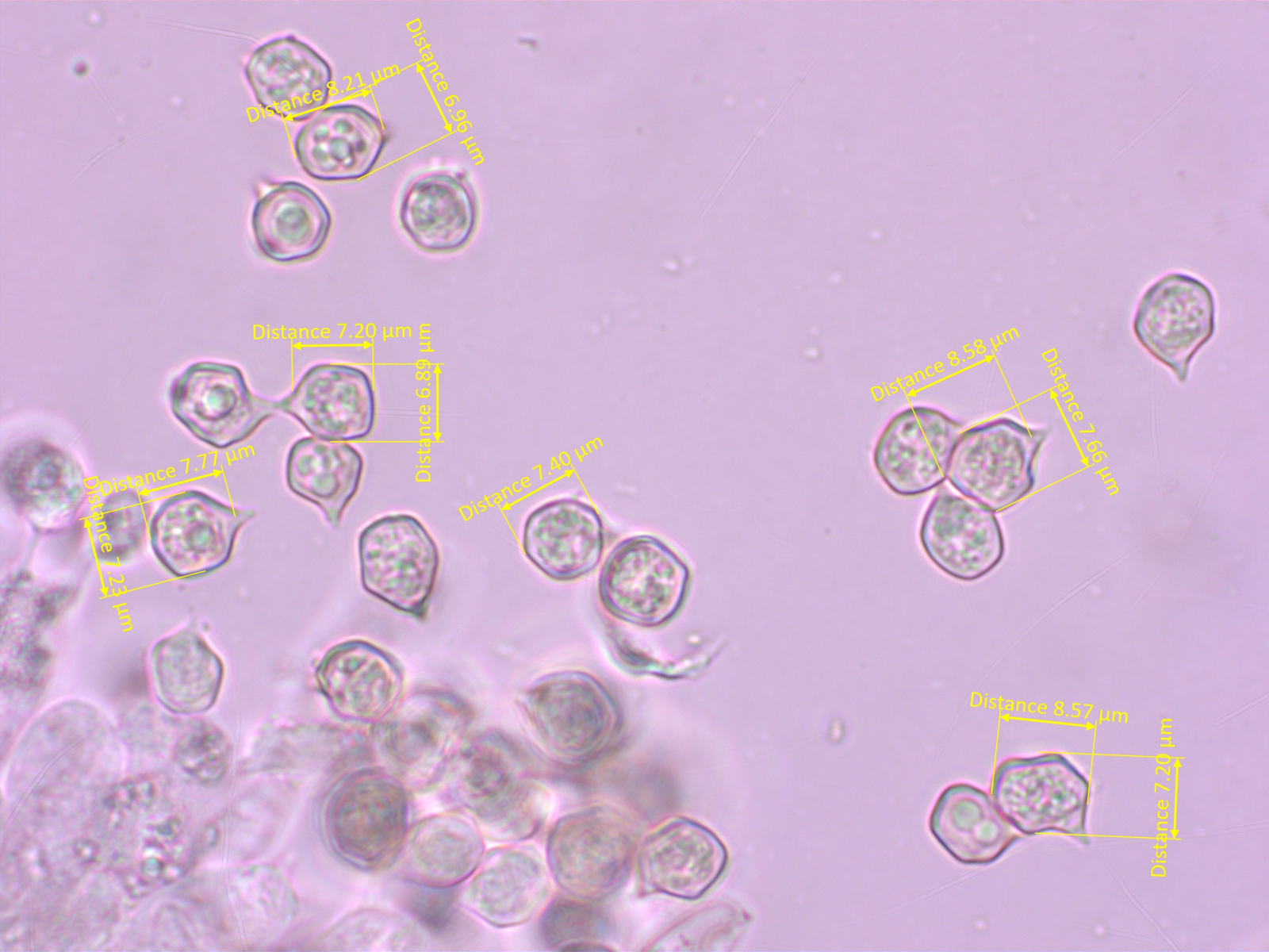 Alles anzeigenBei den Sporenmaßen gehe ich schon immer noch eher "pragmatisch" vor. Ich bilde mir halt ein, wenn man da 50 Stück im Bild hat, bekommt ja schnell einen Eindruck, was da die durchschnittliche Größe ist und dann prüfe ich 2-3mal die häufigste Größe (da täuscht mich mein Auge dann auch nicht, die sind dann auch gleich groß) und mal noch ne größere und ne kleinere, dann hat man ja so eine Range. Sollten einzelne erheblich kleinere Sporen zu sehen sein spare ich die eher aus, weil ich mich frage, ob die dann schlicht nicht reif sind. Also mein subjektiver Eindruck ist, dass ich da schon einen guten Mittelwert bekomme.