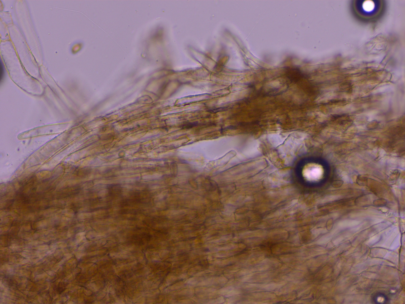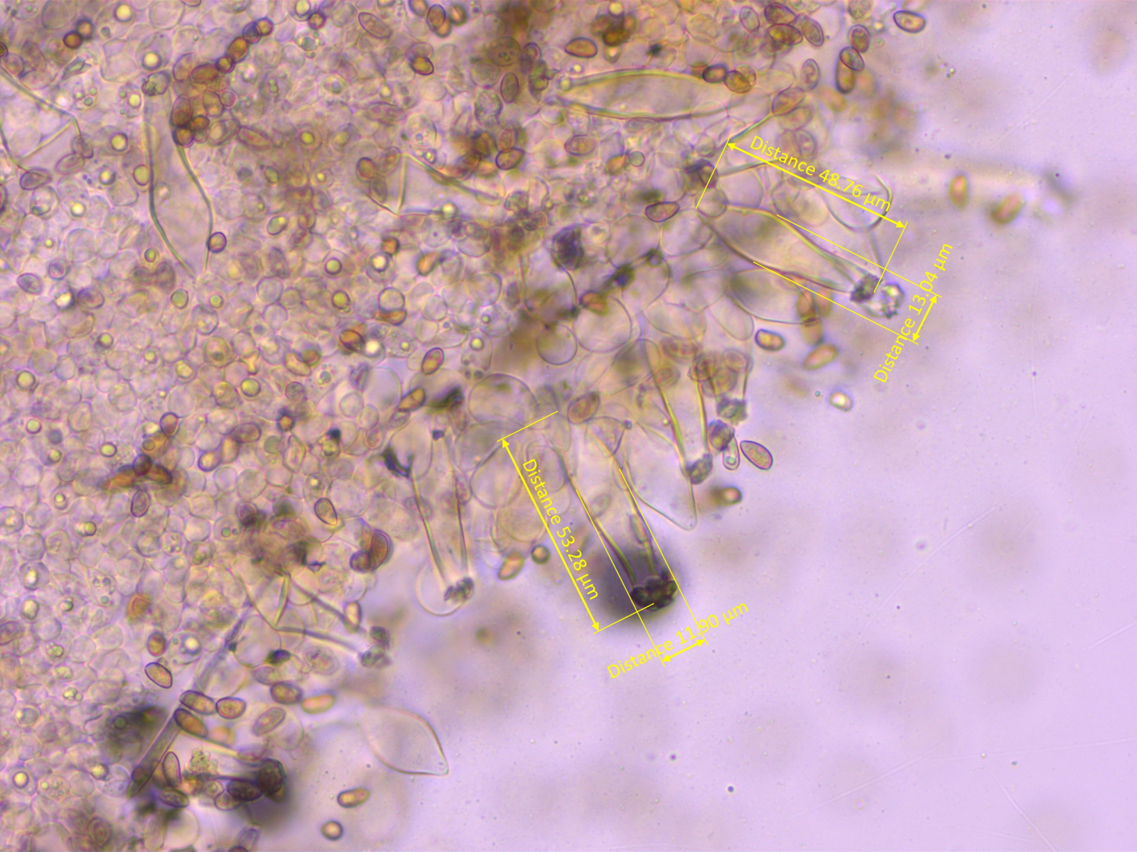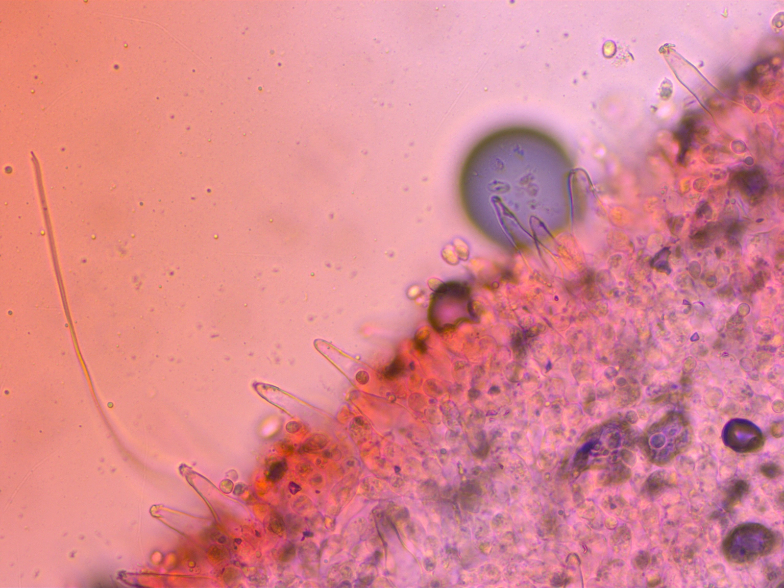 - Zystiden recht zahlreich aber schwierig zu entdecken, fast haarförmig, teilweise mit Auswüchsen
