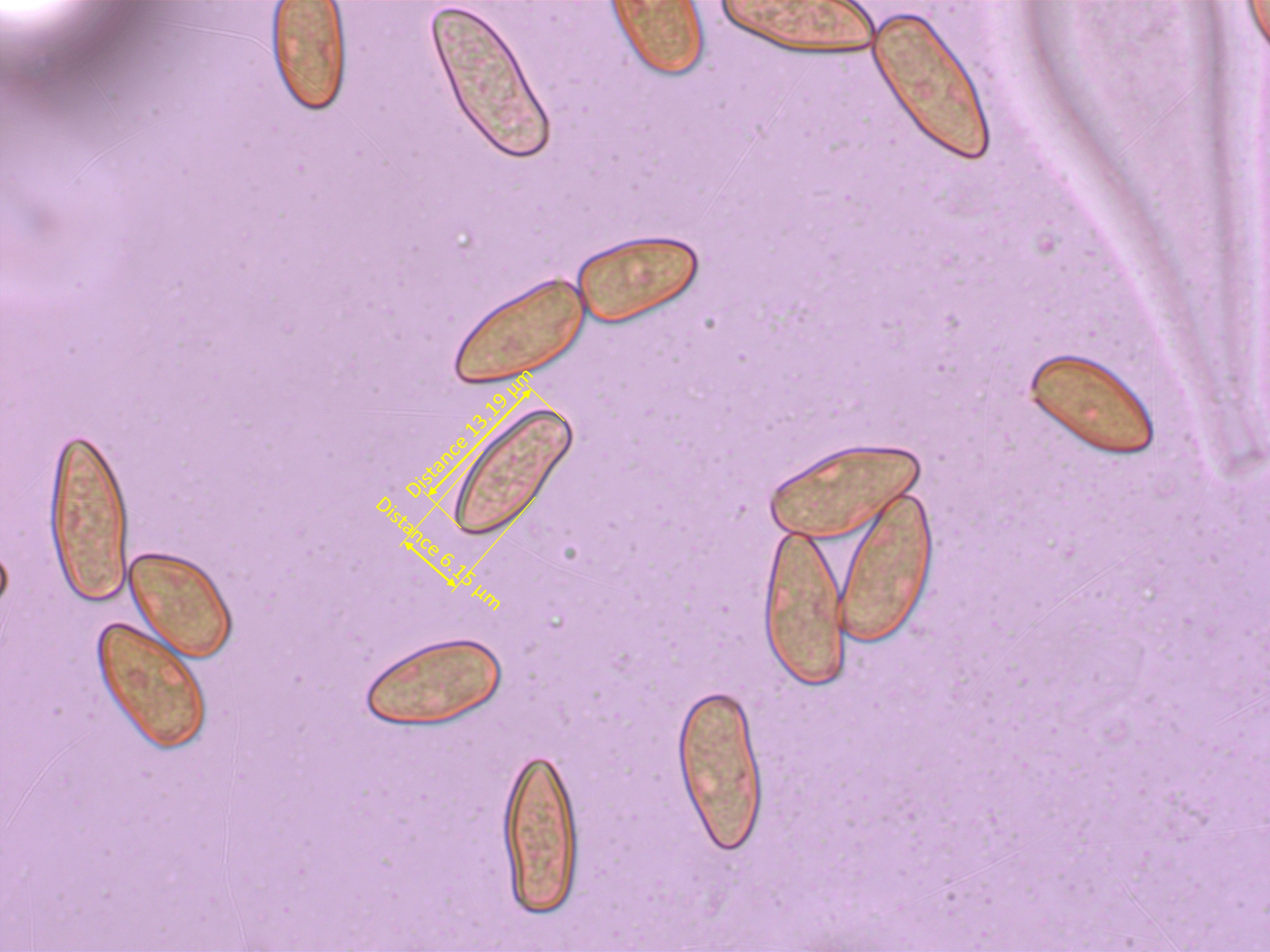 - Sporenmasse: 10.8-12.3 (13) x 4.5-5.3 µm, Avg 11.6 x 4.9, Q = 2.2-2.6, QAvg = 2.37