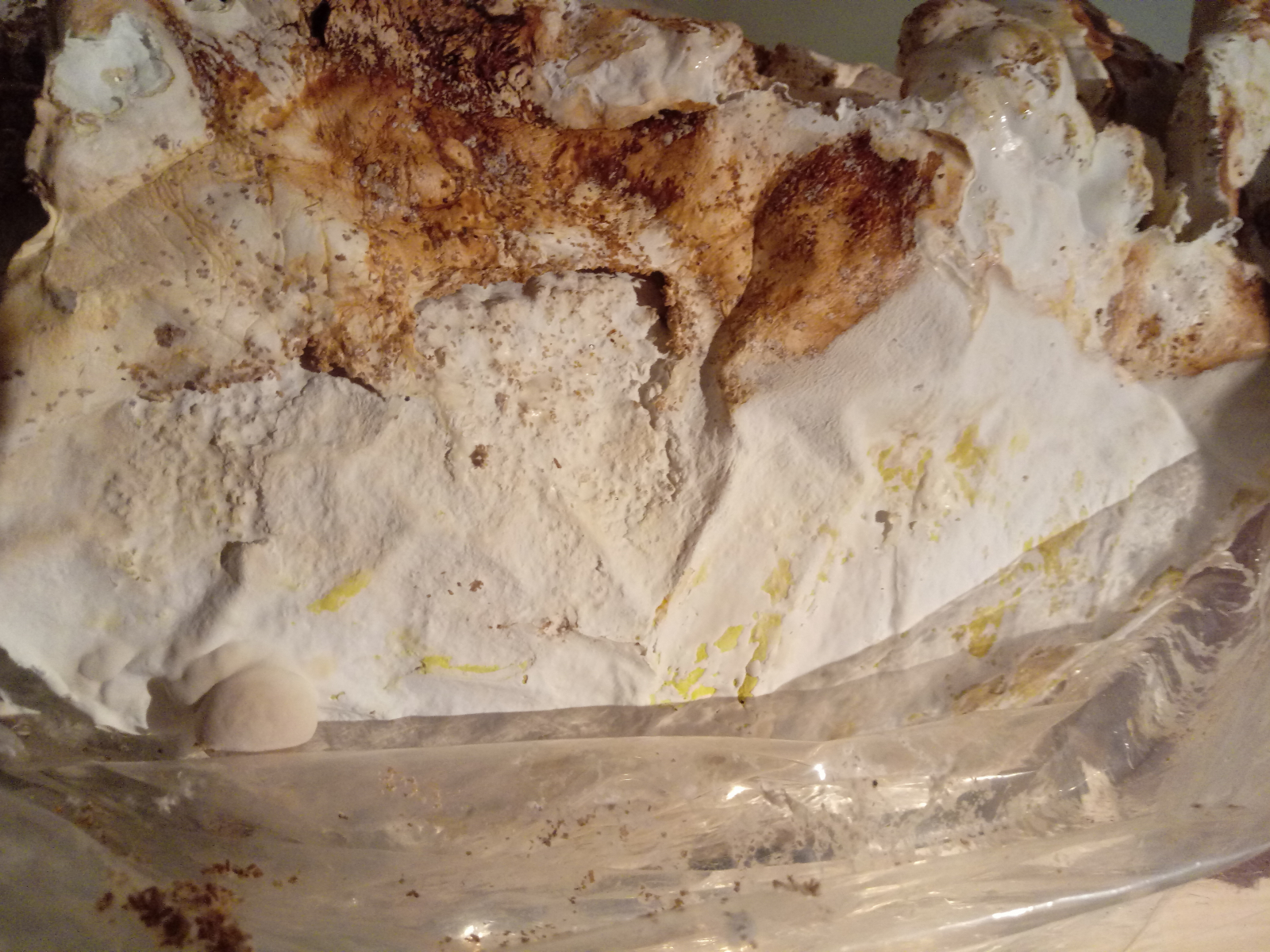Habe mir mal einen Substratblock vom Reishi gegönnt und soweit ging alles gut...Ich war anfangs etwas verunsichert,ob diese zottigen Vortsätze oben normal sind,aber das ist wohl so....Er hat auch schön dichtes Myzel nachgebildet,doch jetzt bekommt er gelbe Flecken! Weiss jemand ob das so original ist,oder ob da ein fieser Schimmel wächst? Er gedeiht eigentlich ganz gut und bekommt auch schon erste "Fruchtbeulen" ....Danke!!!!