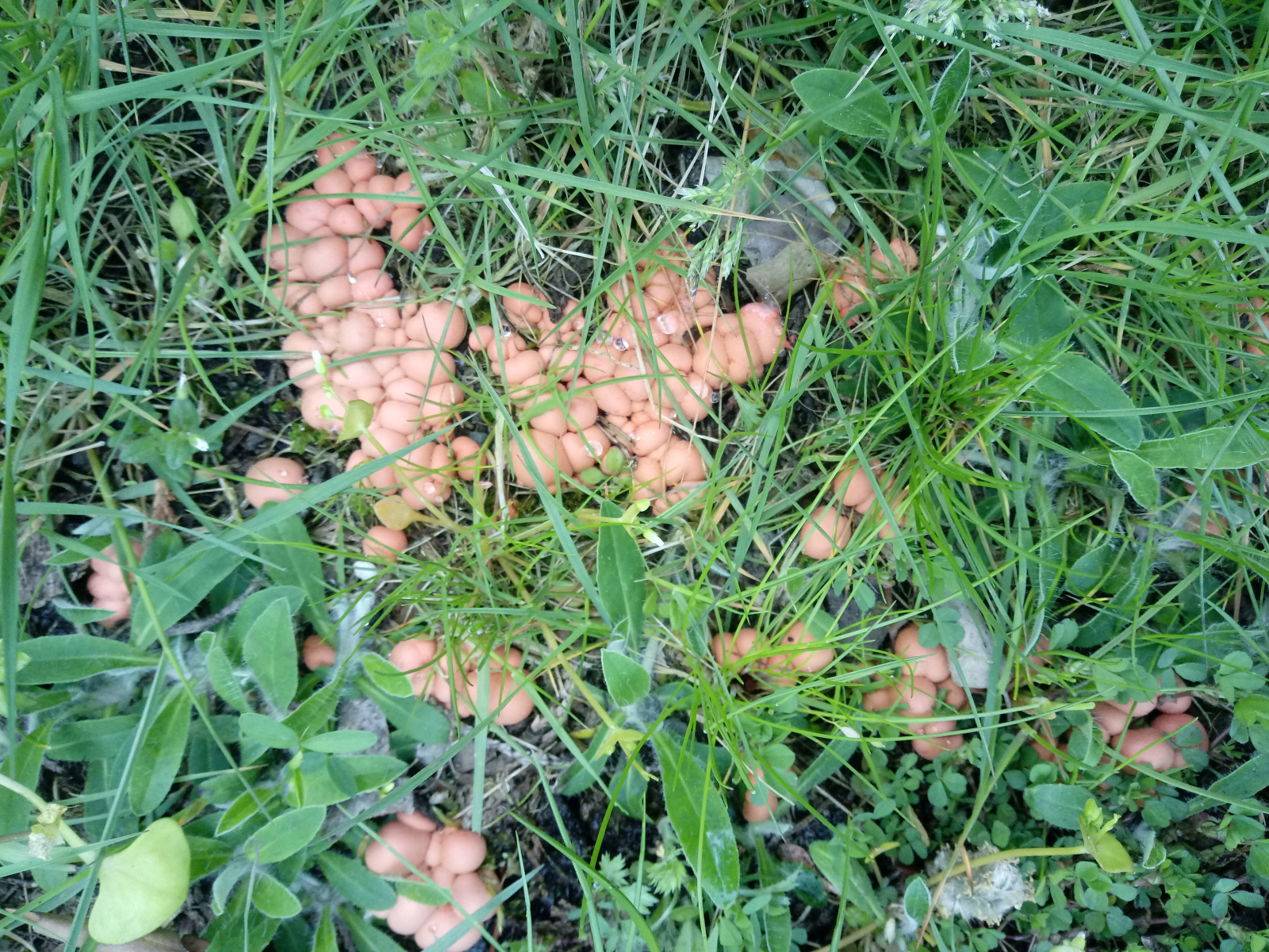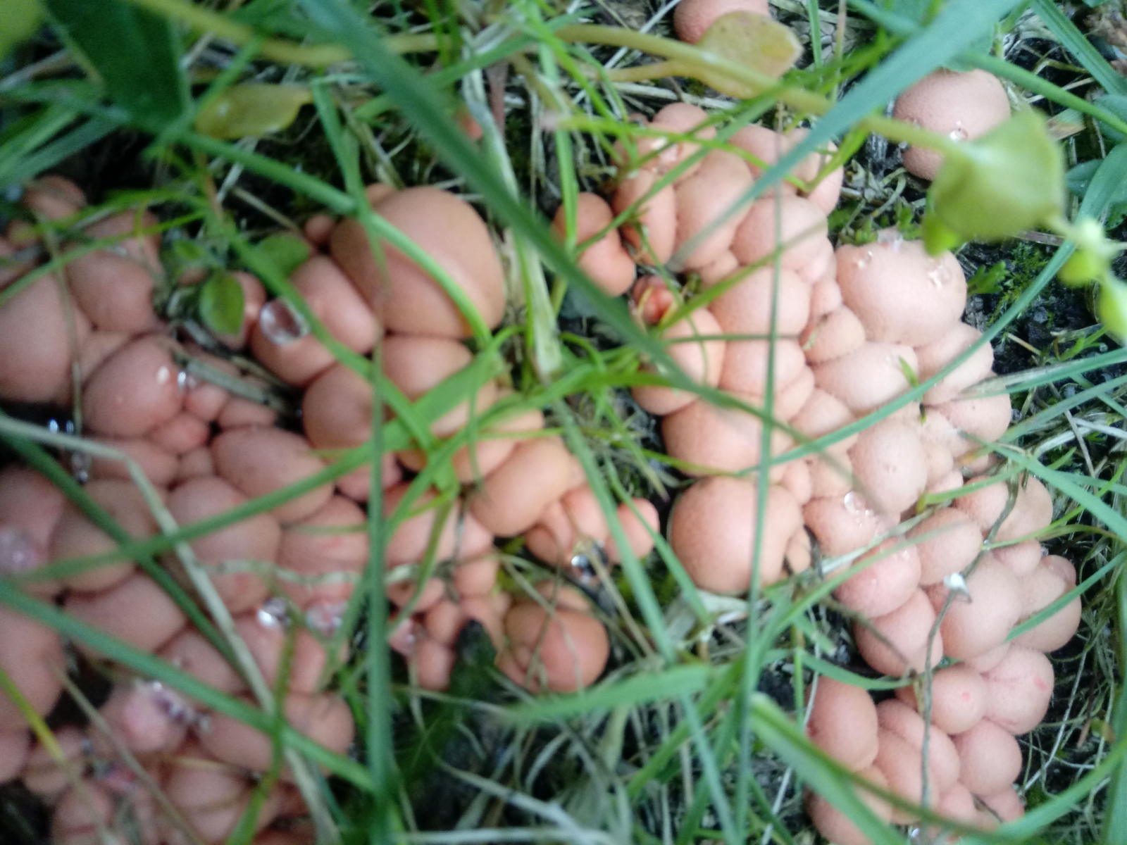 Habe eben im Garten diese seltsamen Kollegen entdeckt. Es sind tatsächlich wabbelige Kugeln, ohne Stiel und Hut. Wachsen also wie Blasen aus dem Boden...![]()