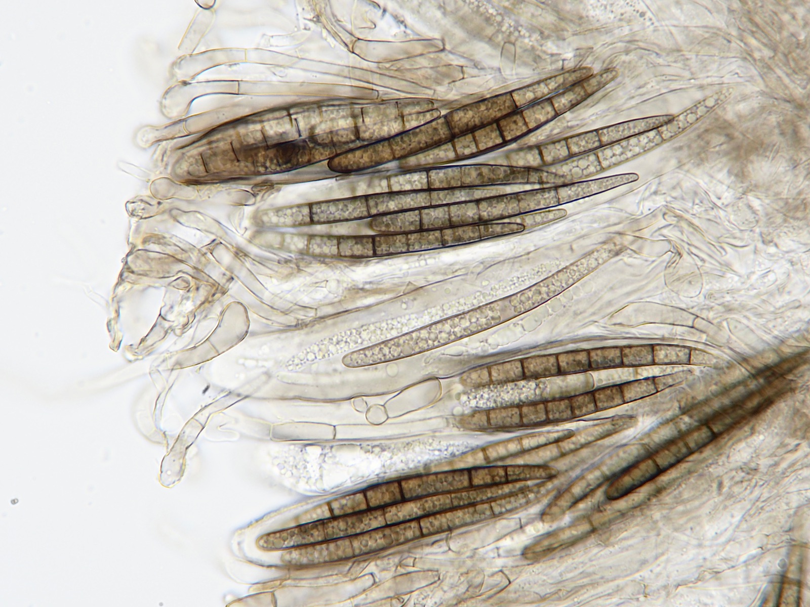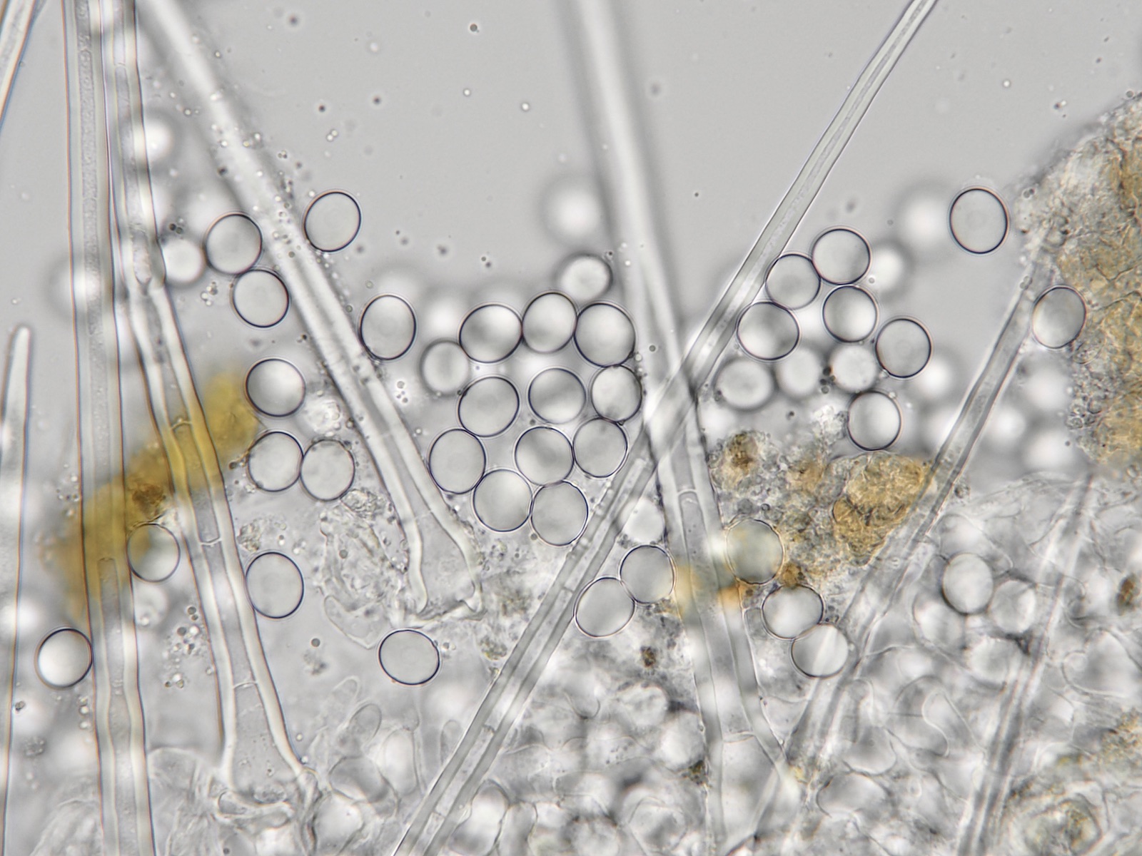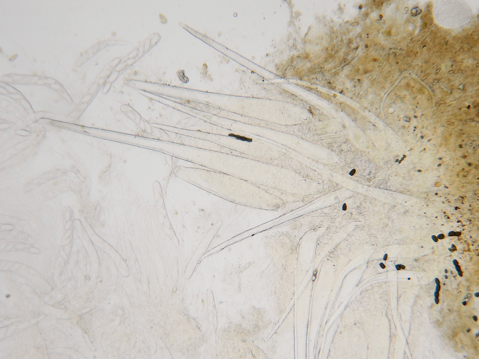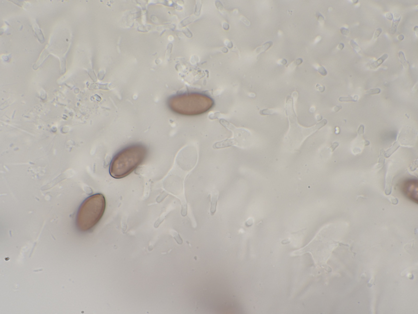 Deconica subcoprophila passt nicht, weil die Cheilozystiden auch nicht gegabelt sind und weil die Sporen bis zu 20 (22) Mikrometer lang sein sollen. Ich habe sehr viele Sporen gemessen und alle waren um 14 Mikrometer.
