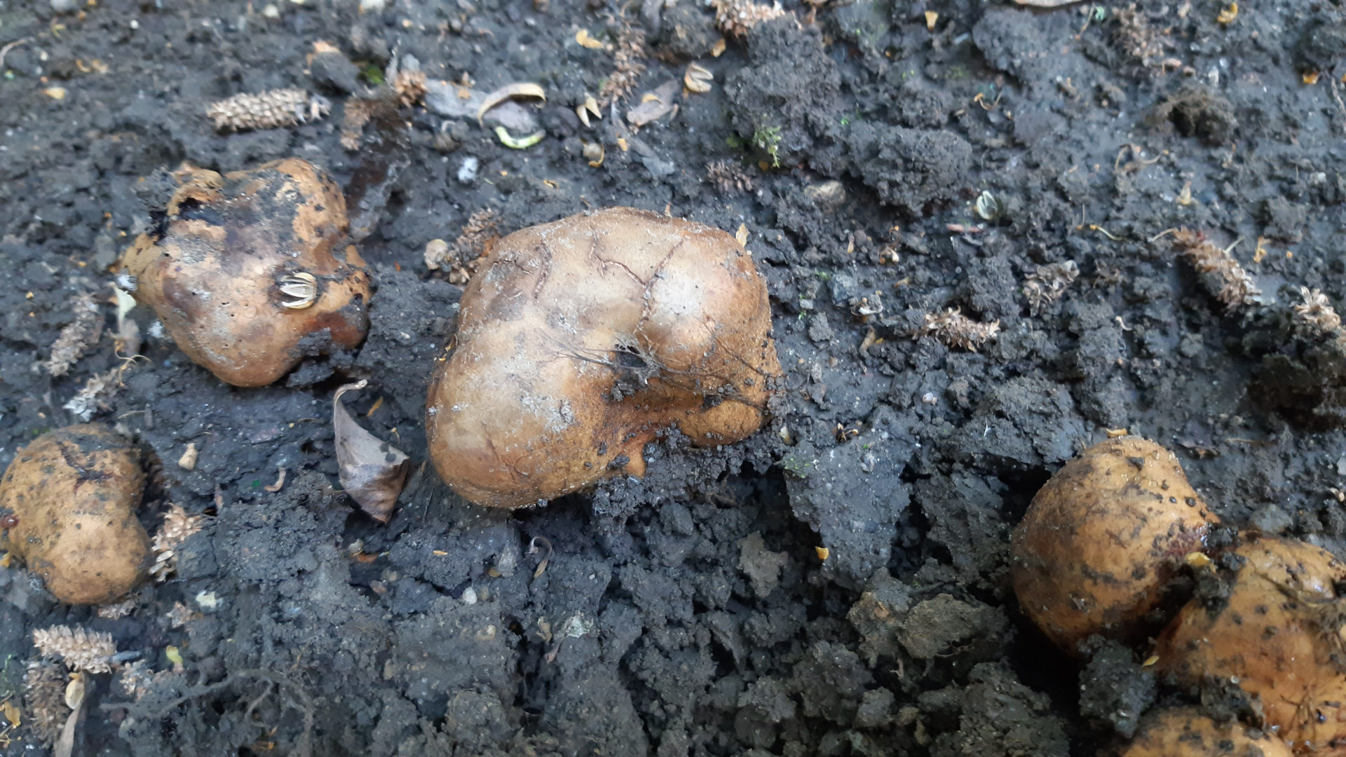 ich habe bei der Gartenarbeit im Vorgarten Pilze gefunden. Diese sind gelblich/hellbraun und innen fast schwar mit Punkten. Sie wachsen unter der Erde und die Größeren haben die Erde dann aufgebrochen und sind sichtbar. Kann mir jemand sagen was das ist? Und ob die giftig sind?