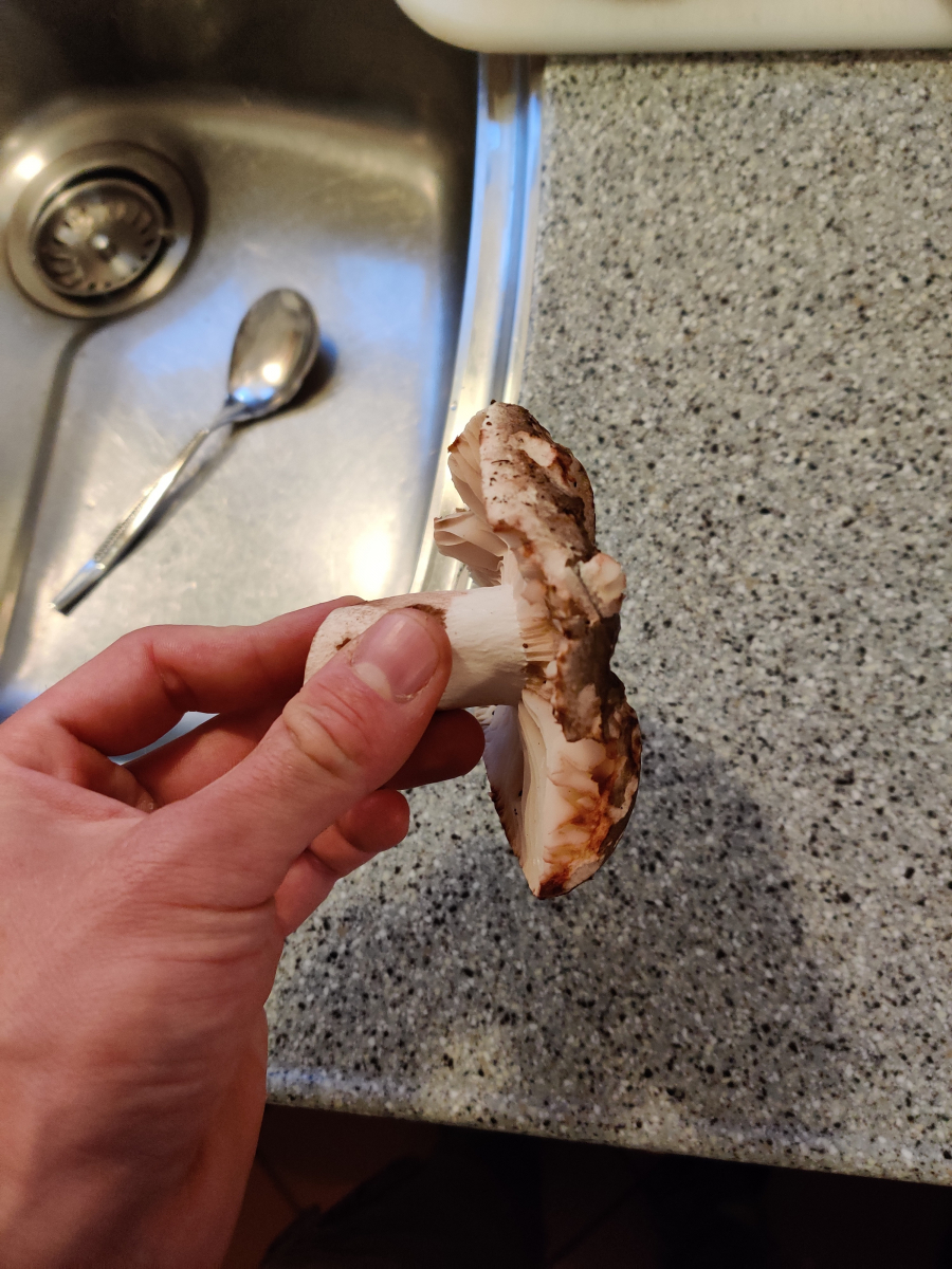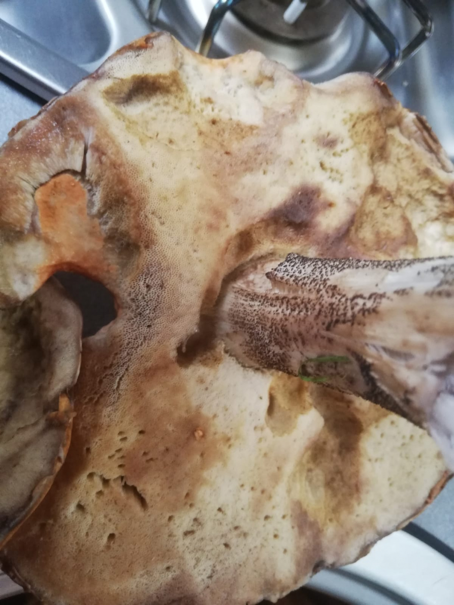 ich habe die Pilze durchgeschnitten aber Gelb wird da nichts und der Geruch ist normal Pilzig.