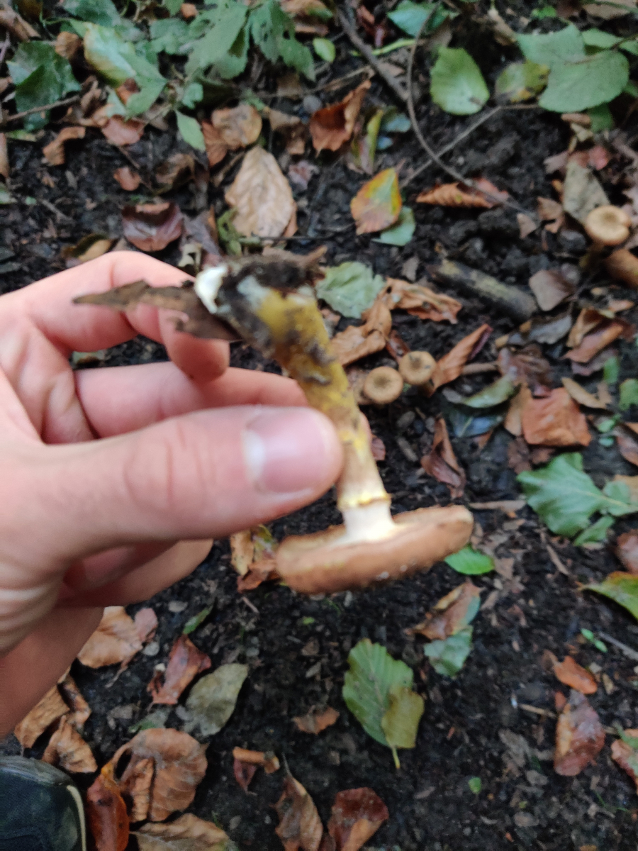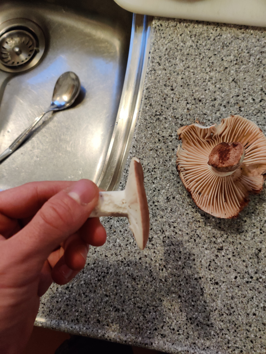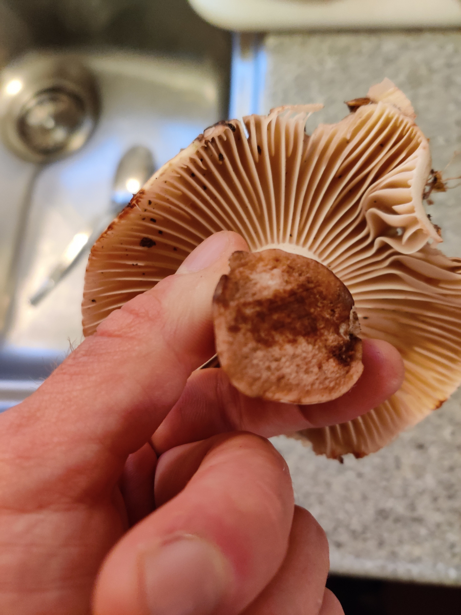 der Pilz wuchs zwischen Berg-Ahorn, einer Eiche und einer alten Tanne. Der Geruch ist, wie ich finde, leicht "Kartoffelartig?". Er erinnert mich stark an einen Reizker, mit dem eingerollten Hutrand. Der Stiel fühlt sich hohl an. Die Lamellen sind weiß bis Cremfarbend. Auf dem Hut sind leicht angedeutet Orange-Braune Flecken.