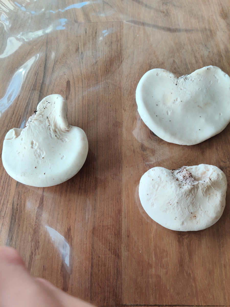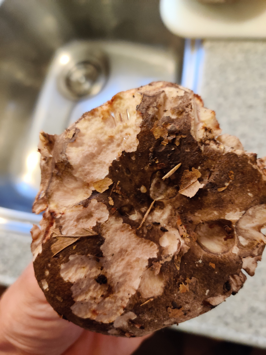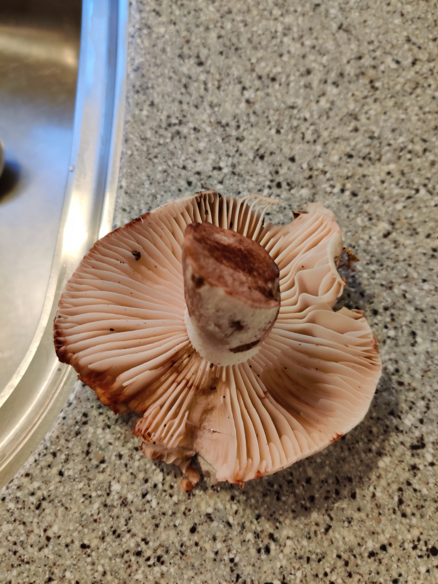 der Pilz wuchs zwischen Berg-Ahorn, einer Eiche und einer alten Tanne. Der Geruch ist, wie ich finde, leicht "Kartoffelartig?". Er erinnert mich stark an einen Reizker, mit dem eingerollten Hutrand. Der Stiel fühlt sich hohl an. Die Lamellen sind weiß bis Cremfarbend. Auf dem Hut sind leicht angedeutet Orange-Braune Flecken.