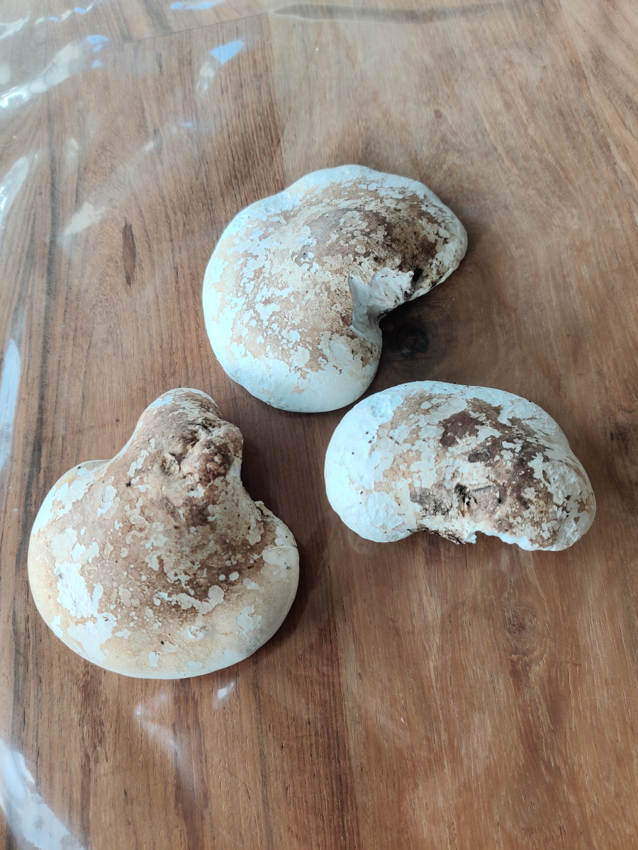 die Pilzen wuchsen direkt an einer alten Buche. Sie riechen pilzig. Im ersten Moment, dachte ich sie hätten Röhren aber wenn man genauer hinsieht, sieht man, dass unter einer gelben dünnen Haut braune Lamellen sind.