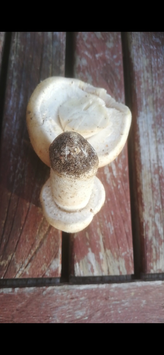 Ist bei Leucopaxillus giganteus oft schächer ausgeprägt als bei anderen Arten der Gattung, aber normalerweise doch gut makroskopisch erkennbar (unten links):