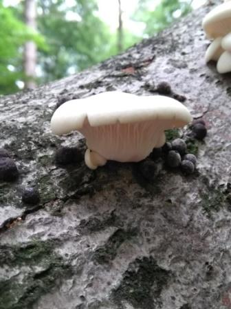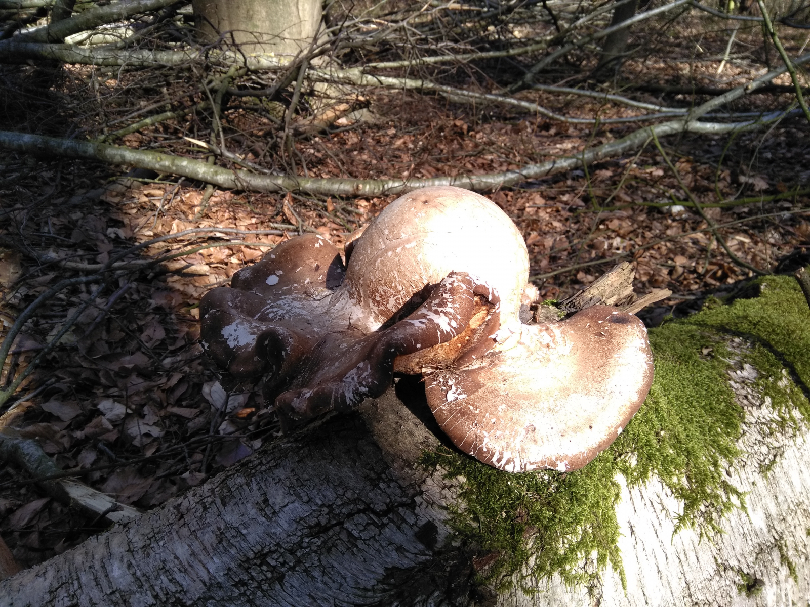 Und es scheint kein Ende zu nehmen. Man sieht auf einigen Bildern schon alte, zerfallene Exemplare. Die waren am Mittwoch letzter Woche noch so klein, dass ich sie damals habe stehen gelassen. Und überall brechen neue Fruchtkörper durch die Rinde. Aufgefallen ist mir zum Abschluss noch, dass einige FK, die oben auf den Stämmen wuchsen, nahezu zentral gestielt waren.