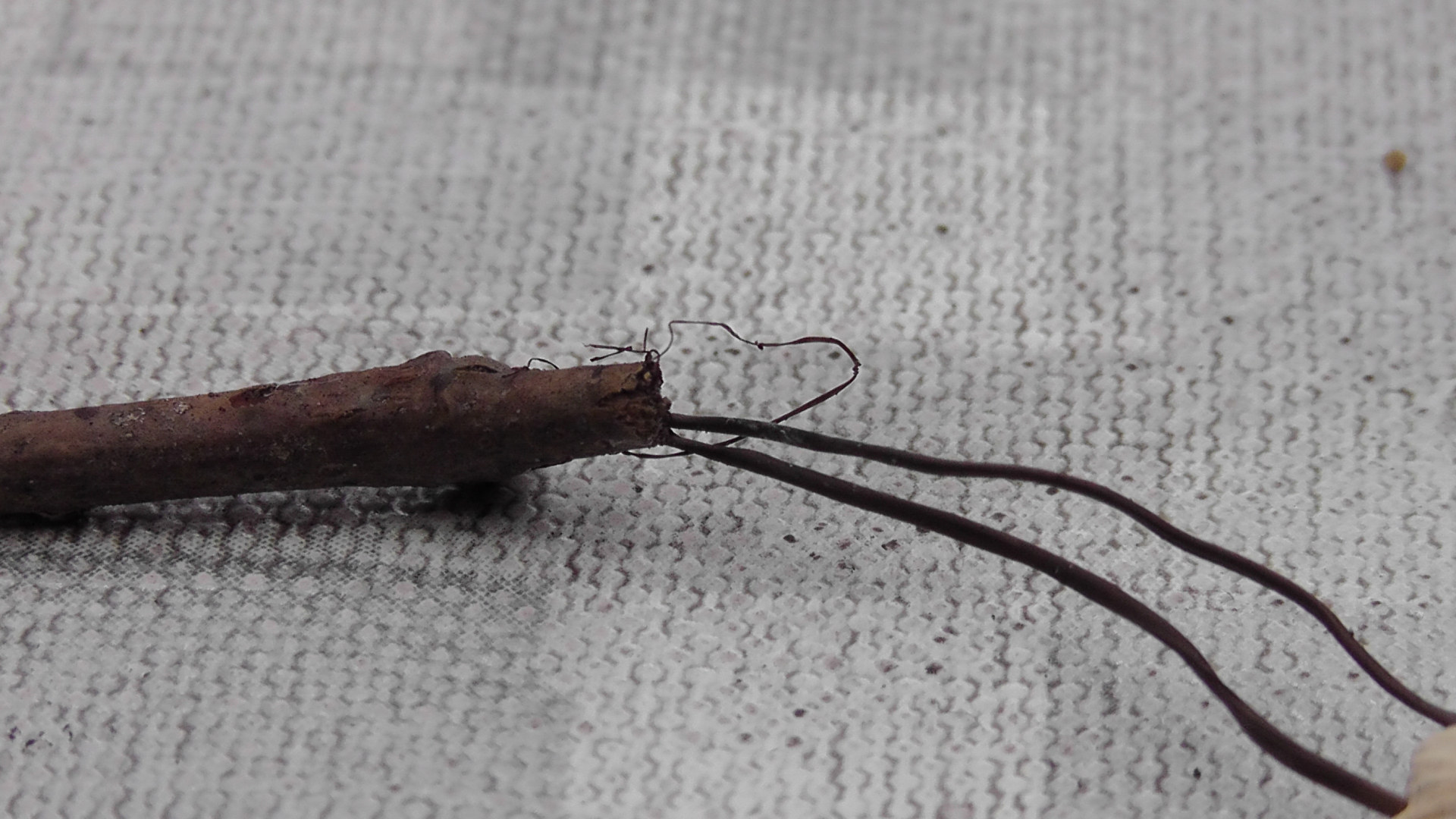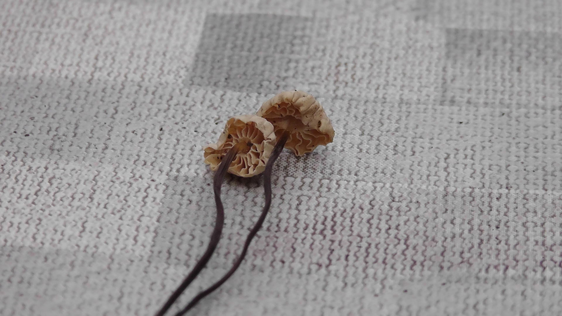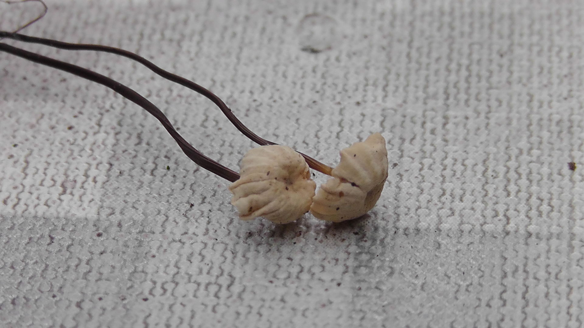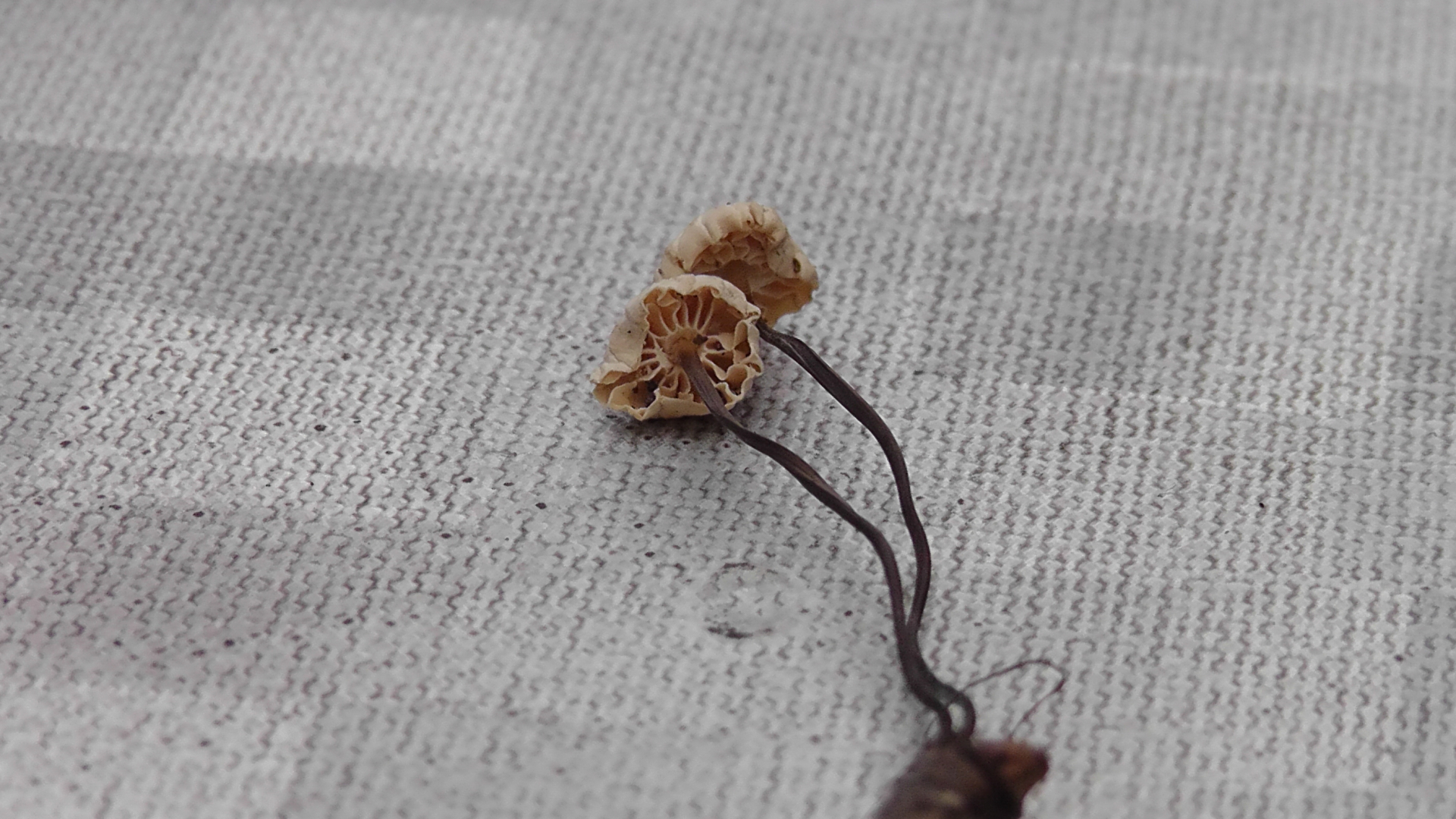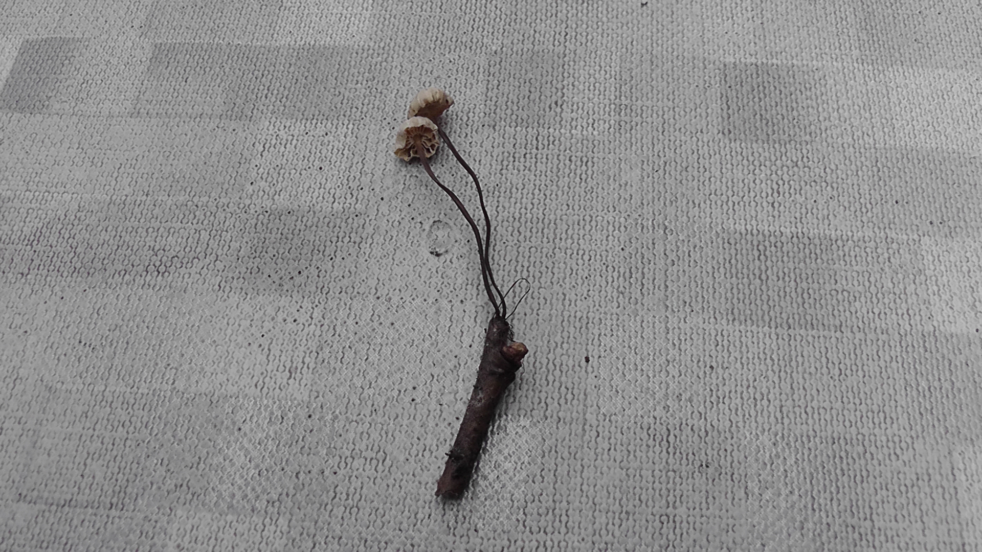 Ich war gestern mal wieder in meinem Hauswald. Obwohl es in den letzten Tagen immer mal wieder geregnet hat, zum Teil auch heftiger, ist der Wald praktisch Pilz-frei. Stellenweise ist der Boden noch knochentrocken, an einigen Stellen aber gut feucht. Es gab einen schönen Schwefelporling, der noch durchaus appetitlich rüberkam, immer noch ein paar frische Lungenseitlinge, die aber schon deutlich Leben in sich hatten, und dann diese kleinen Freunde mit offensichtlichem Trockenschaden. Winzige Pilzlein, Höhe ca. 3cm, Hutdurchmesser <1cm, Stiel komplett schwarz und dünn wie ein Faden. Das gezeigte Pärchen wuchs aus einem kleinen Aststück, vermutlich Buche. Umgebende Bäume: Laubmischwald. Völlig geruchlos. Sezierversuche habe ich in Ermangelung passender Mikro-Schneidwerkzeuge gespart.
