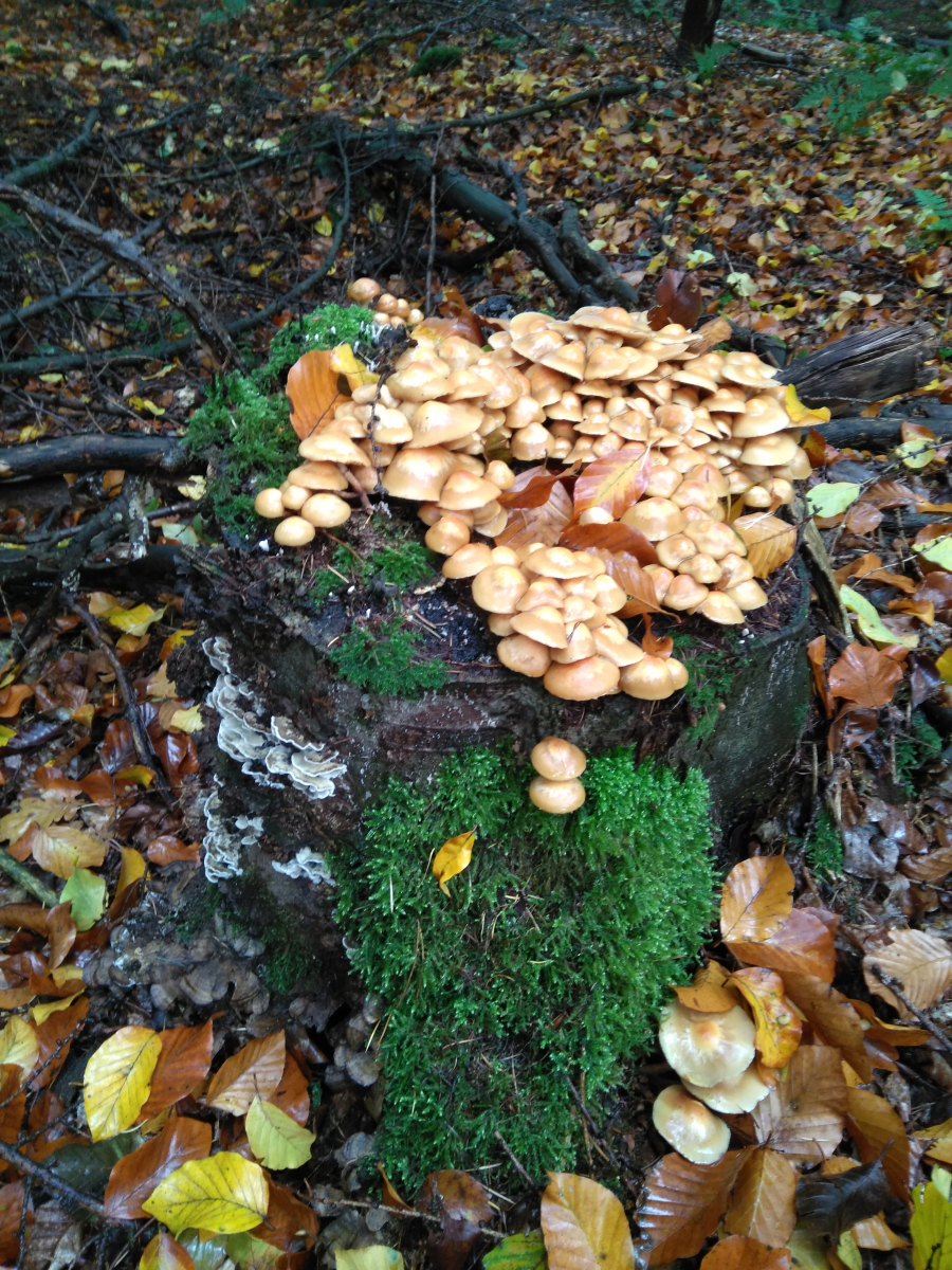 nach längerer Abstinenz hier im Forum mal wieder eine Anfrage von mir. Vor einigen Tagen waren wir unterwegs auf "Glucken-Jagd" und kamen dabei durch ein Stück Mischwald. Wie wohl überall zu der Zeit leuchtete es von nahezu jedem Baumstubben neon-gelb, der Grünblättrige Schwefelkopf dominiert das Pilz-Geschehen, zumindest in den Wäldern, in denen ich umherstreife. Nachdem ich im letzten Jahr vergeblich nach dem Stockschwämmchen gesucht habe, stieß ich unverhofft auf einen Stubben, der mal eine etwas andere Farbgebung aufwies. Bei näherer Betrachtung fand ich Pilze vor, die in ihren Merkmalen eigentlich zu 100% auf das Stockschwämmchen passen.