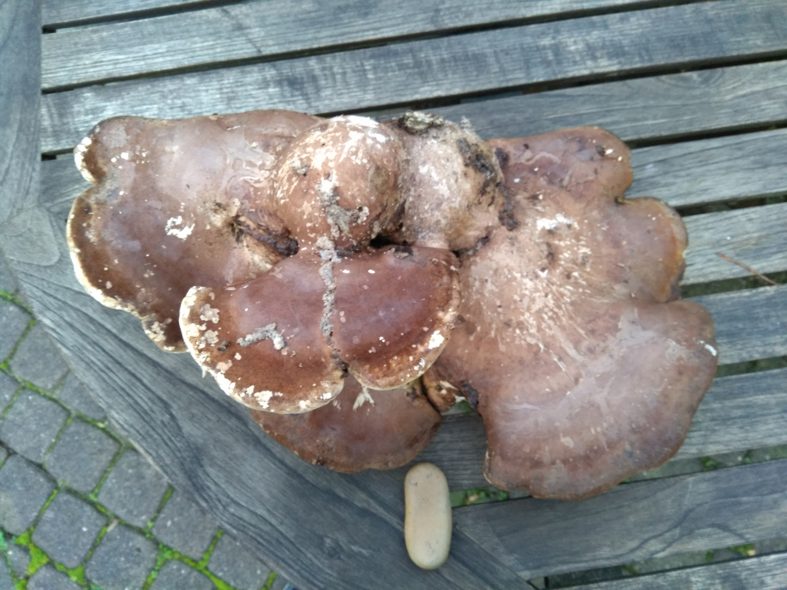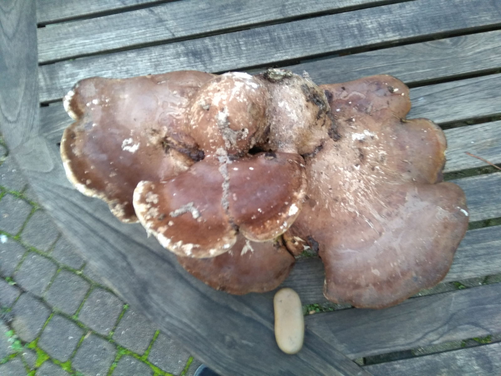 nach meinem Vorstellungs-Thread von gestern möchte ich Euch, wie dort schon "angedroht", um eine erste Bestimmungshilfe bitten. Ich kam bei diesem Pilz erst nicht so recht weiter, aber nach langer Recherche könnte ich mich für einen jungen Riesenporling erwärmen. Leider sind meine Angaben alles andere als vollständig, so wie es sein sollte. Es musste schnell gehen, Regen zog auf und die Familie war schon am quengeln ("Muss der denn bei jedem Sch..pilz stehen bleiben?" - Ja muss er...). Also, so gut es geht, auch aus der Erinnerung:
