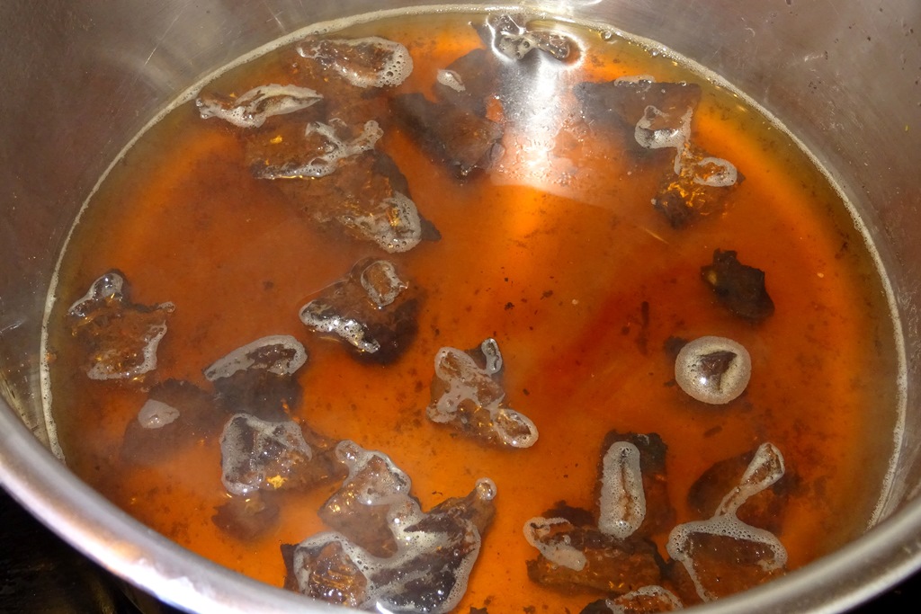 Auf 200 ml Wasser habe ich 5 Gramm getrockneten Chaga Pilz gegeben.