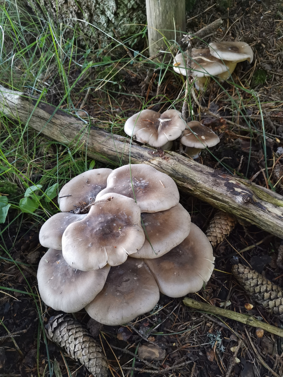 Heute habe ich direkt neben einem Baumstumpf eine Gruppe von drei Pilzen gefunden, wobei ich nicht sicher bin, ob die Pilze am Holz wuchsen.