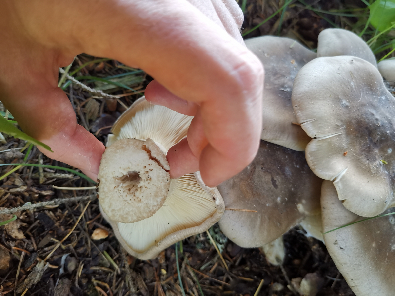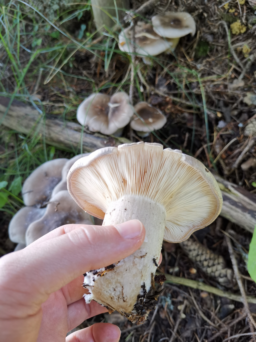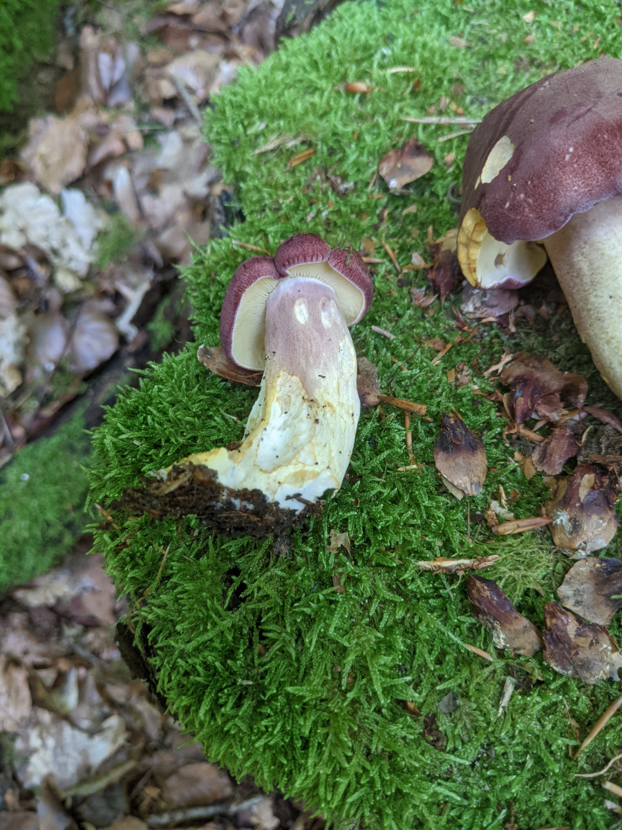 Wegen der Form und dem sehr festen Fleisch hatte ich Röhren erwartet, es waren jedoch Lamellenpilze. Die Bäume in der Umgebung waren Buchen und Kiefern evtl. auch Fichten.